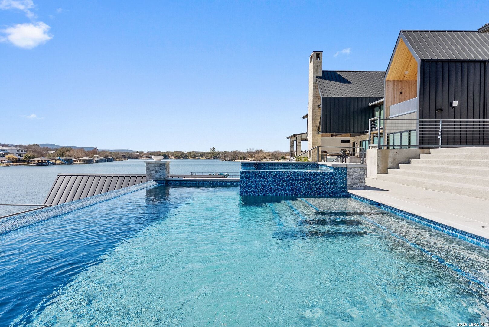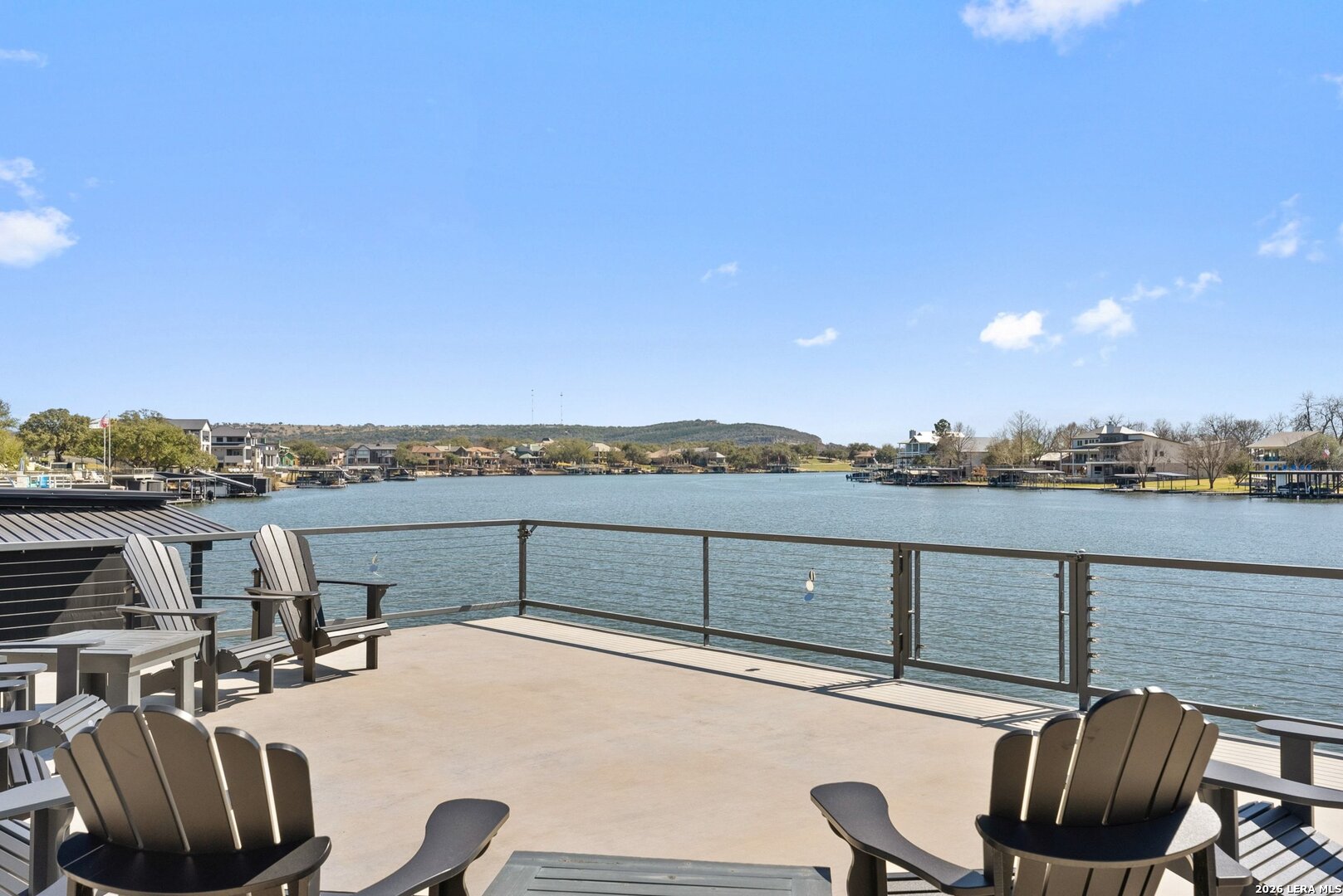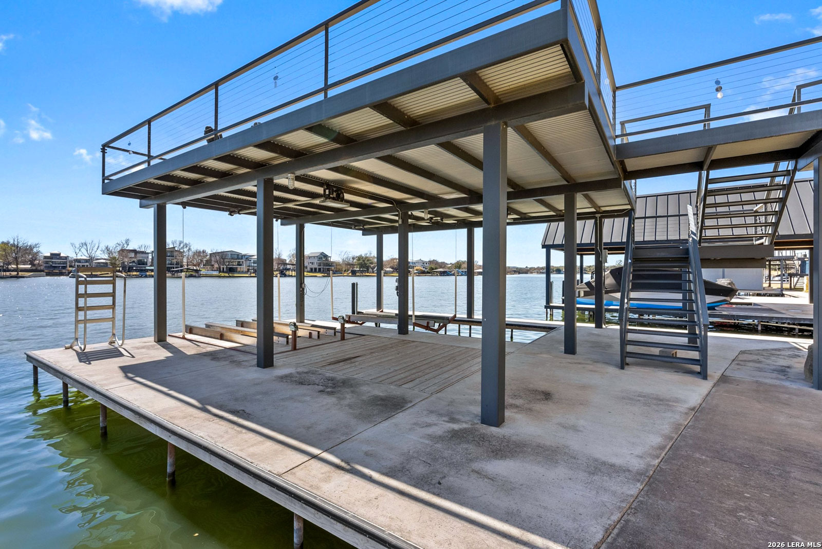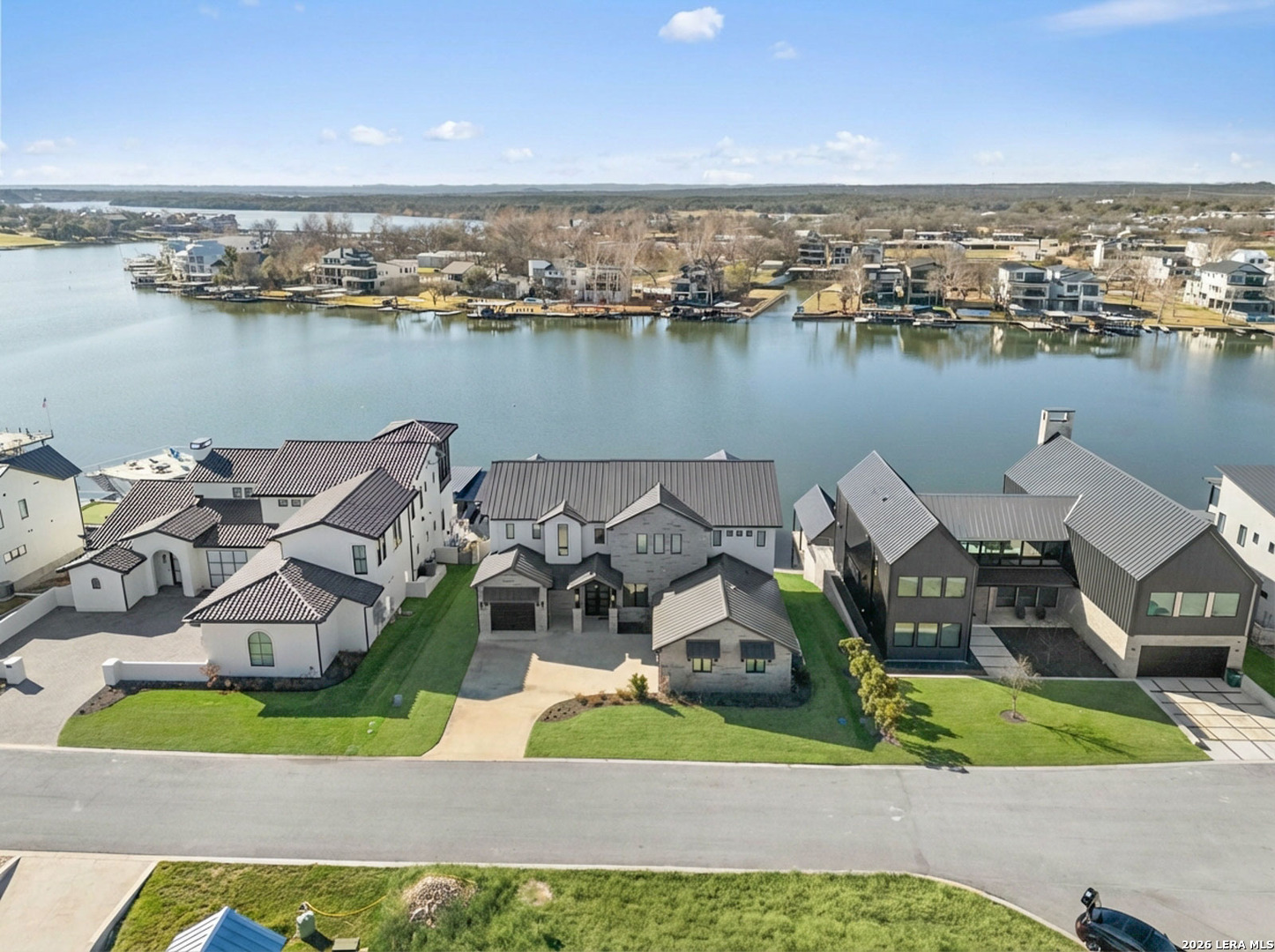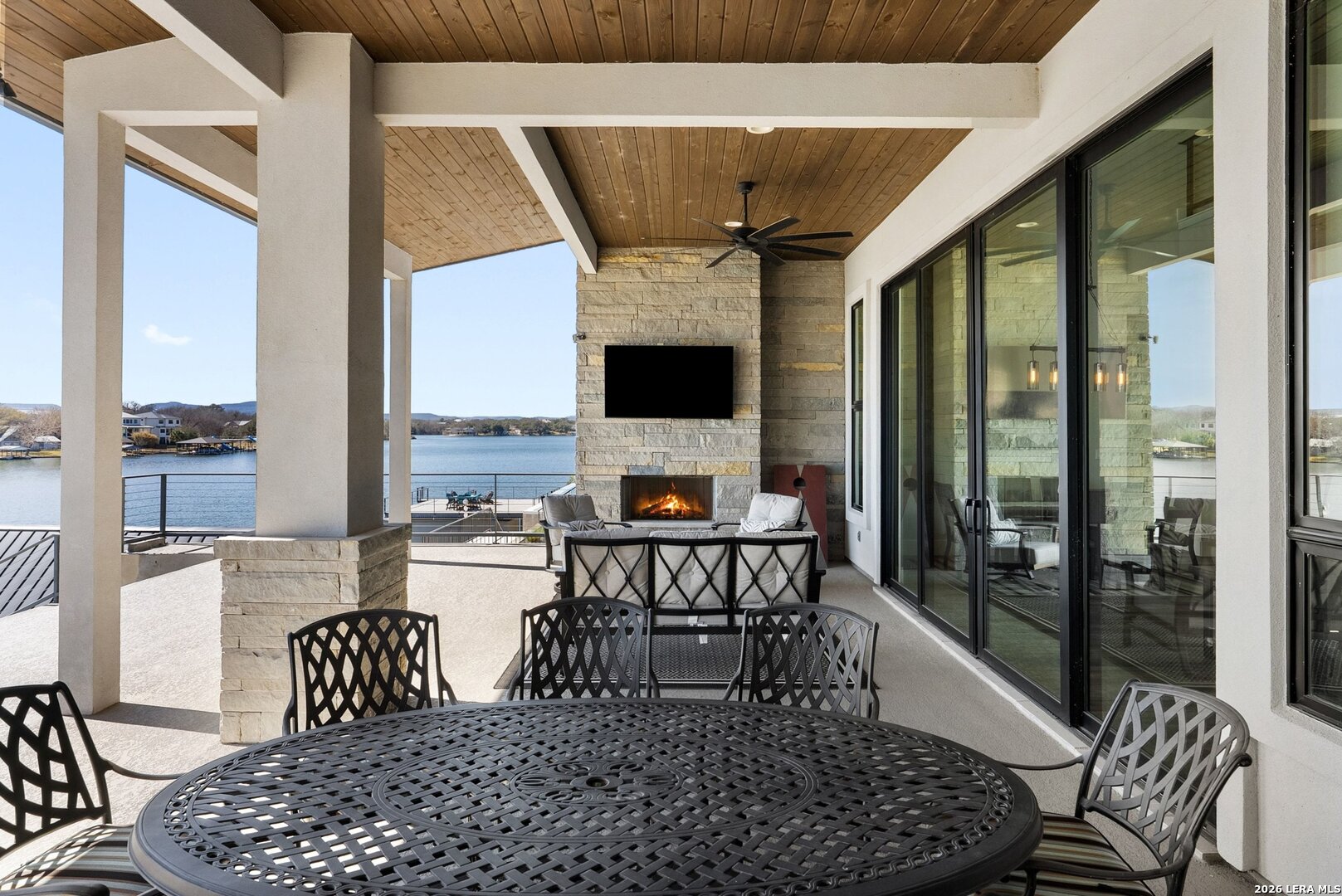 Stunning Lake LBJ waterfront. Nearly 5,000 square feet of lakefront living built for entertaining. Located inside the gated Legends community, this custom waterfront home delivers space, shoreline, and serious lake lifestyle. The oversized dock anchors the waterfront with a boat lift, double wave runner lift, wet-step ladders, and jumping gate for effortless lake access. An elevated entertaining deck above the lift creates the perfect spot to watch the action on the water. Outdoor living continues at the home with a large covered patio and full outdoor kitchen featuring a Coyote grill, gas fireplace, TV, and easy ramp access down to the dock. Inside, the open living area is framed by large windows overlooking Lake LBJ and connects seamlessly to a chef's kitchen equipped with JennAir appliances, 6-burner gas rangetop, oversized island, farmhouse sink, walk-in pantry, and abundant custom cabinetry. Two lakeview primary suites provide flexibility for owners and guests, each with spa-style baths featuring soaking tubs, large walk-in showers, and generous closets. Upstairs, a game room with balcony overlook and custom bunk beds creates the ultimate lake hangout. Pella windows, foam insulation, three zoned Trane HVAC systems, tankless water heaters, smart garage access, and a security system complete the home. Double-gated entry, golf course access, fiber internet, and underground utilities add to the appeal of this Lake LBJ waterfront retreat.
