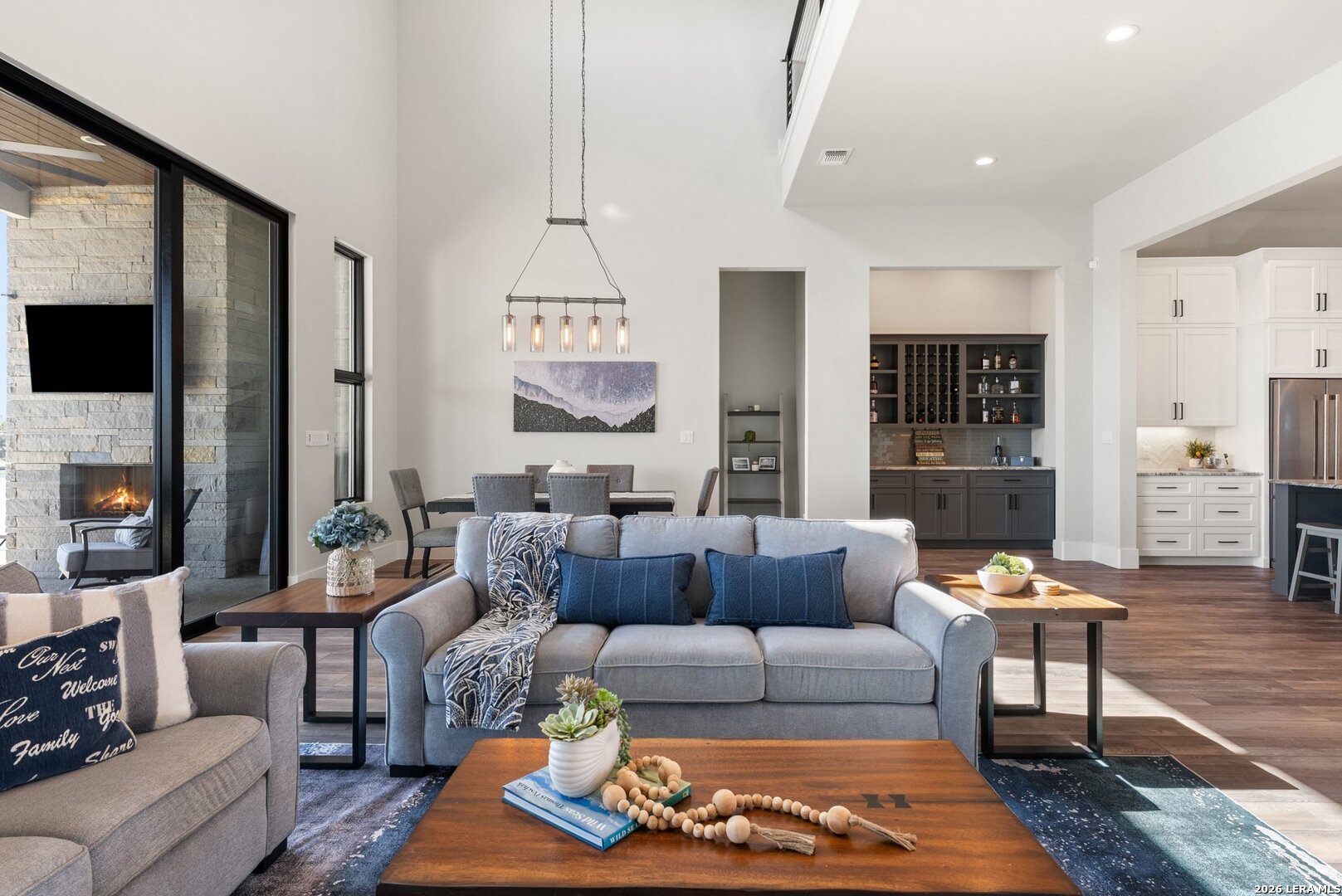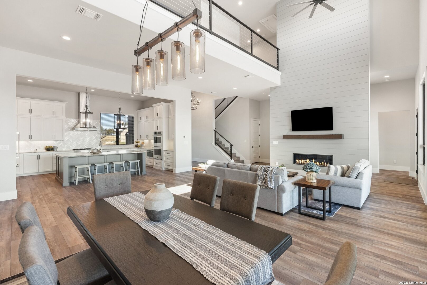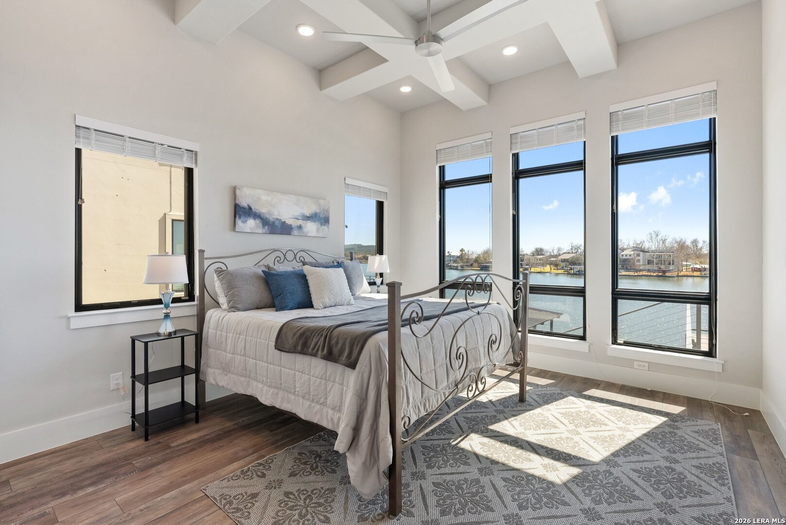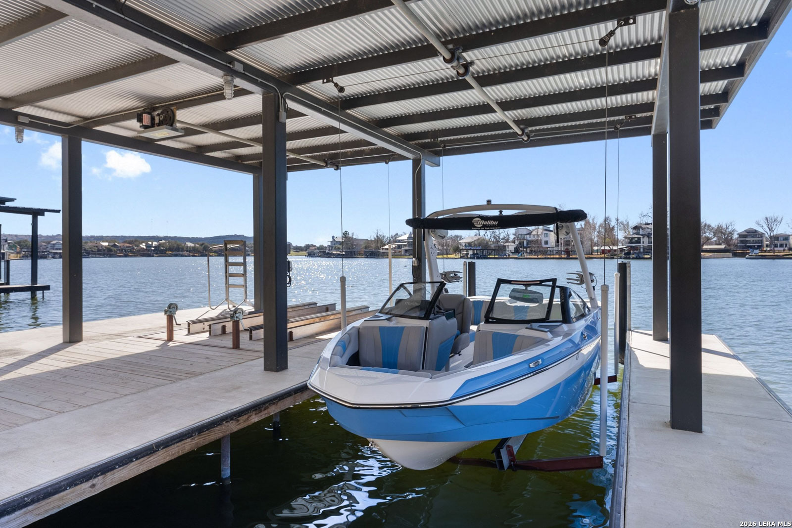 Stunning Lake LBJ waterfront. Nearly 5,000 square feet of lakefront living built for entertaining. Located inside the gated Legends community, this custom waterfront home delivers space, shoreline, and serious lake lifestyle. The oversized dock anchors the waterfront with a boat lift, double wave runner lift, wet-step ladders, and jumping gate for effortless lake access. An elevated entertaining deck above the lift creates the perfect spot to watch the action on the water. Outdoor living continues at the home with a large covered patio and full outdoor kitchen featuring a Coyote grill, gas fireplace, TV, and easy ramp access down to the dock. Inside, the open living area is framed by large windows overlooking Lake LBJ and connects seamlessly to a chef's kitchen equipped with JennAir appliances, 6-burner gas rangetop, oversized island, farmhouse sink, walk-in pantry, and abundant custom cabinetry. Two lakeview primary suites provide flexibility for owners and guests, each with spa-style baths featuring soaking tubs, large walk-in showers, and generous closets. Upstairs, a game room with balcony overlook and custom bunk beds creates the ultimate lake hangout. Pella windows, foam insulation, three zoned Trane HVAC systems, tankless water heaters, smart garage access, and a security system complete the home. Double-gated entry, golf course access, fiber internet, and underground utilities add to the appeal of this Lake LBJ waterfront retreat.