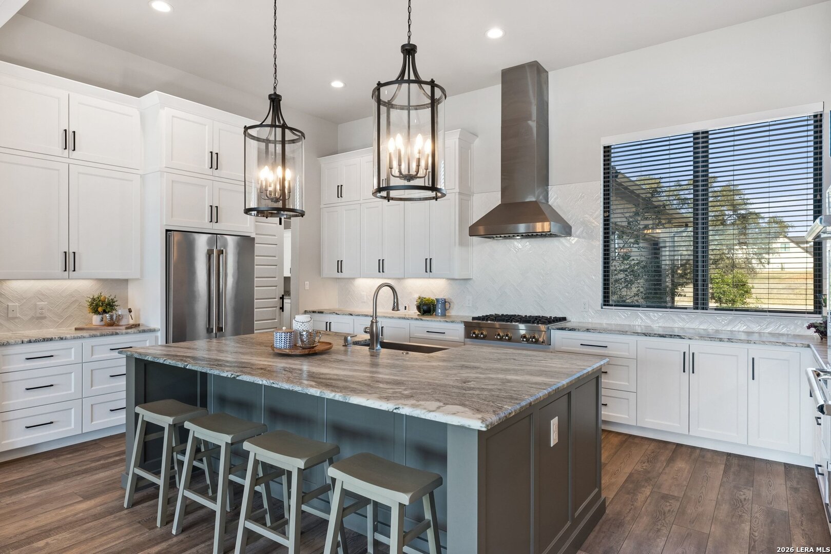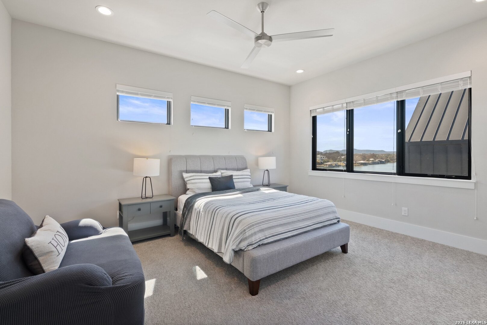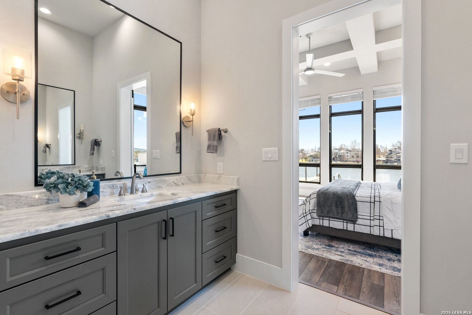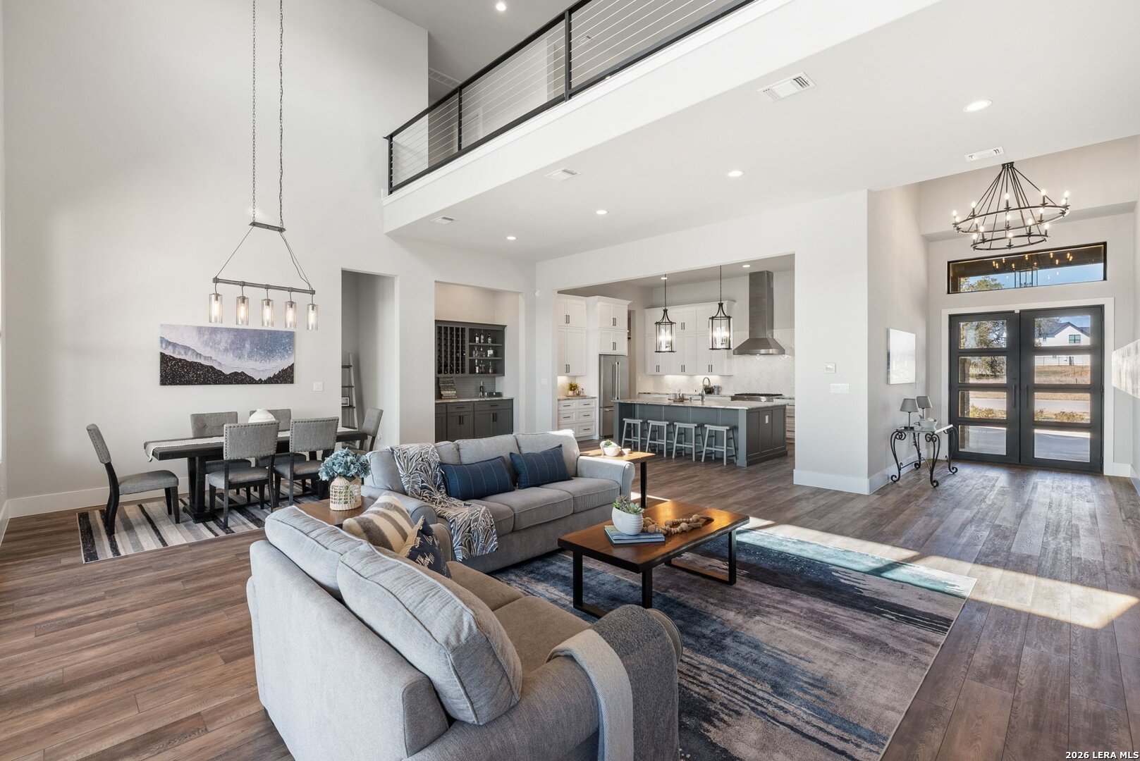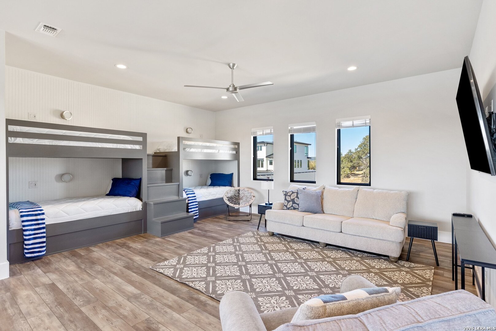 Stunning Lake LBJ waterfront. Nearly 5,000 square feet of lakefront living built for entertaining. Located inside the gated Legends community, this custom waterfront home delivers space, shoreline, and serious lake lifestyle. The oversized dock anchors the waterfront with a boat lift, double wave runner lift, wet-step ladders, and jumping gate for effortless lake access. An elevated entertaining deck above the lift creates the perfect spot to watch the action on the water. Outdoor living continues at the home with a large covered patio and full outdoor kitchen featuring a Coyote grill, gas fireplace, TV, and easy ramp access down to the dock. Inside, the open living area is framed by large windows overlooking Lake LBJ and connects seamlessly to a chef's kitchen equipped with JennAir appliances, 6-burner gas rangetop, oversized island, farmhouse sink, walk-in pantry, and abundant custom cabinetry. Two lakeview primary suites provide flexibility for owners and guests, each with spa-style baths featuring soaking tubs, large walk-in showers, and generous closets. Upstairs, a game room with balcony overlook and custom bunk beds creates the ultimate lake hangout. Pella windows, foam insulation, three zoned Trane HVAC systems, tankless water heaters, smart garage access, and a security system complete the home. Double-gated entry, golf course access, fiber internet, and underground utilities add to the appeal of this Lake LBJ waterfront retreat.