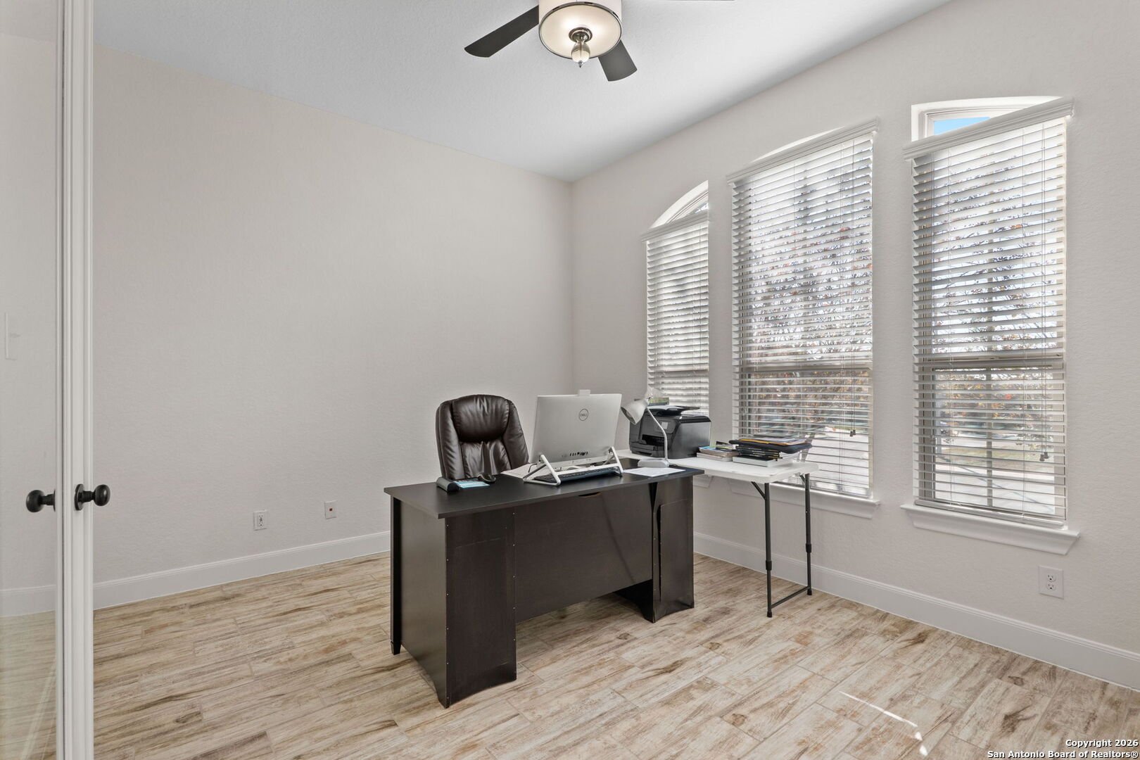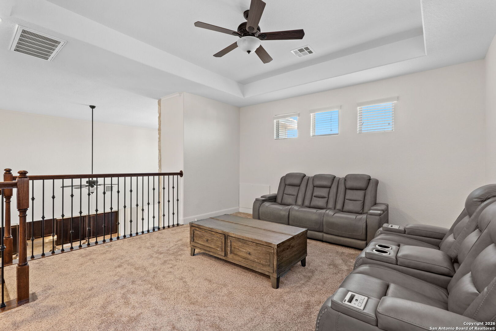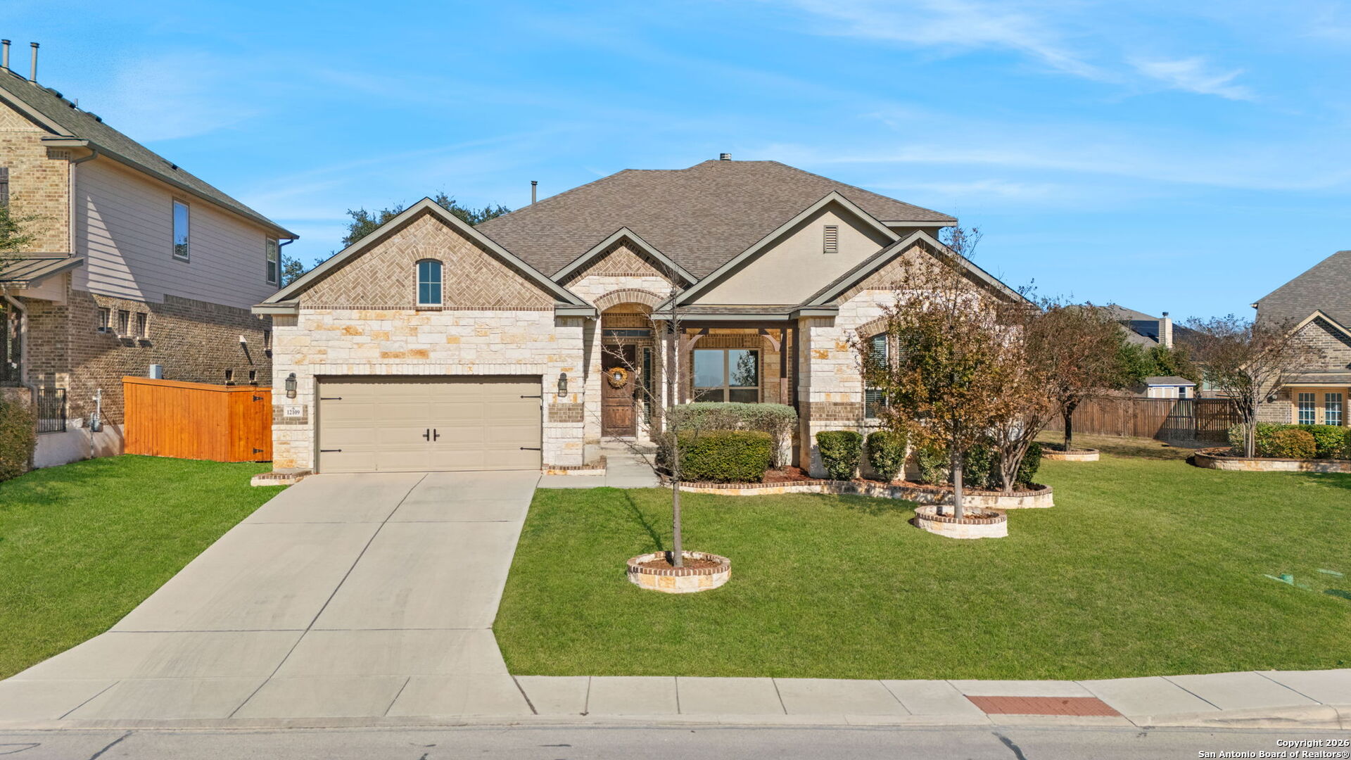 This well-maintained home offers a versatile layout with a guest suite on the main level, ideal for extended stays or multigenerational living, along with a private home office and a refined formal dining room. The main living areas feature an open floor plan complemented by high ceilings, recessed lighting, and abundant windows that allow natural light to fill the space. Ceramic tile flooring with a wood look provides durability and a cohesive design throughout the primary living areas. The living room features a stone fireplace and flows seamlessly into the kitchen, creating a comfortable setting for everyday living and entertaining. The kitchen is equipped with stainless steel appliances, a gas cooktop, and a large kitchen island with breakfast bar, offering excellent functionality and gathering space. A beautiful handrail leads upstairs to a loft that can be used as a game room, along with an additional theater room, providing multiple options for entertainment and flexible use. The backyard includes a covered patio slab and privacy fence, ideal for outdoor relaxation. Additional highlights include a RainSoft EC5 water softener system that conveys with the property, features a 10-year warranty, has been recently serviced, and requires no maintenance until December 2028. The location offers easy access to Loop 1604 and Highway 151, with convenient proximity to SeaWorld, Northwest Vista College, and Lackland Air Force Base. Situated within Northside ISD and zoned for William J. Brennan High School.