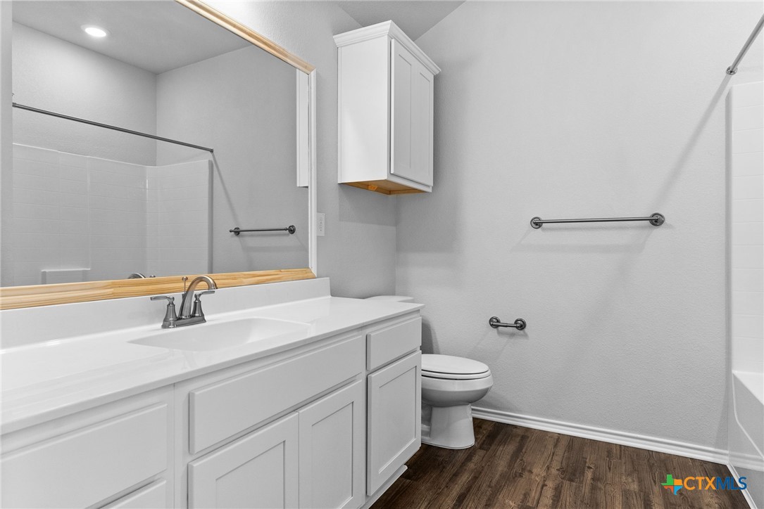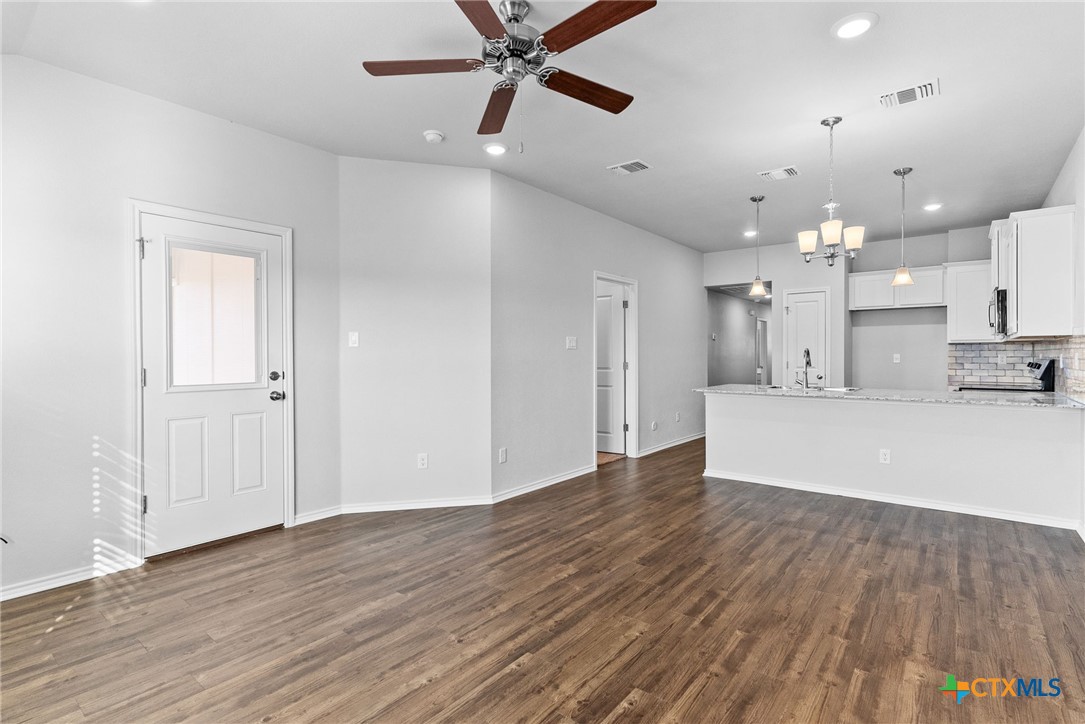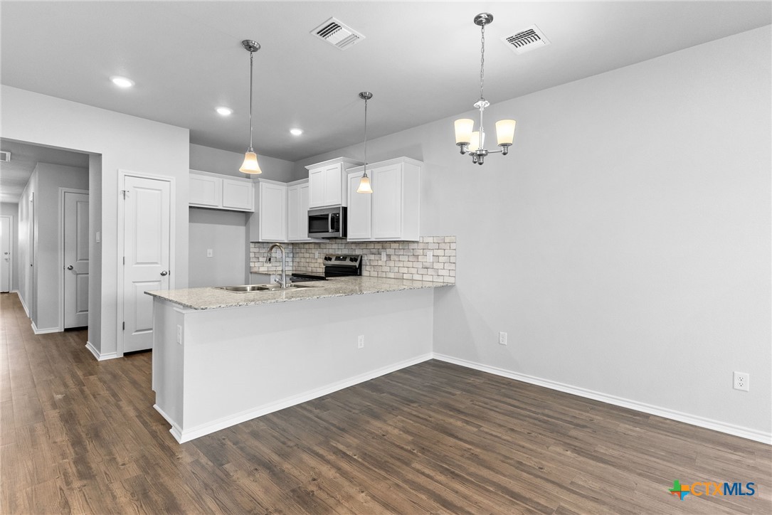 The exterior showcases tan-toned bricks complemented by baby blue accents Enter the epitome of and convenience with this charming single-story townhome, three cozy bedrooms two tastefully appointed bathrooms. Upon entry, one is greeted by a seamless flow from welcoming foyer to stunning kitchen, which includes modern stainless-steel appliances, a breakfast bar, spacious pantry suitable for family needs, and grey cabinets paired light granite countertops. The contiguous living offers an ideal atmosphere for both relaxation and entertaining. The master suite exemplifies sophistication and comfort, featuring a walk-in closet and ceiling fans. The master bathroom serves as a serene retreat, complete with a shower-t combination for rejuvenation living areas wet zones feature greyish-toned vinyl plank flooring, plush carpeting adds warmth to the bedrooms. (Colors may VARY) Schedule a walk-through now!