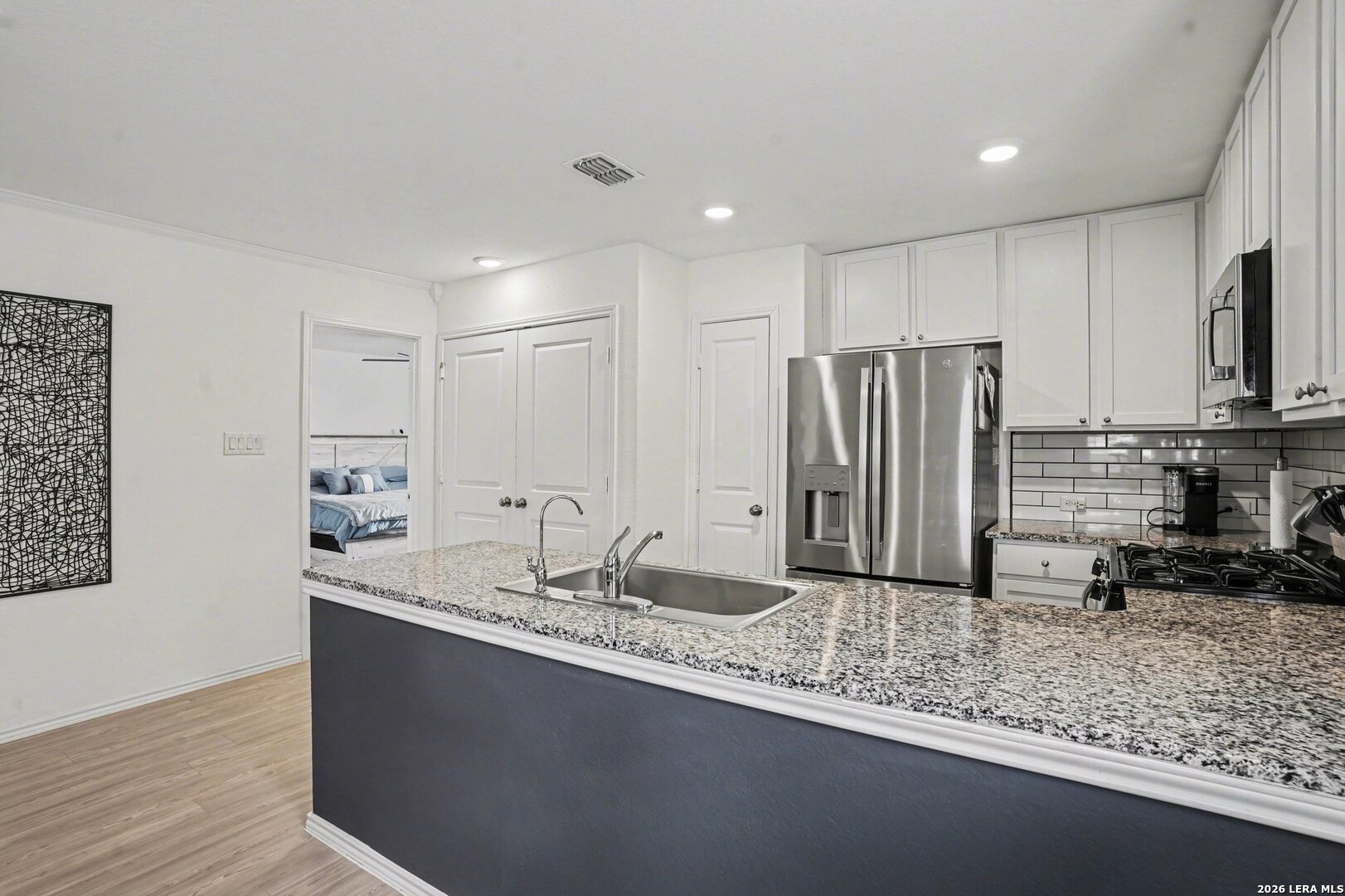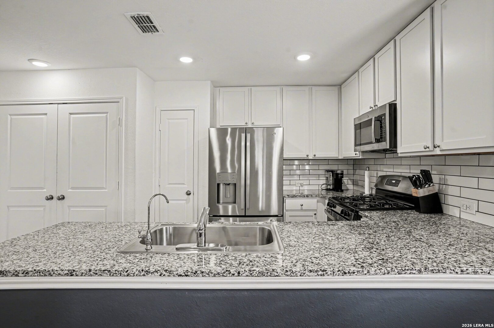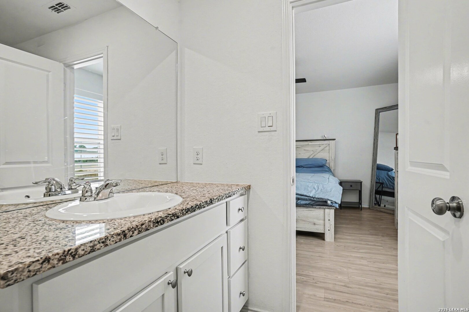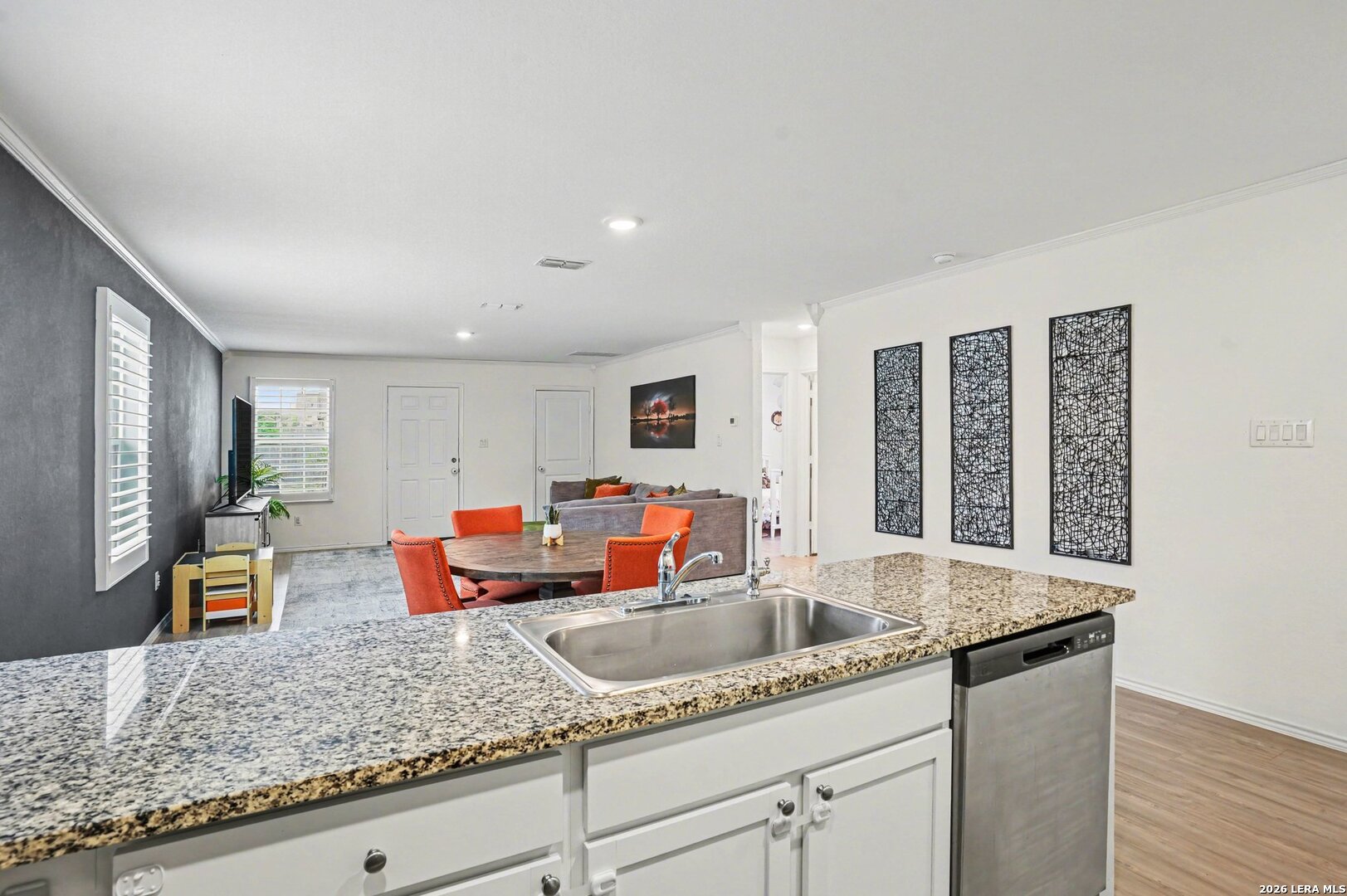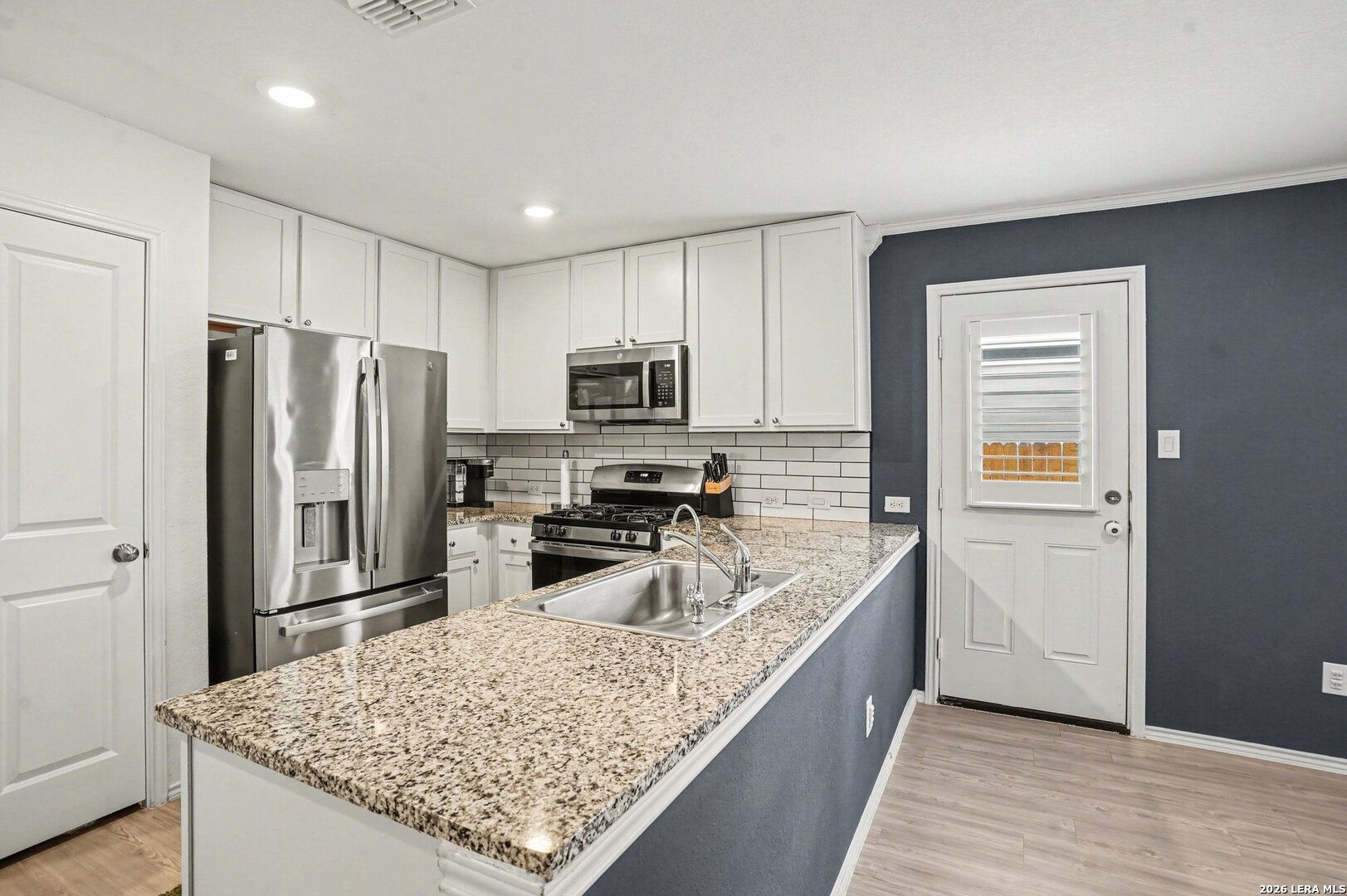 Clean and move-in ready 3 bedroom, 2 bath home featuring an open floorplan, no carpet throughout, and a spacious primary suite with a huge walk-in closet. Interior features include granite countertops, stainless steel appliances, gas cooking, crown molding, plantation shutters, and a water softener. Additional highlights include an epoxy-coated garage floor and well-maintained interior. Conveniently located with easy access to Loop 410 and Hwy 151, less than 5 miles from Lackland AFB, shopping, and dining.