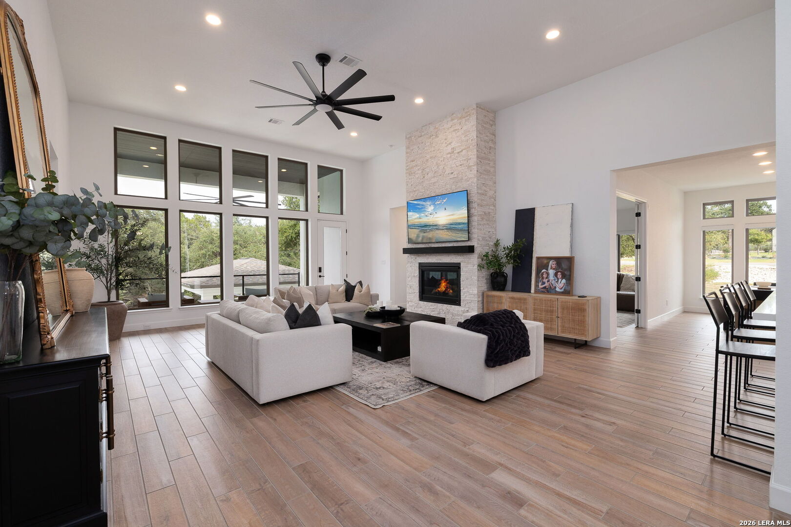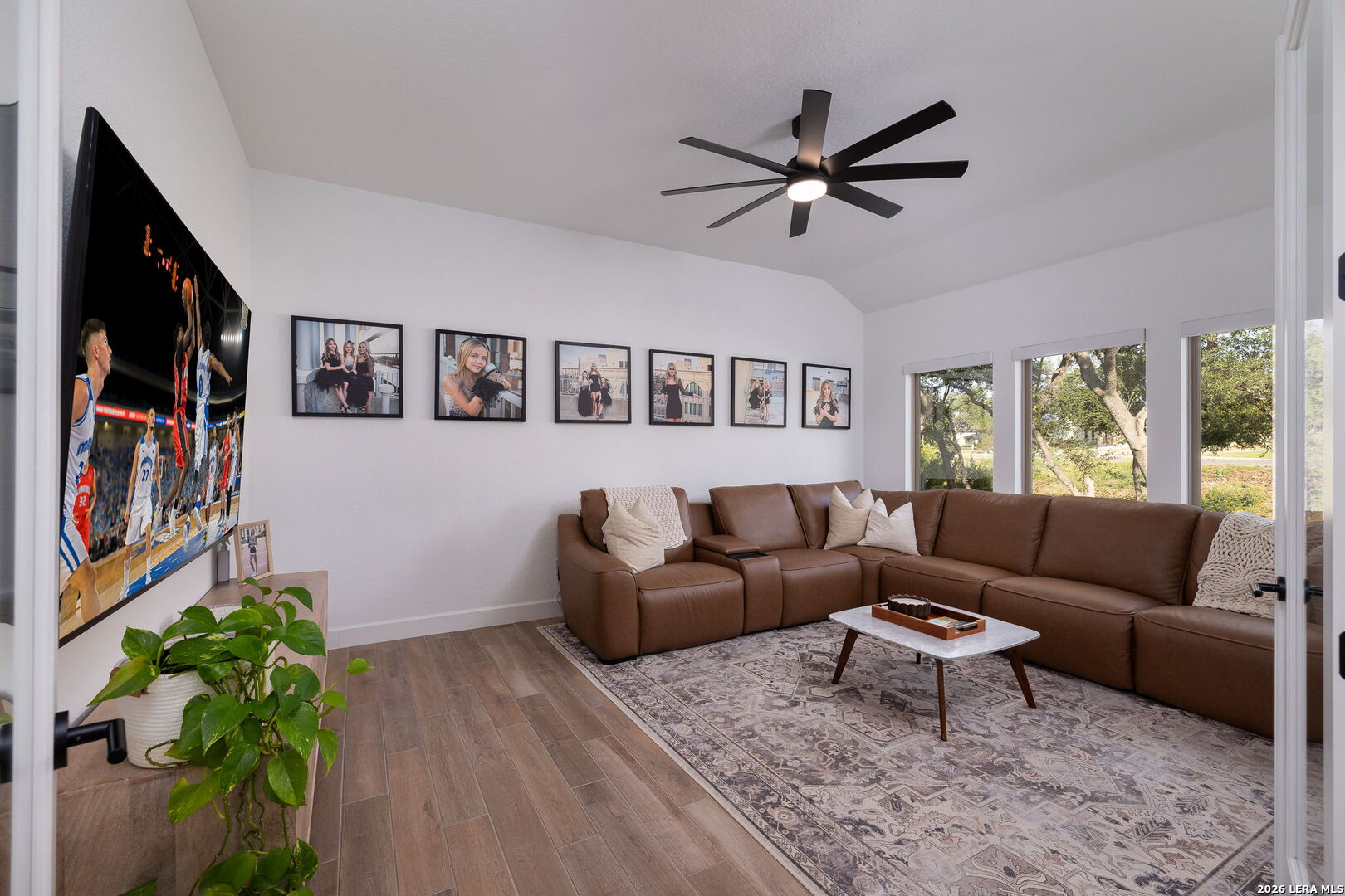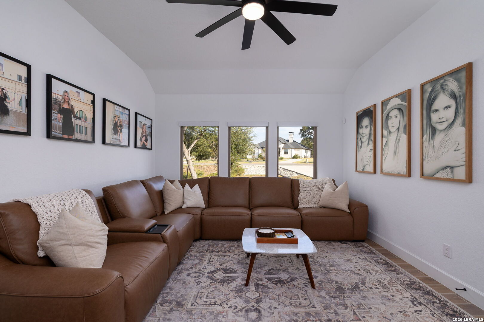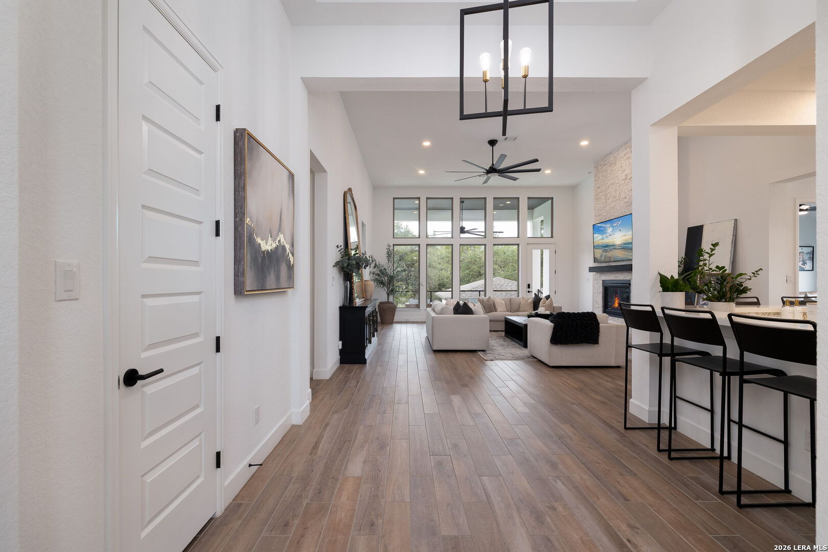 Situated on a private one-acre lot in the highly regarded Vintage Oaks community, this nearly 4,000-square-foot residence offers an ideal balance of scale and everyday functionality. The home is defined by an open, single-story floor plan with 14-foot ceilings and a grand double-door entry that establishes a sense of space the moment you arrive. Designed for those who value clean lines and low-maintenance living, the interior features hard flooring throughout-with no carpet-and custom electric shades that manage the abundant natural light. The kitchen is designed with extensive cabinetry and an open layout that transitions naturally into the main living areas and a dedicated executive office with built-in cabinetry. The outdoor living space is an extension of the home, featuring a tiered layout with a spacious covered deck leading down to a pool and spa. A large, detached cabana, complete with a stone fireplace and a fully equipped outdoor kitchen, provides a dedicated space for hosting year-round.
