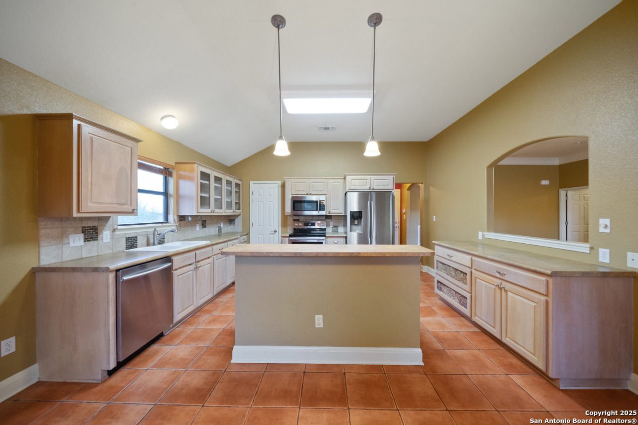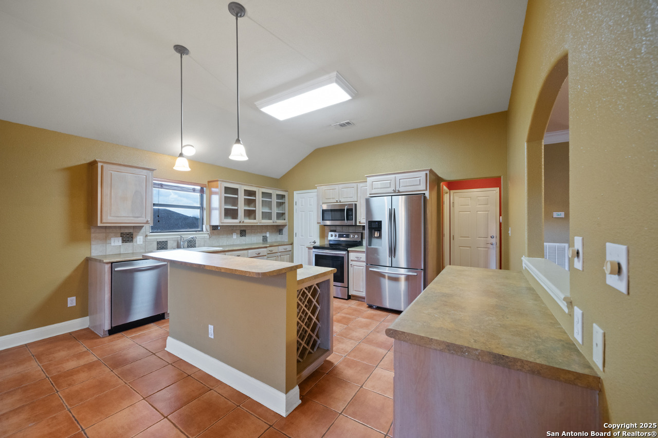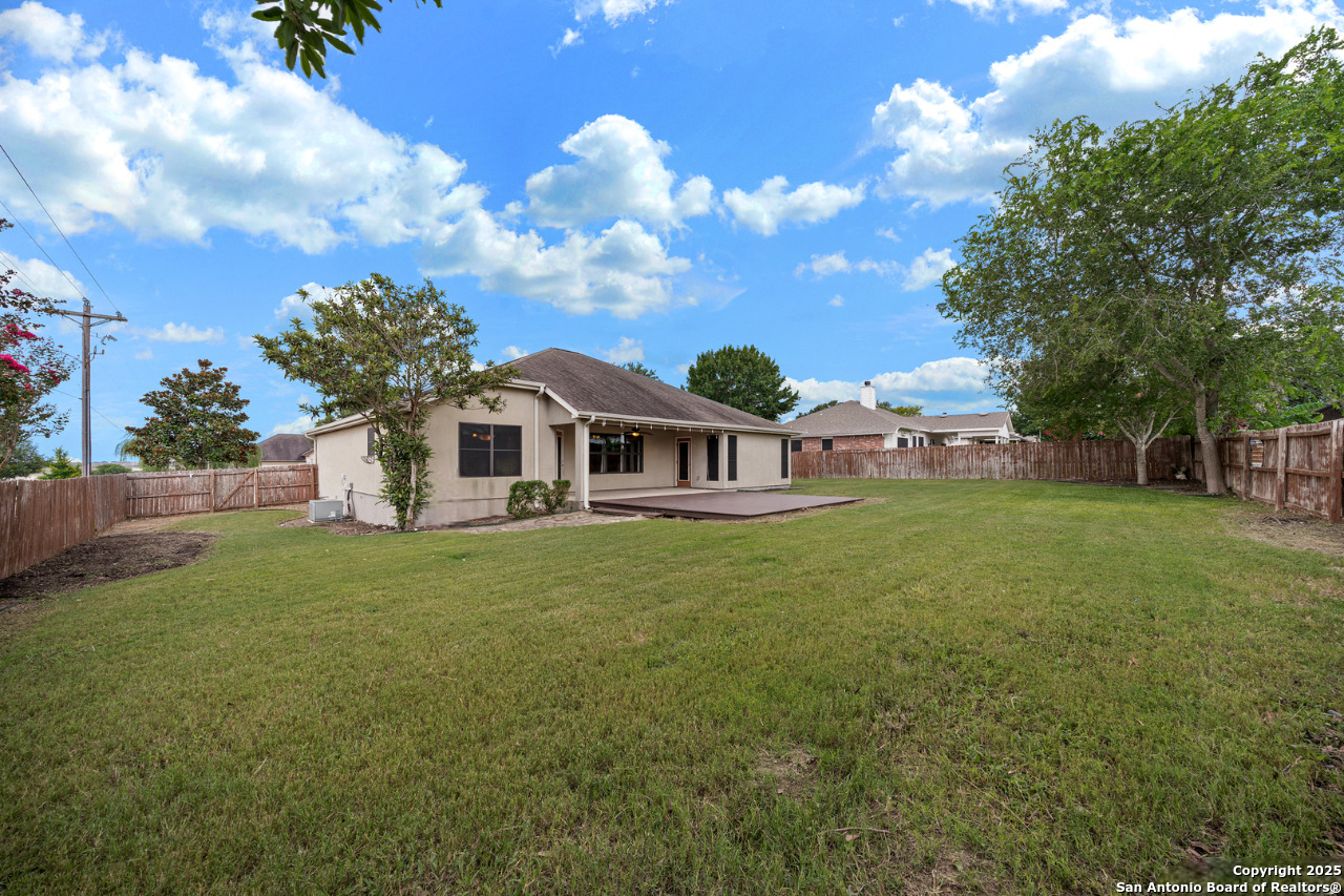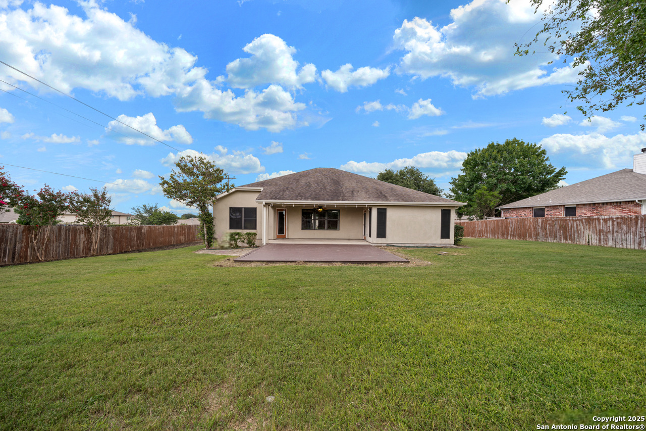 You rarely see a home like this for lease! The three-bedroom, two-bath home in Towne View Estates has real personality with a "Great Room!" Built-in bookcases on either side of the fireplace, a cathedral ceiling, and beautiful Saltillo tile easy-care floors are stunning. You can walk outside to a double-covered patio with an extended deck to the huge corner lot, perfect for family relaxation and play from the family room. The kitchen has a large Saltillo tiled breakfast area, an island/breakfast bar, and custom cabinets. Stainless appliances include the refrigerator, smooth cooktop range, microwave, and dishwasher. The Primary Suite is separated from the secondary bedrooms with its own door to the double-covered patio. Don't Miss It!