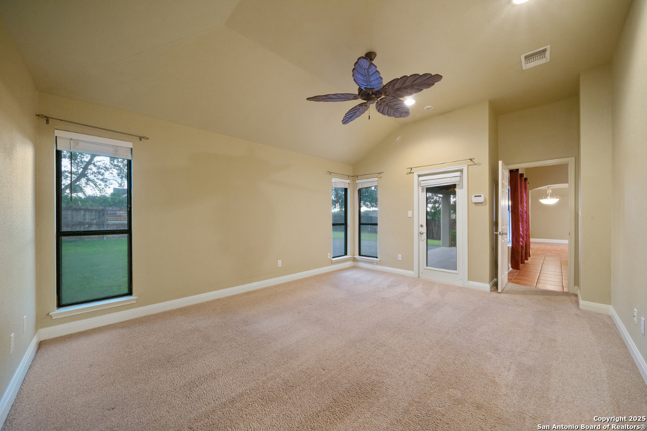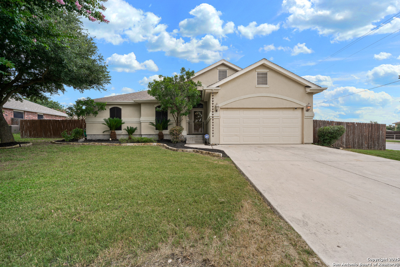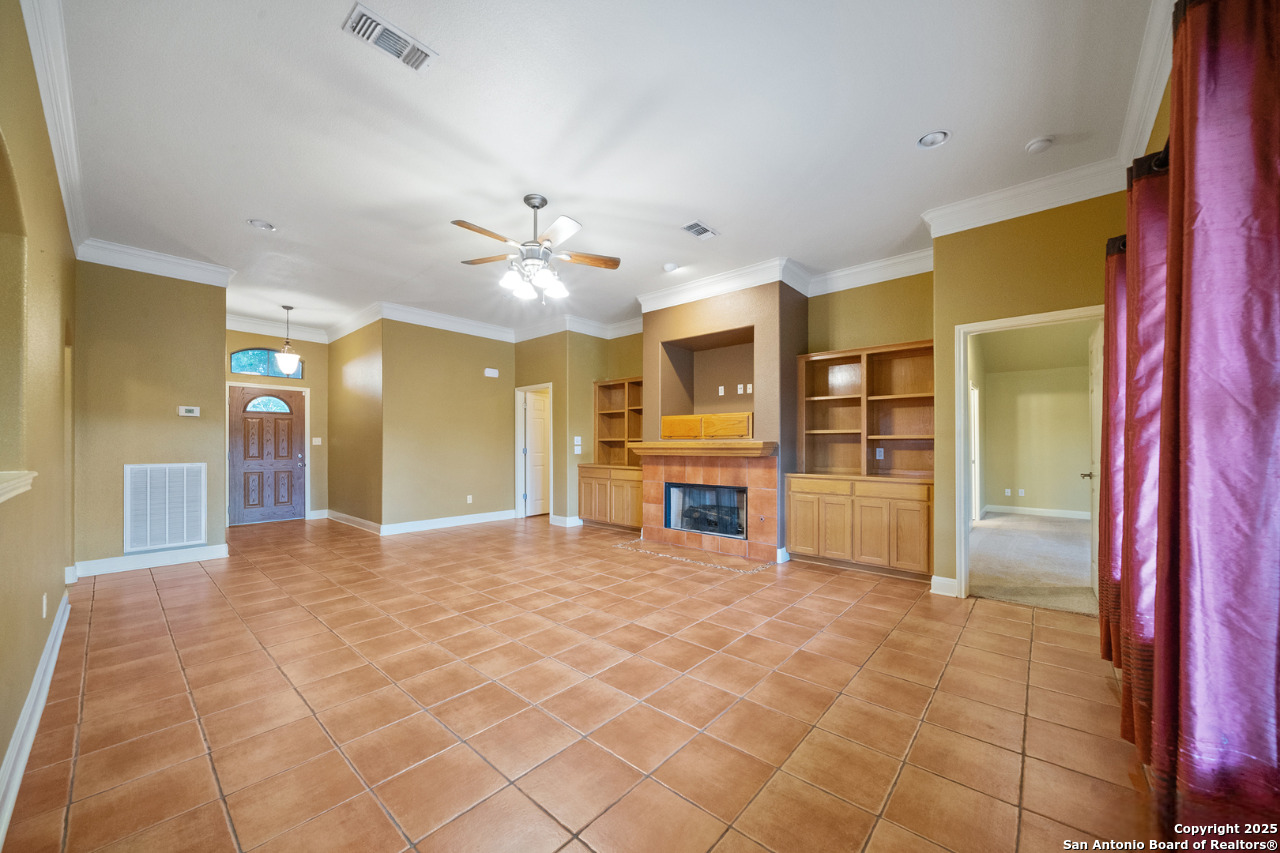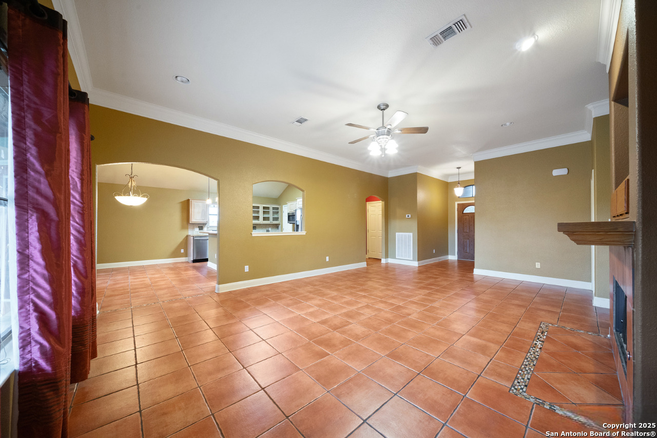 You rarely see a home like this for lease! The three-bedroom, two-bath home in Towne View Estates has real personality with a "Great Room!" Built-in bookcases on either side of the fireplace, a cathedral ceiling, and beautiful Saltillo tile easy-care floors are stunning. You can walk outside to a double-covered patio with an extended deck to the huge corner lot, perfect for family relaxation and play from the family room. The kitchen has a large Saltillo tiled breakfast area, an island/breakfast bar, and custom cabinets. Stainless appliances include the refrigerator, smooth cooktop range, microwave, and dishwasher. The Primary Suite is separated from the secondary bedrooms with its own door to the double-covered patio. Don't Miss It!