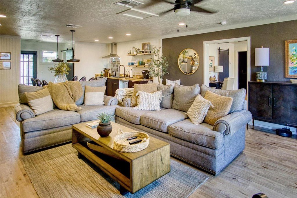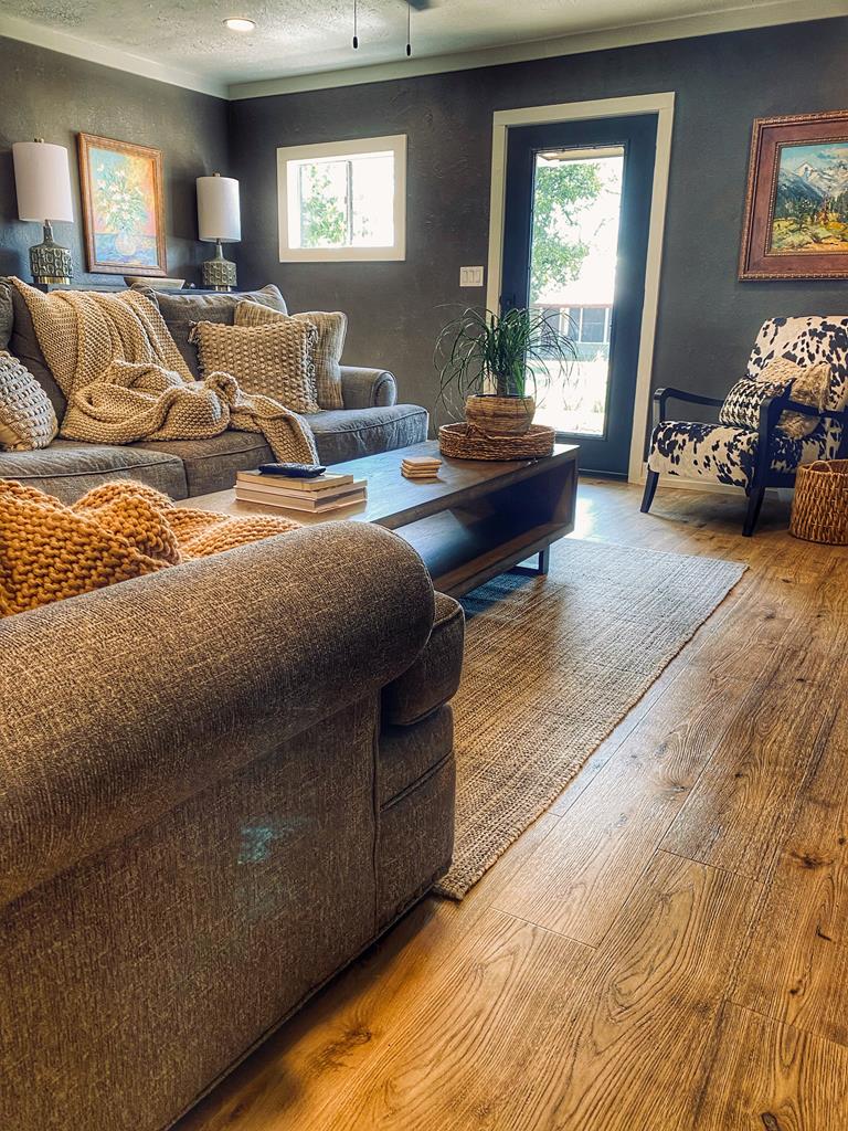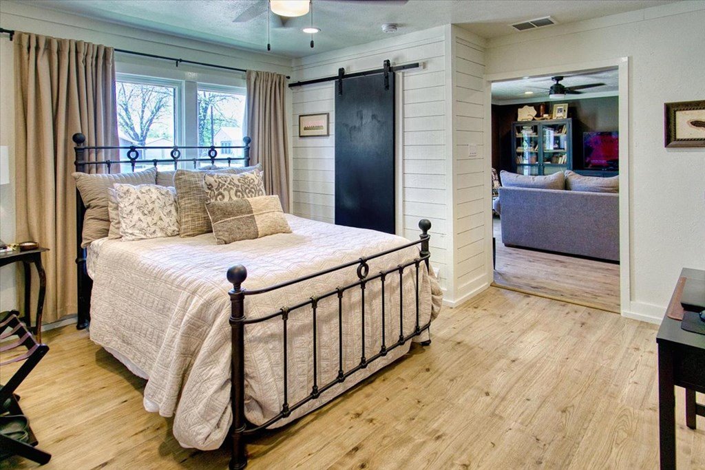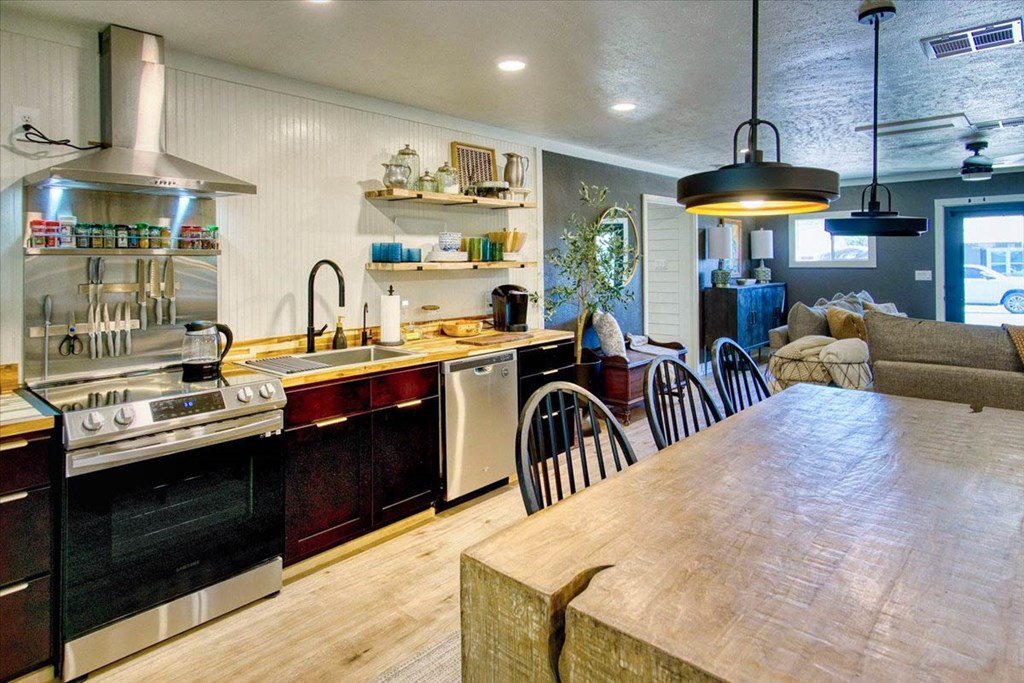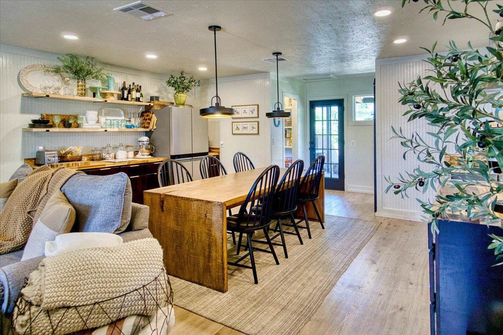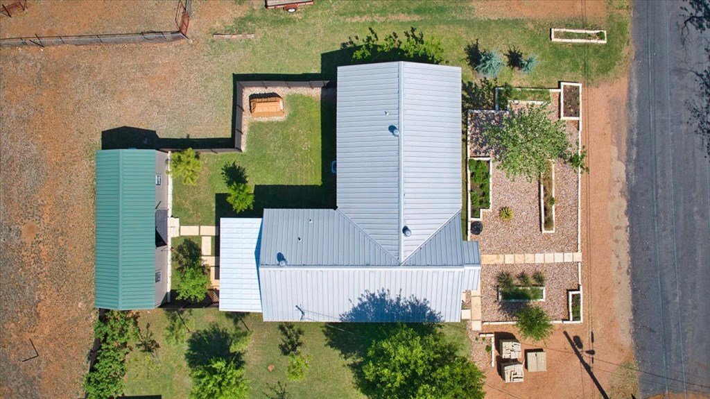 Located just a short walk from Mason ISD, this 2-bedroom, 1.5-bath home has been beautifully remodeled. Accent walls add character, while large windows keep the space bright and airy. The open layout features durable laminate floors and thoughtfully designed bedrooms. The master bathroom includes a relaxing tub-shower combo. The kitchen stands out with floating cabinets, modern appliances, a large stainless steel sink, and butcher block countertops. Out back, there's a 12x32 detached 2-bedroom building—perfect for guests, a home office, or extra storage. The yard is landscaped for low maintenance and great curb appeal.