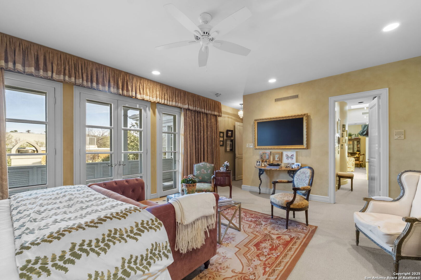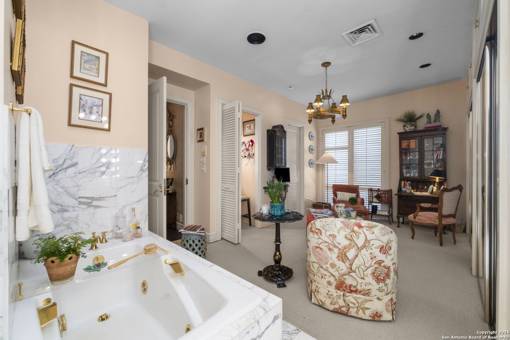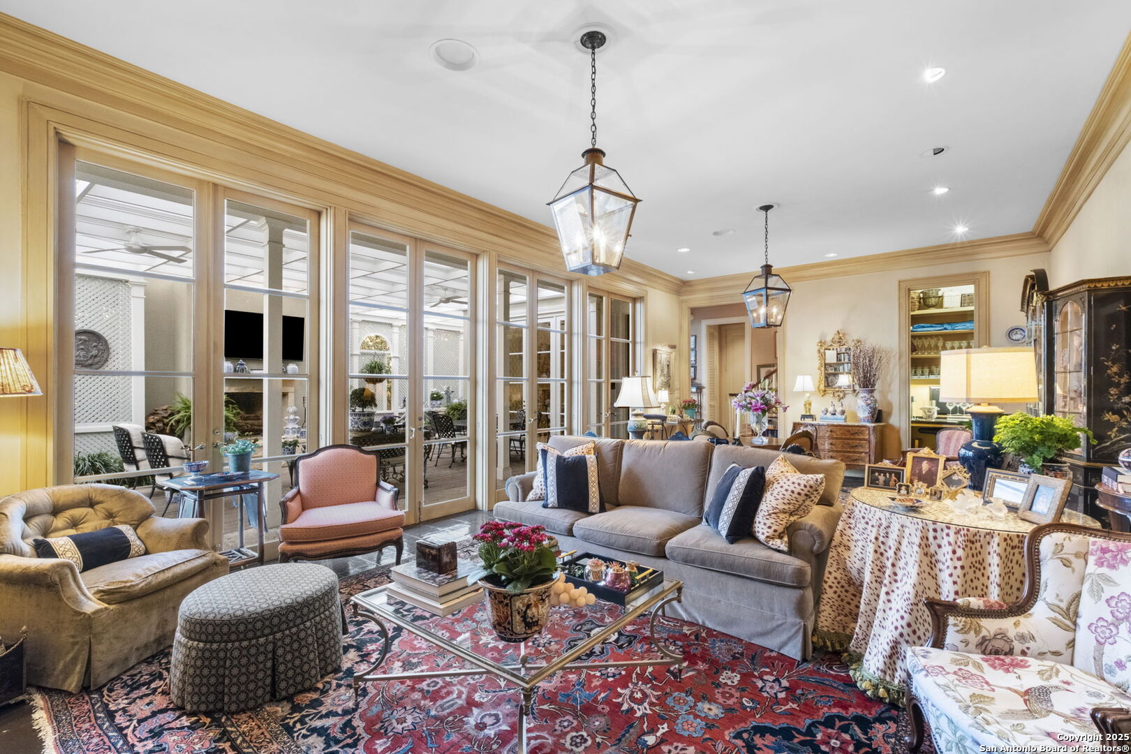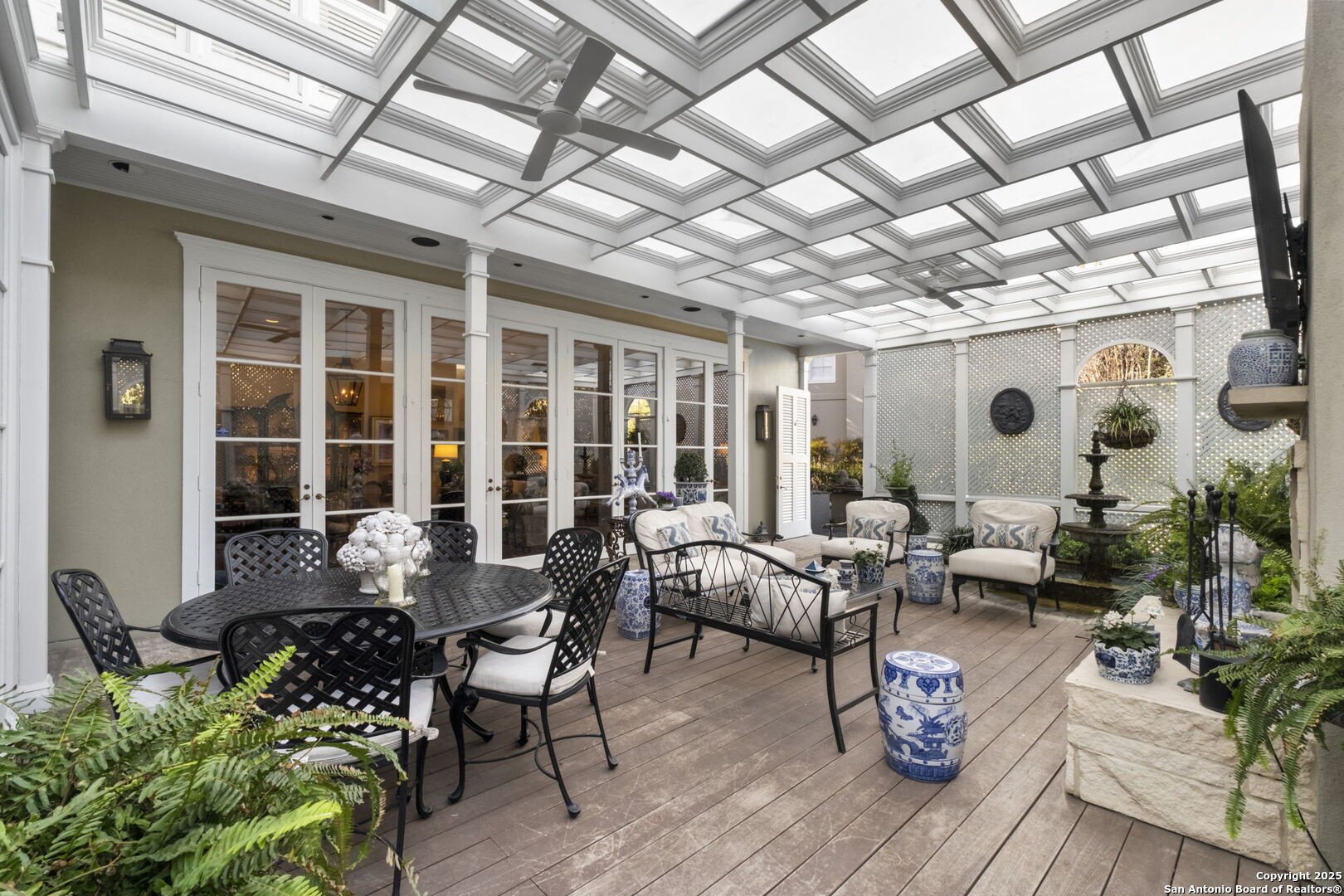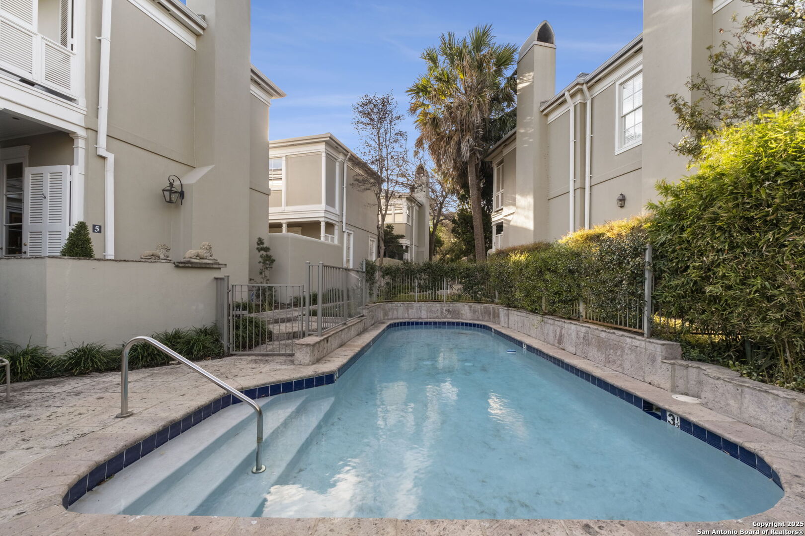 This beautiful home features a serene courtyard with a fountain, a spacious dining room, and a chef's kitchen with an outdoor kitchen. The large master suite has a sitting area, French doors to a balcony, and separate his-and-hers bathrooms with walk-in closets. There are two additional bedrooms with a shared bathroom. Storage is abundant, including a luggage closet, silver cabinet, and jewelry safe. With parking for three vehicles and a quiet, low-maintenance "lock and leave" design, this is a premier property for both relaxation and entertaining.