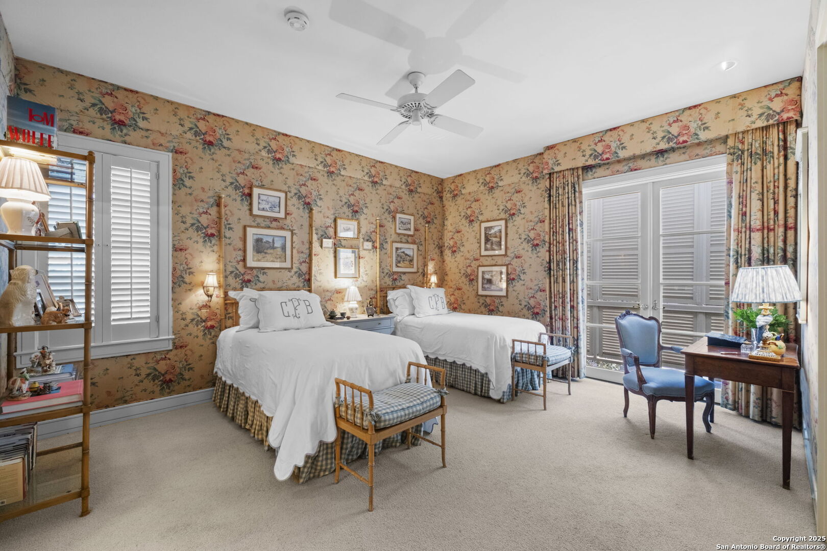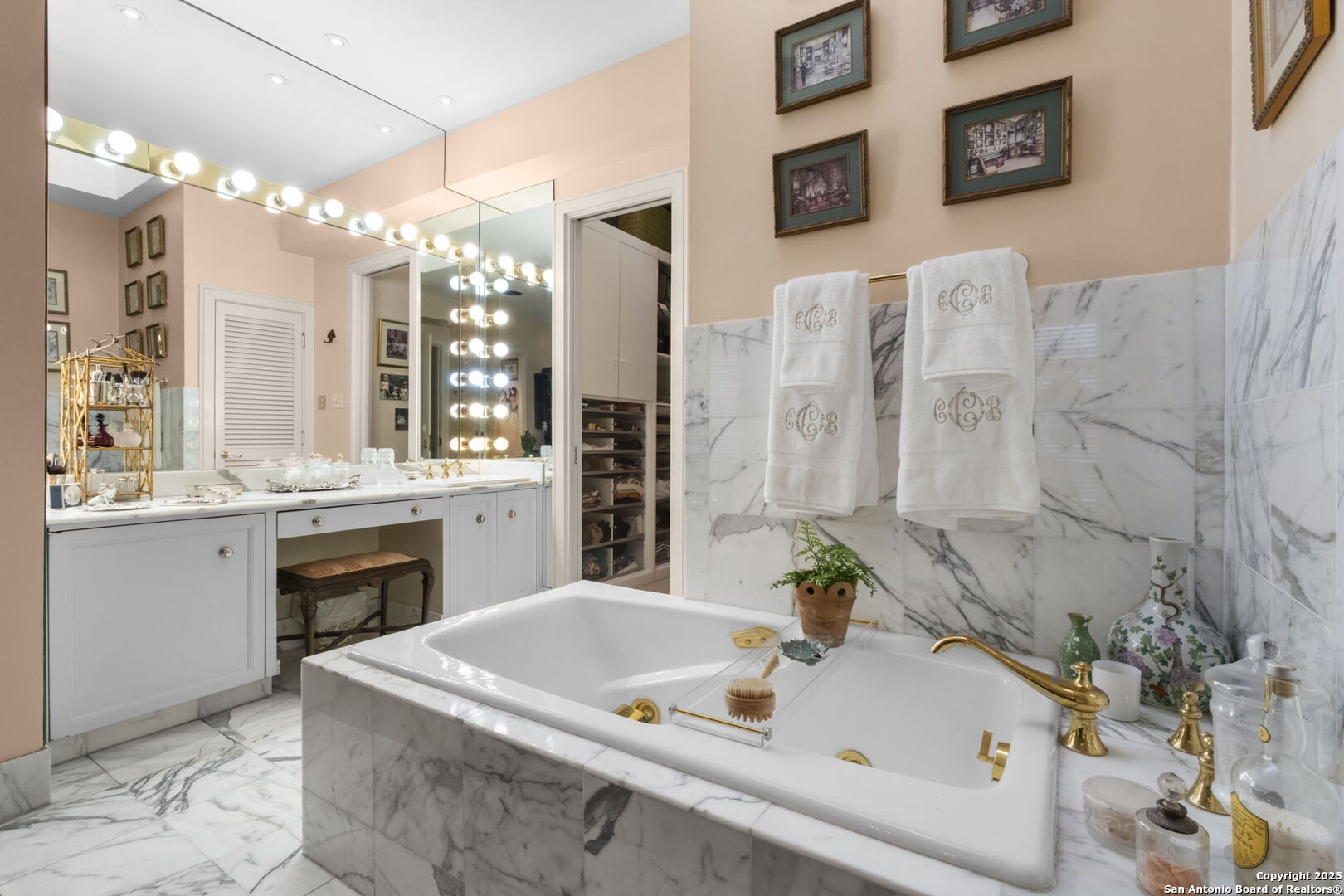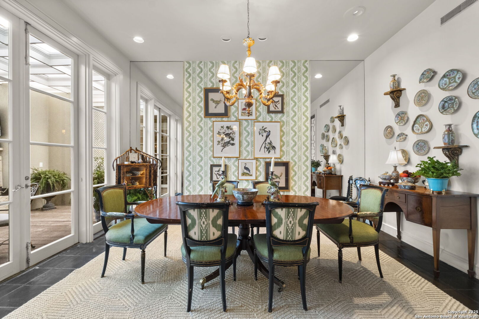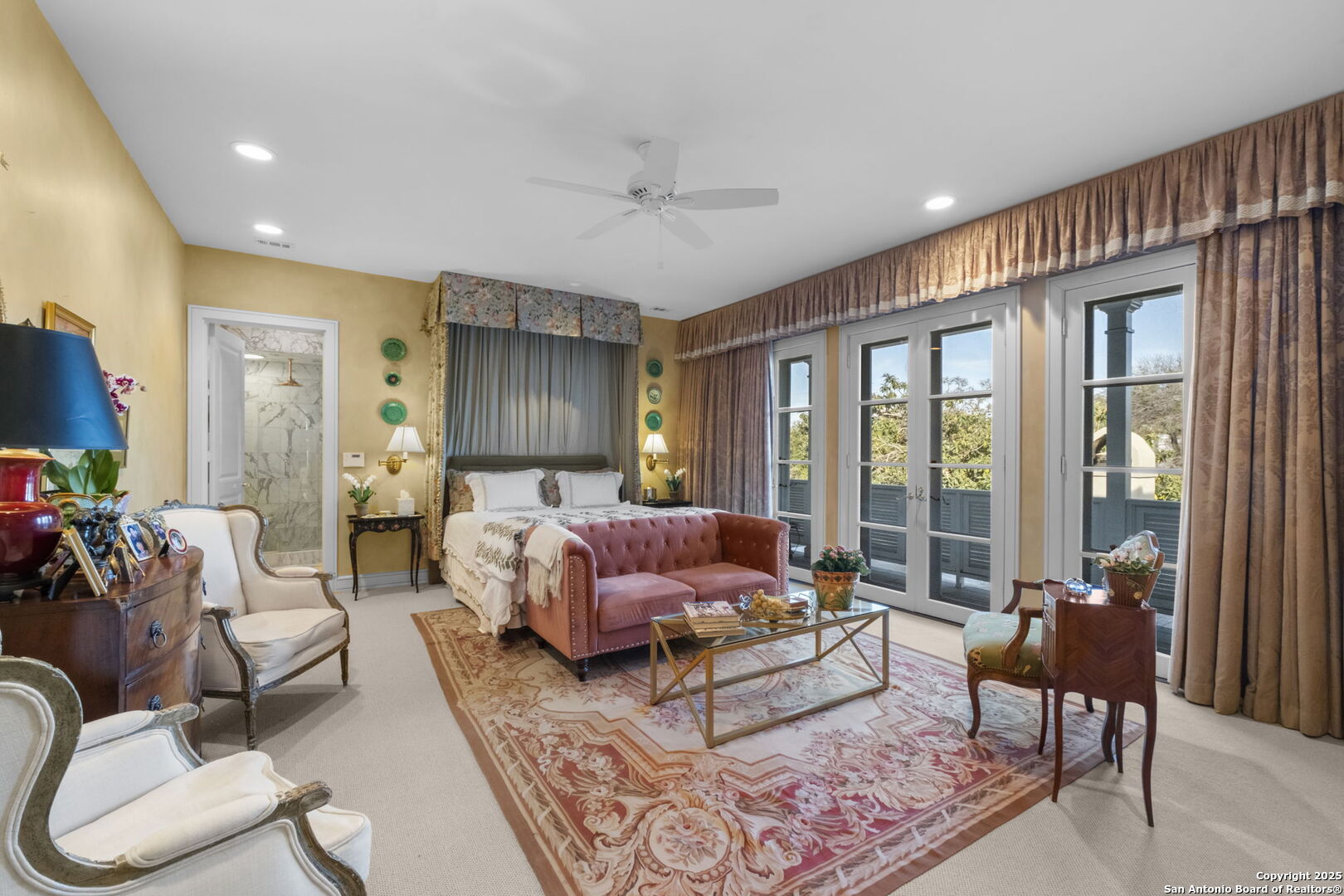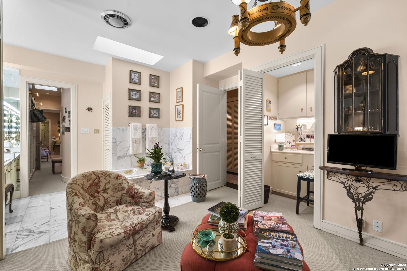 This beautiful home features a serene courtyard with a fountain, a spacious dining room, and a chef's kitchen with an outdoor kitchen. The large master suite has a sitting area, French doors to a balcony, and separate his-and-hers bathrooms with walk-in closets. There are two additional bedrooms with a shared bathroom. Storage is abundant, including a luggage closet, silver cabinet, and jewelry safe. With parking for three vehicles and a quiet, low-maintenance "lock and leave" design, this is a premier property for both relaxation and entertaining.
