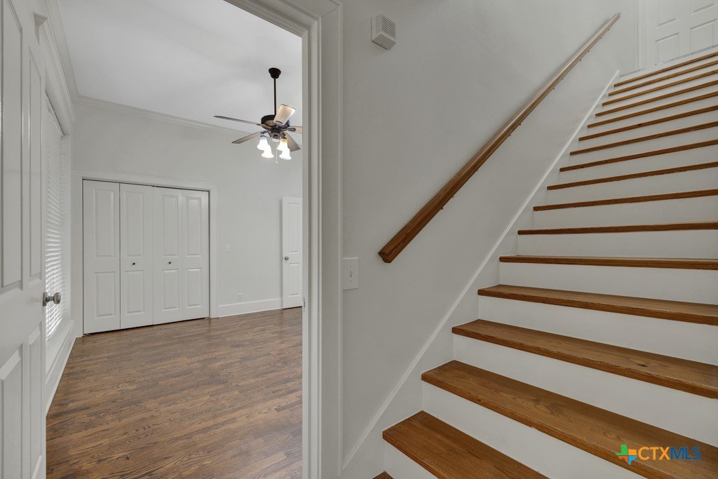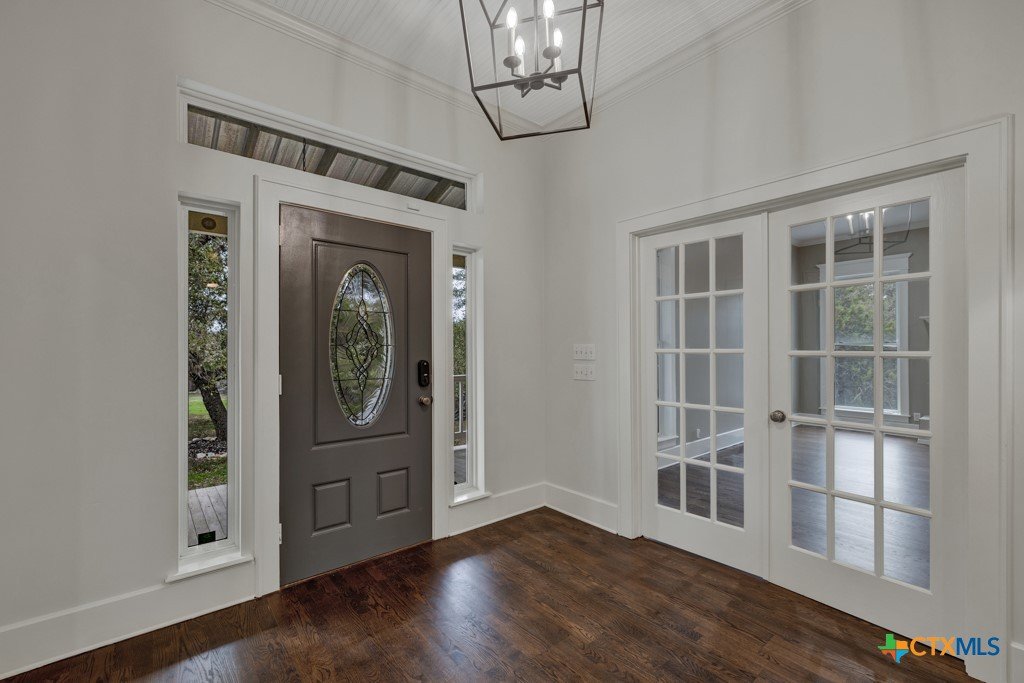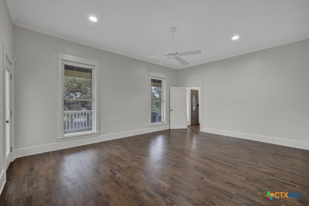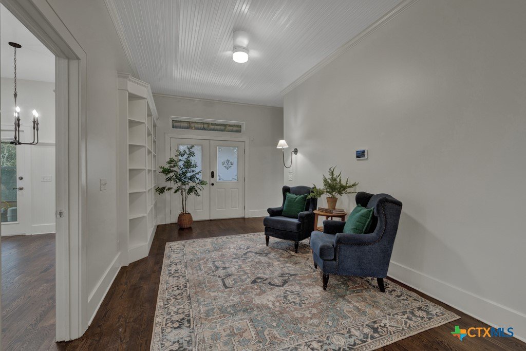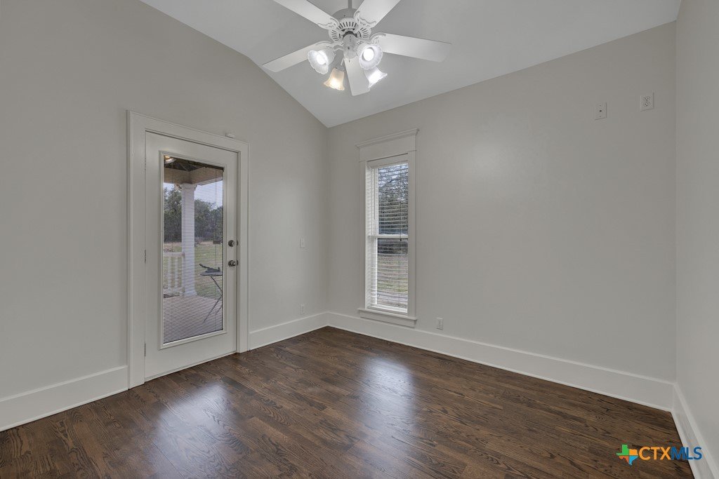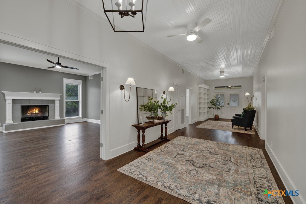 Surrounded by mature oak trees in the heart of the Hill Country, this beautifully updated home sits on 5 fully fenced acres, offering both privacy and convenience. Ideally located with easy access to San Marcos, Wimberley, and surrounding areas, this property is perfect for those seeking a peaceful retreat without sacrificing accessibility. Step inside through the grand foyer entrance, complete with built-in bookshelves, setting the tone for a home that blends elegance with warmth. The primary suite offers direct access to the wraparound front porch, creating a seamless indoor-outdoor living experience. A versatile adjoining room is ideal for a nursery, home office, or gym—perfect for today’s lifestyle needs. An ADA guest room ensures comfort and convenience for all, adding to the home’s thoughtful design. Upstairs, you'll find two spacious bedrooms connected by a cozy living area, along with BONUS SPACE walk-in floored attic access that presents endless possibilities—finish it out as additional bedrooms, a game room, man cave, or studio. Outside, this property is a homesteader’s dream, featuring a chicken coop and an enclosed garden with raised beds, perfect for growing fresh produce year-round. Recent updates include fresh paint, new fixtures, and refinished wood floors, enhancing the home's timeless charm. With its seclusion, natural beauty, and modern updates, this property is a rare Hill Country gem waiting for its next owner!