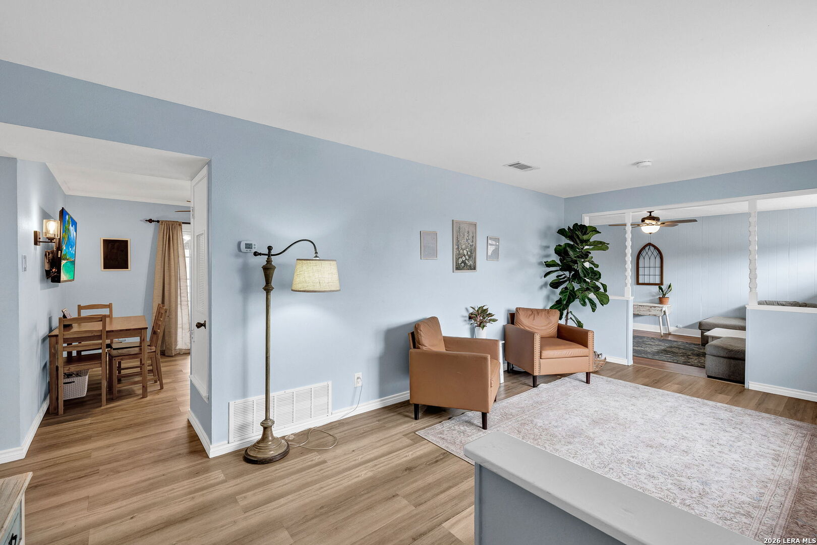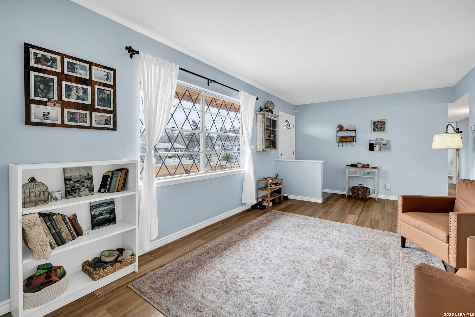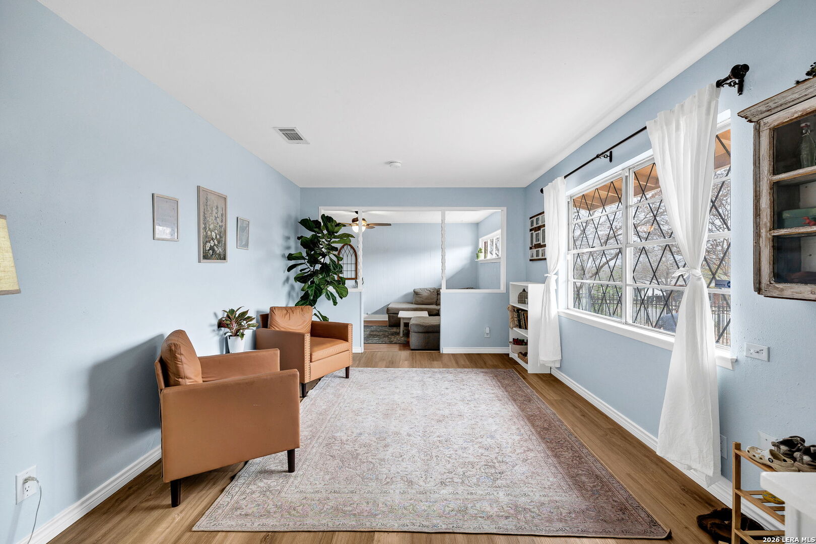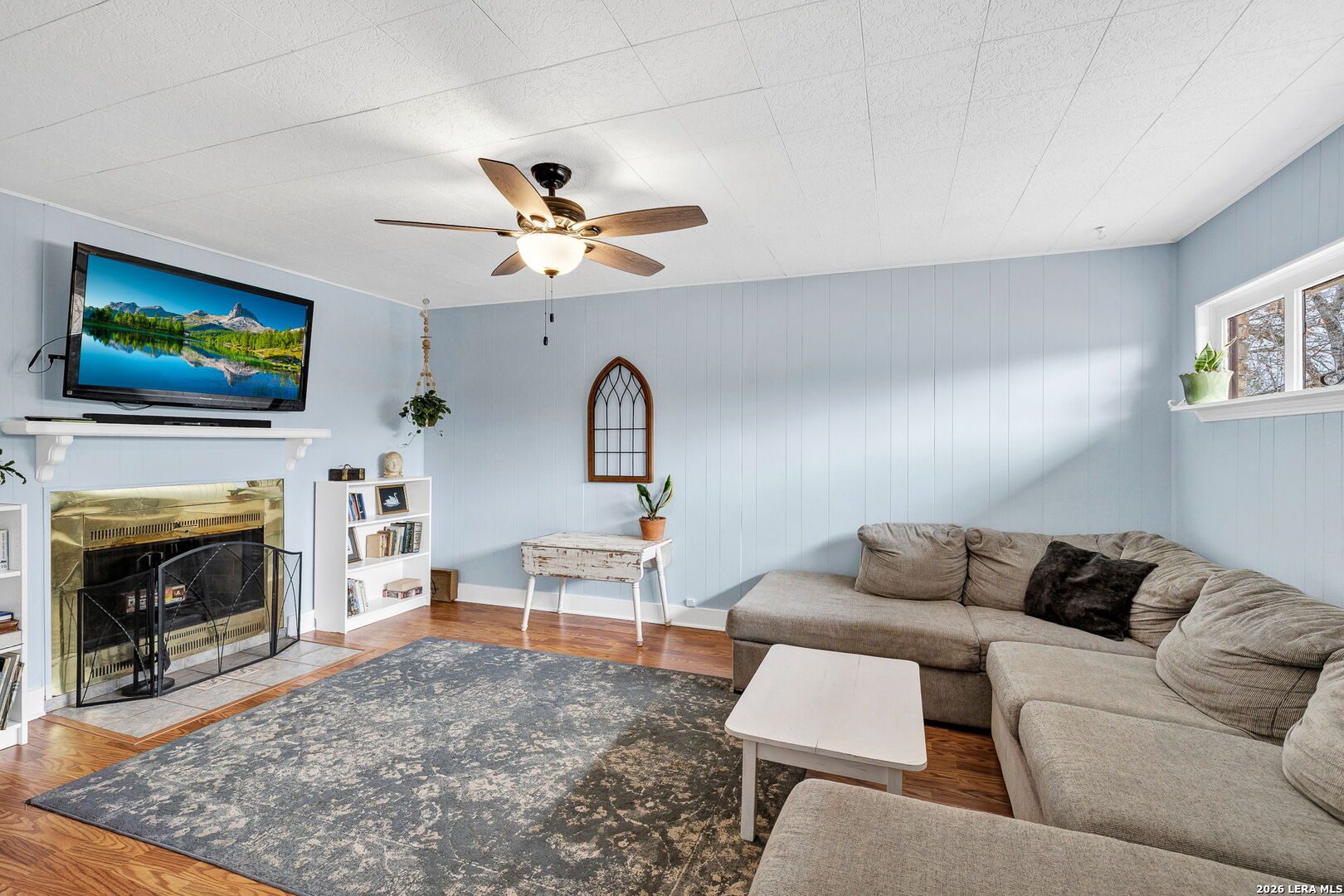 This beautifully renovated three-bedroom, two-bath home with a converted garage is perfectly situated near Lackland AFB. Inside, stylish luxury wood-look vinyl floors lead into a modern kitchen featuring tile backsplash, ceramic sink, and sleek Euro-style wall-mounted range hood. The bathrooms are tastefully updated, and fresh paint throughout creates a bright, welcoming vibe. A spacious family room with a cozy fireplace, plus a large, covered patio and backyard shed, make this move-in ready home a complete package.