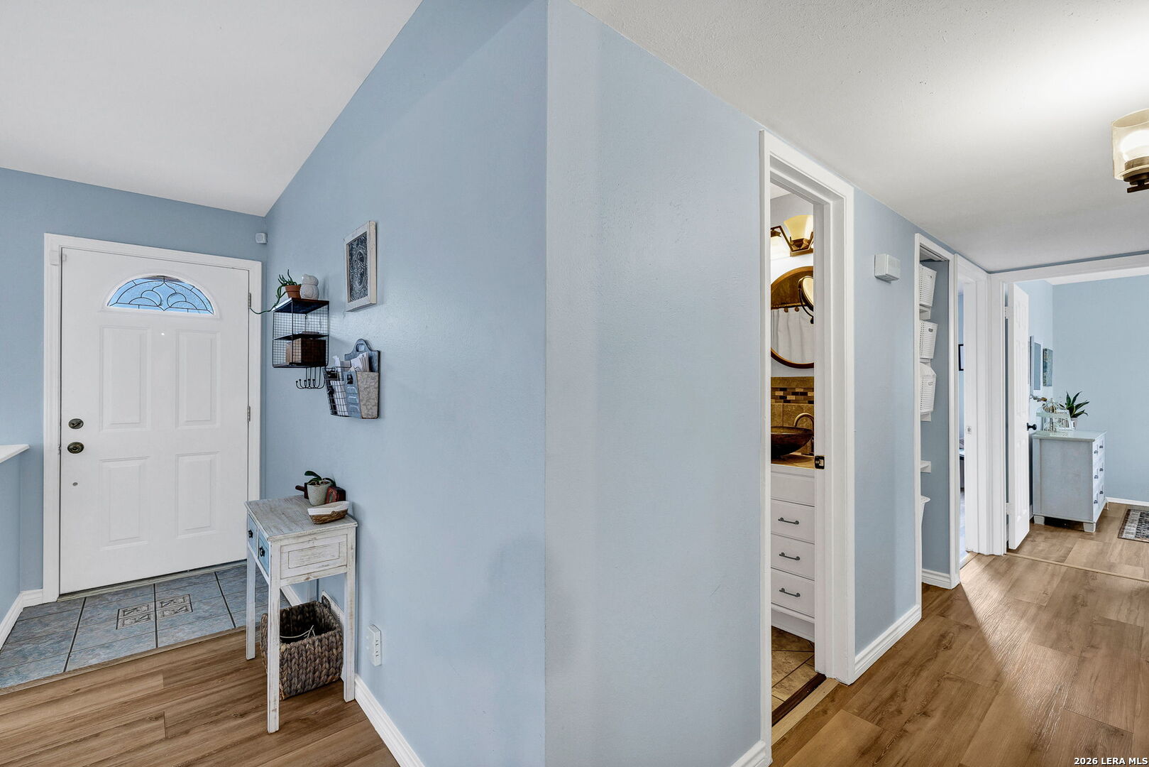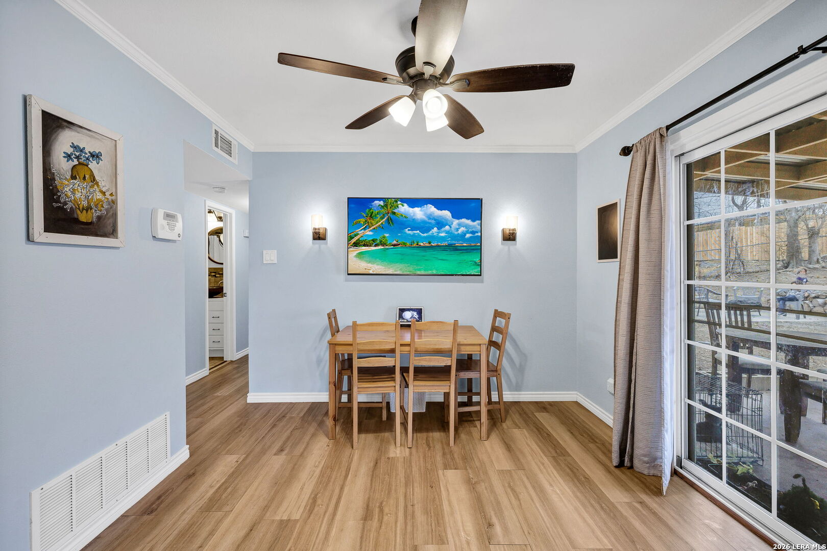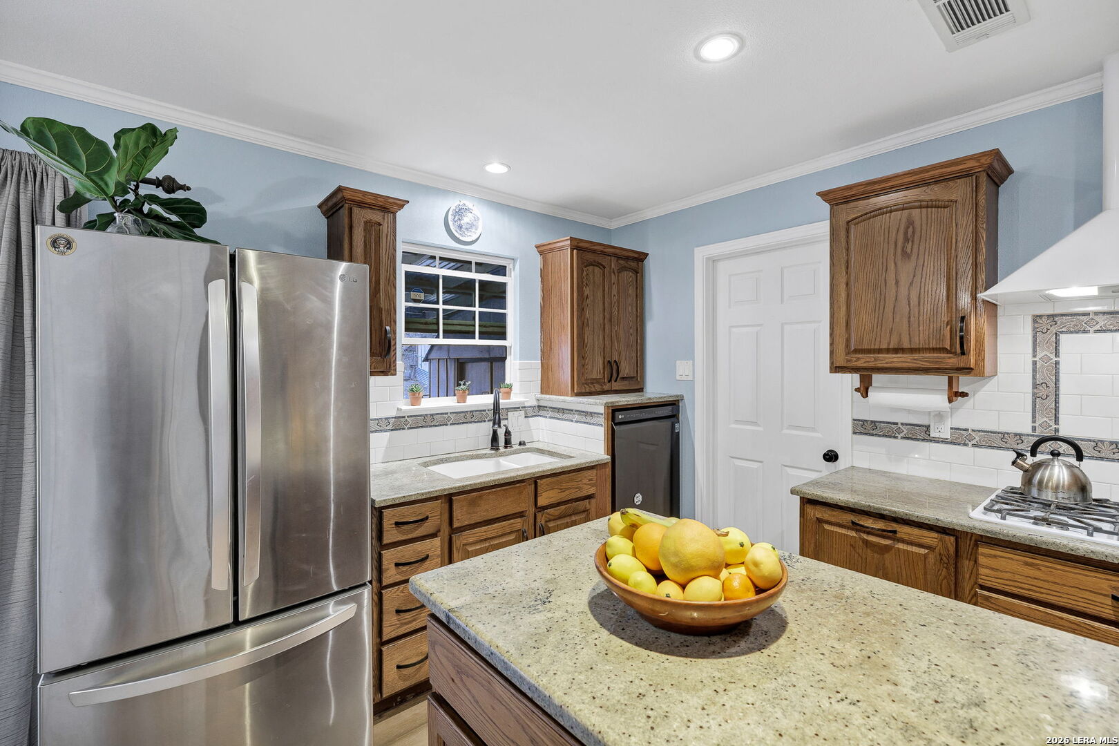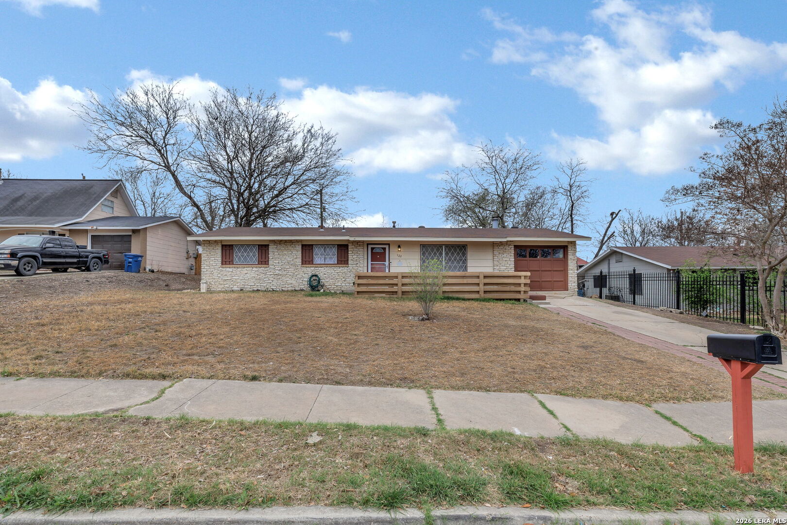 This beautifully renovated three-bedroom, two-bath home with a converted garage is perfectly situated near Lackland AFB. Inside, stylish luxury wood-look vinyl floors lead into a modern kitchen featuring tile backsplash, ceramic sink, and sleek Euro-style wall-mounted range hood. The bathrooms are tastefully updated, and fresh paint throughout creates a bright, welcoming vibe. A spacious family room with a cozy fireplace, plus a large, covered patio and backyard shed, make this move-in ready home a complete package.
