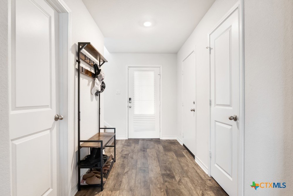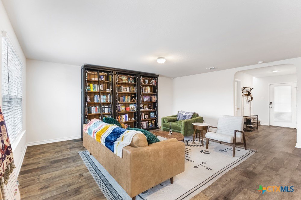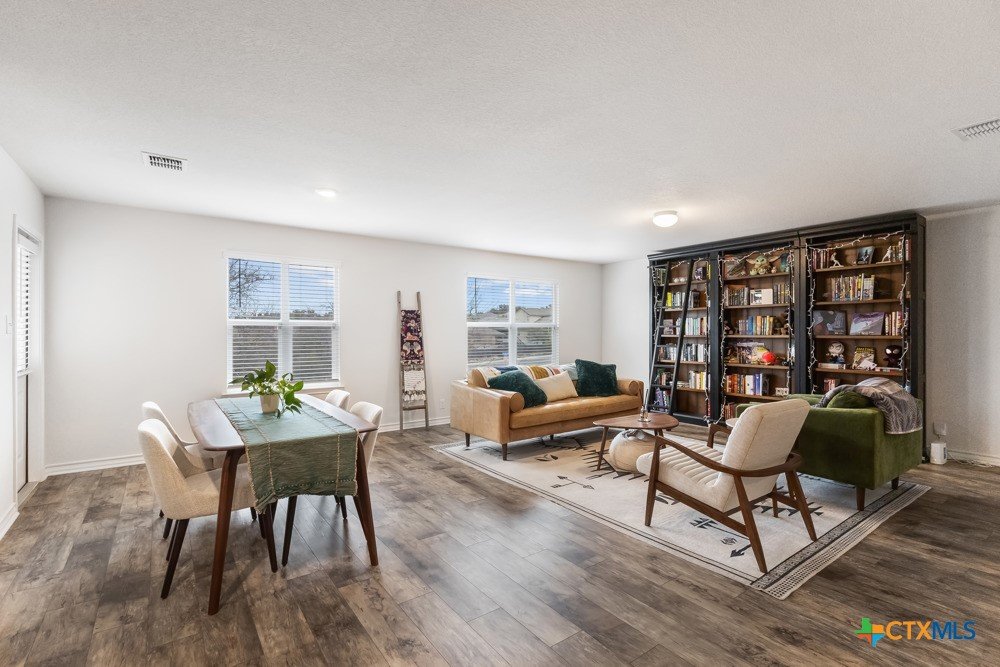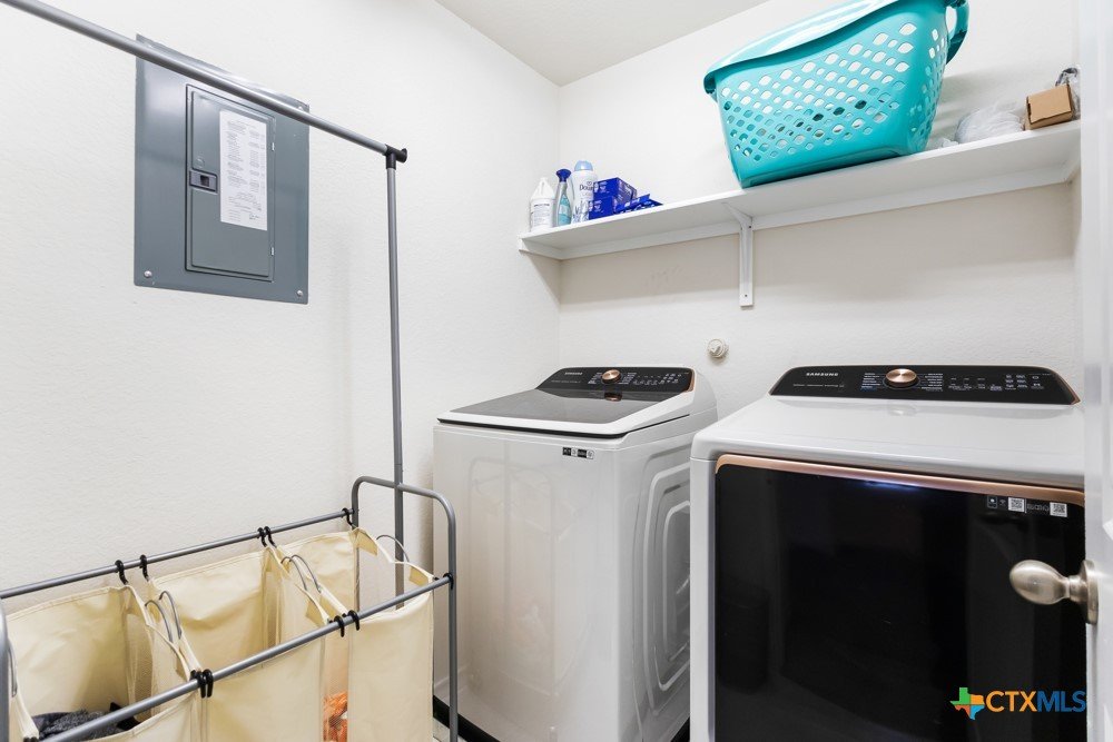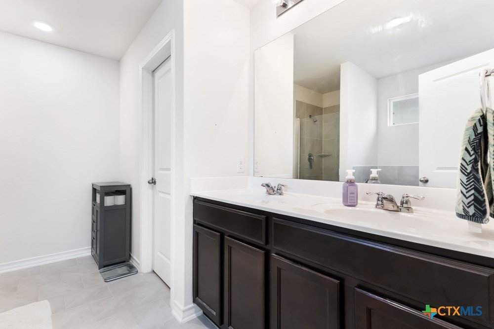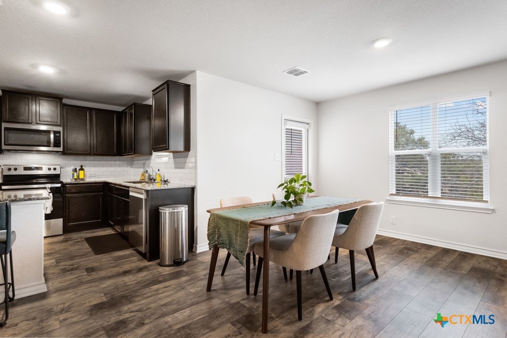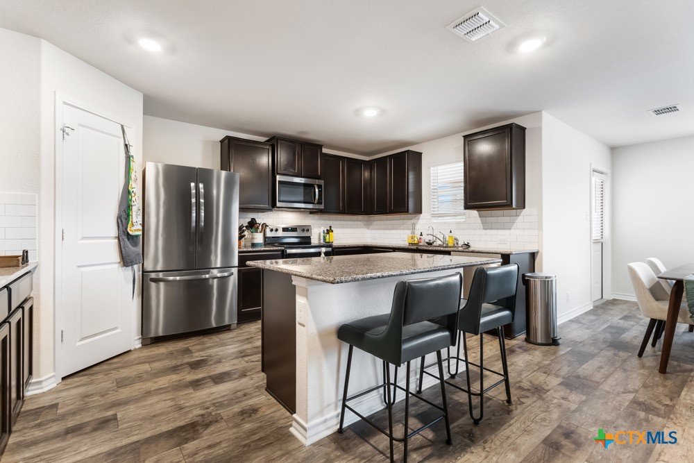 Beautiful two-story 3-bedroom, 2.5-bath home located in the Grosenbacher Ranch subdivision. As you enter from the covered front porch, you are welcomed by a spacious open floor plan featuring laminate flooring throughout the downstairs and a combined living and dining area-perfect for everyday living and entertaining. The spacious kitchen offers an abundance of cabinet and countertop space, classic white subway tile backsplash, recessed lighting, granite countertops, a center island, refrigerator, and stainless steel appliances. Upstairs, you'll find a generous family room/game room along with all three bedrooms. The primary bedroom features a full bath with double vanity, walk-in shower, and separate garden tub. Bedrooms two and three are nicely sized and share a hall bathroom with a tub/shower combo and single vanity. Step outside to the covered back porch with steps leading down to a great-sized backyard-ideal for outdoor enjoyment with no backyard neighbors. Conveniently situated near Loop 1604 and Potranco Road with easy access to shopping, dining, schools, and major highways. Washer, dryer, and water softener included.