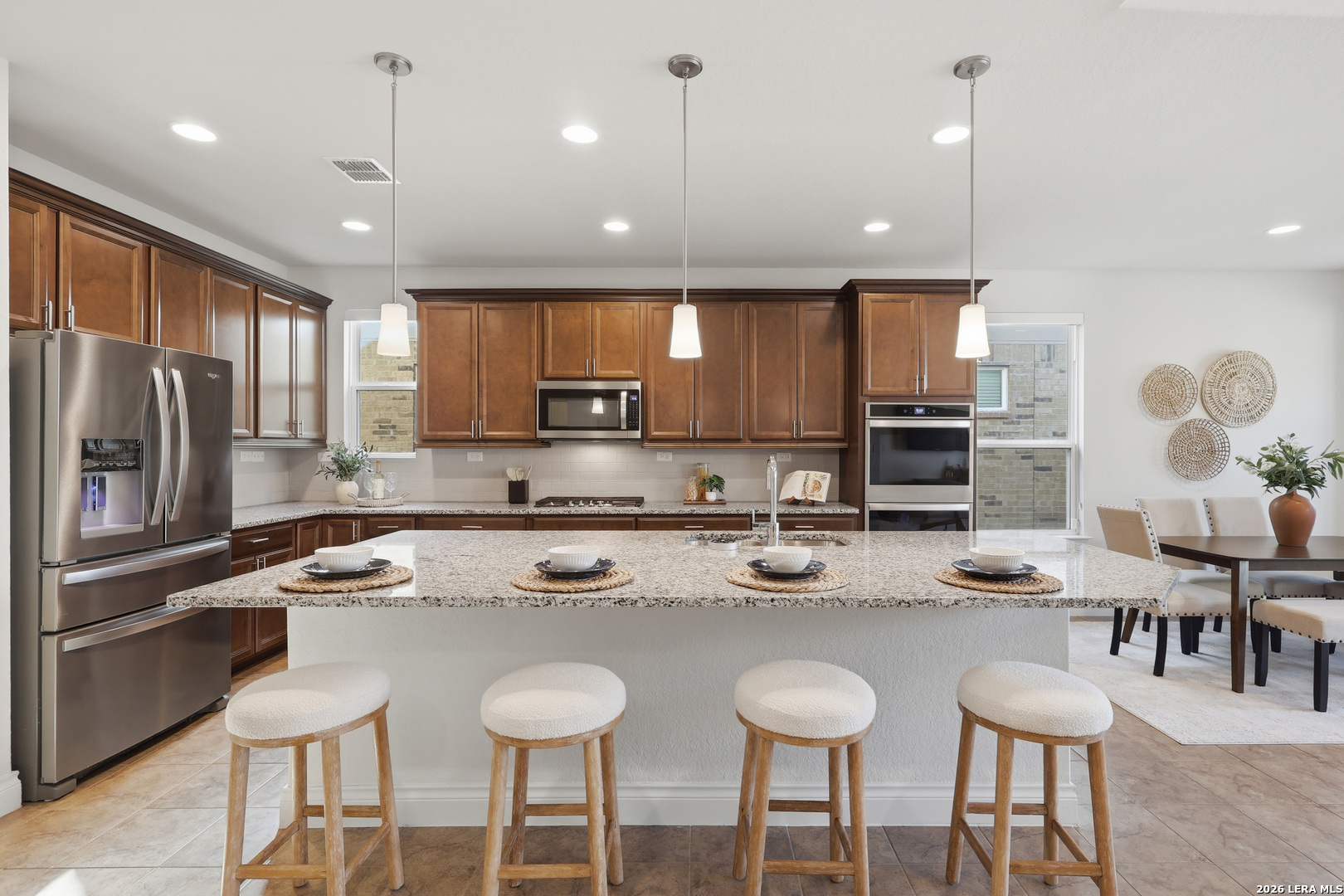 UNMATCHED SPACE & VALUE IN DAVIS RANCH! This 3449 Sq ft home offers 5 Bedrooms, 4 full bathrooms, a loft, huge media room, pocket office, and one of the best price-per-square foot opportunities in the area! A smart layout with both the primary suite and a secondary bedroom and full bath on the first floor. The inviting living room centers around a cozy fireplace, easily ignited by gas with a flick of a switch. The sleek kitchen is the heart of the home- complete with built in double ovens, a massive island, all stainless steel appliances are included, and the warm wood cabinets are stylish and like new! Downstairs also features a pocket office, drop zone, dedicated laundry room, and additional storage for everyday convenience. Upstairs you will find 3 more bedrooms, 2 full bathrooms, a spacious loft, and a huge media room ready for movie nights. Extra storage is abundant throughout, making it easy to stay organized. Thoughtful upgrades like a water softener and custom exterior lighting by Trimlight- perfect for year-round ambiance or holiday cheer- add both convenience and character. Enjoy a level backyard with an extended patio- perfect for relaxing, entertaining, or maybe even a future pool! Located in the desirable Davis Ranch community that backs up to the sprawling wilderness of Government Canyon State Park with miles of hiking trails. The neighborhood features two community pools, playgrounds, a pickleball court, and a plethora of community events. The highly rated Northside elementary and middle schools are within walking distance, and less than 2 miles to the new Sotomayor High School. If you have been searching for space, function, and value in one of San Antonio's most sought after areas- you found it! Book your tour today!