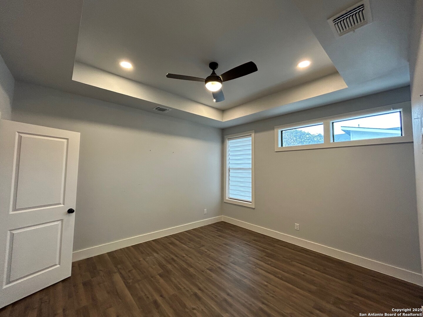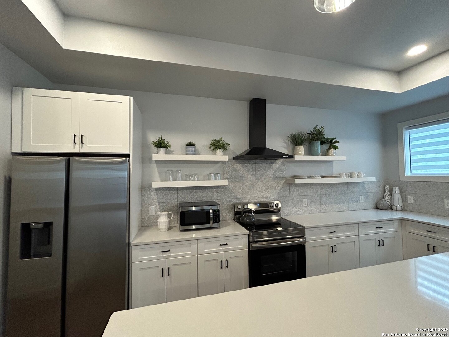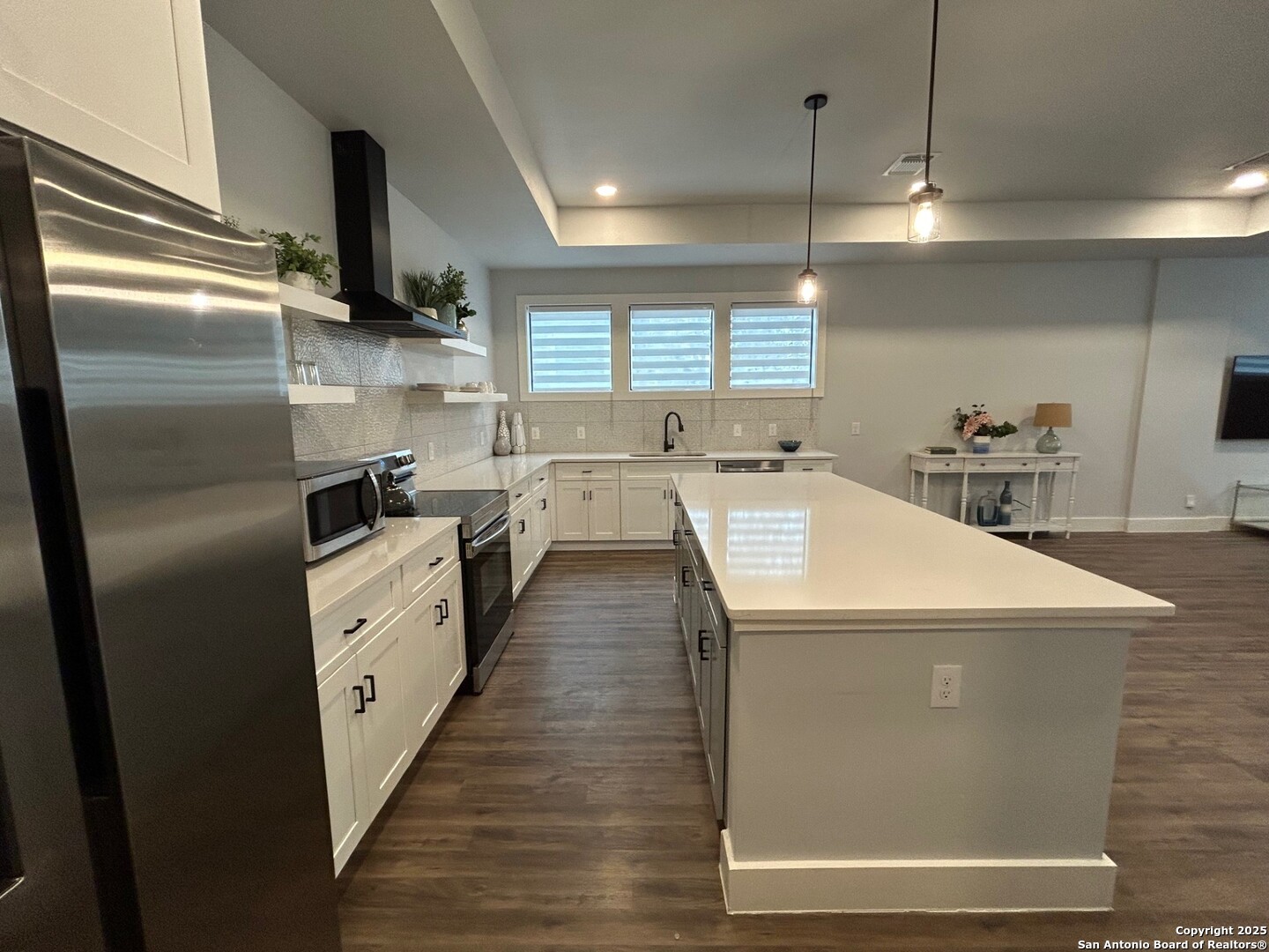 Partially Furnished 3BED/2.5 Bath Townhome Available NOW!! An open floor plan is highlighted by tray ceilings from the entertainer's living room to the outstanding kitchen. The modern residence features an open kitchen with bright, sparkling white countertops, island with breakfast bar, cabinetry that is already complete with black hardware, black vent-a-hood, floating shelves, classic backsplash, and stainless-steel appliances that flows into the dining and living area. The owner's retreat features walk-in closet, and en-suite bath featuring two separate vanity sinks, and walk-in subway tiled shower. Designed with modern selections presenting vinyl wood floors, ceramic mosaic tiles, and modern lighting including recessed can lights, pendants, and ceiling fans. Close proximity to local downtown attractions including the San Antonio Riverwalk, San Antonio Parks and Missions, Riverside Golf Course, Brooks City Base, local restaurants, and entertainment. Furniture and Decor Items in photos are included.