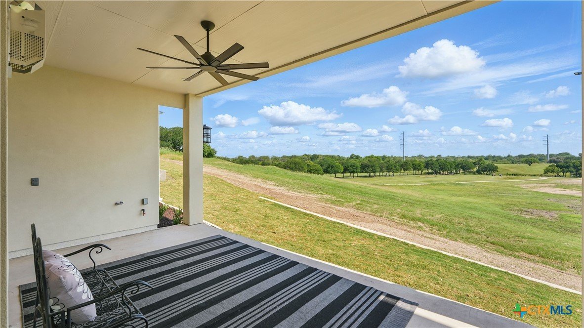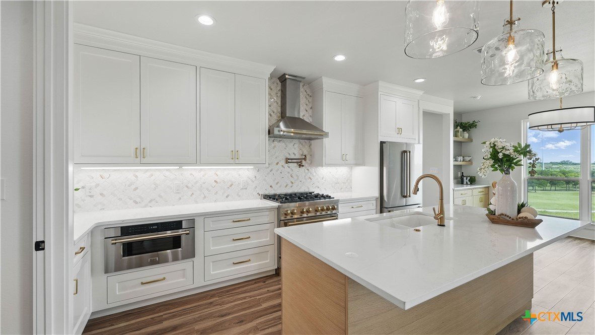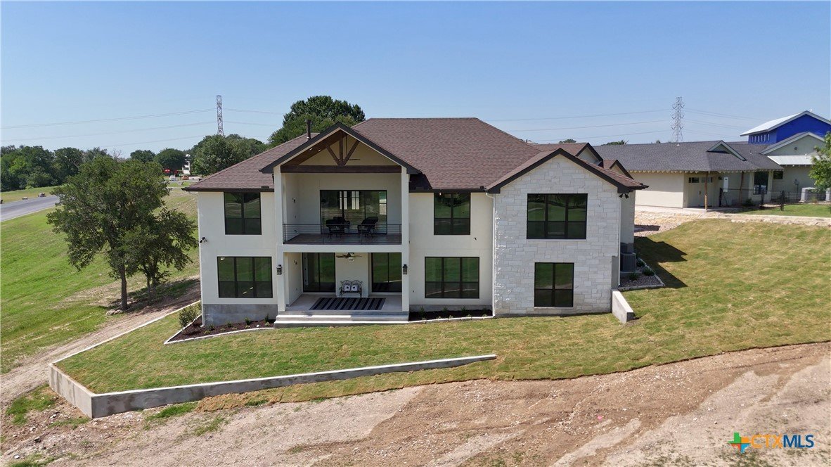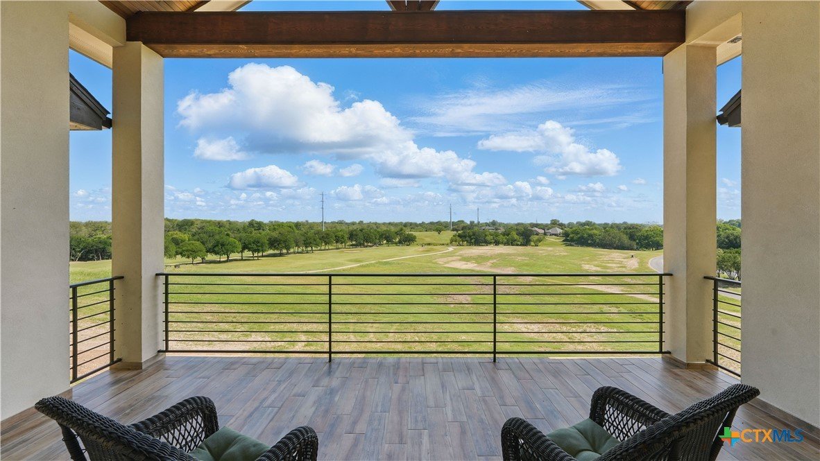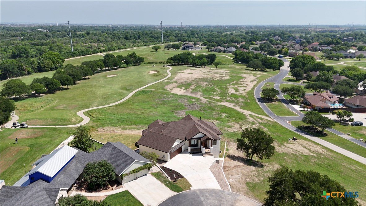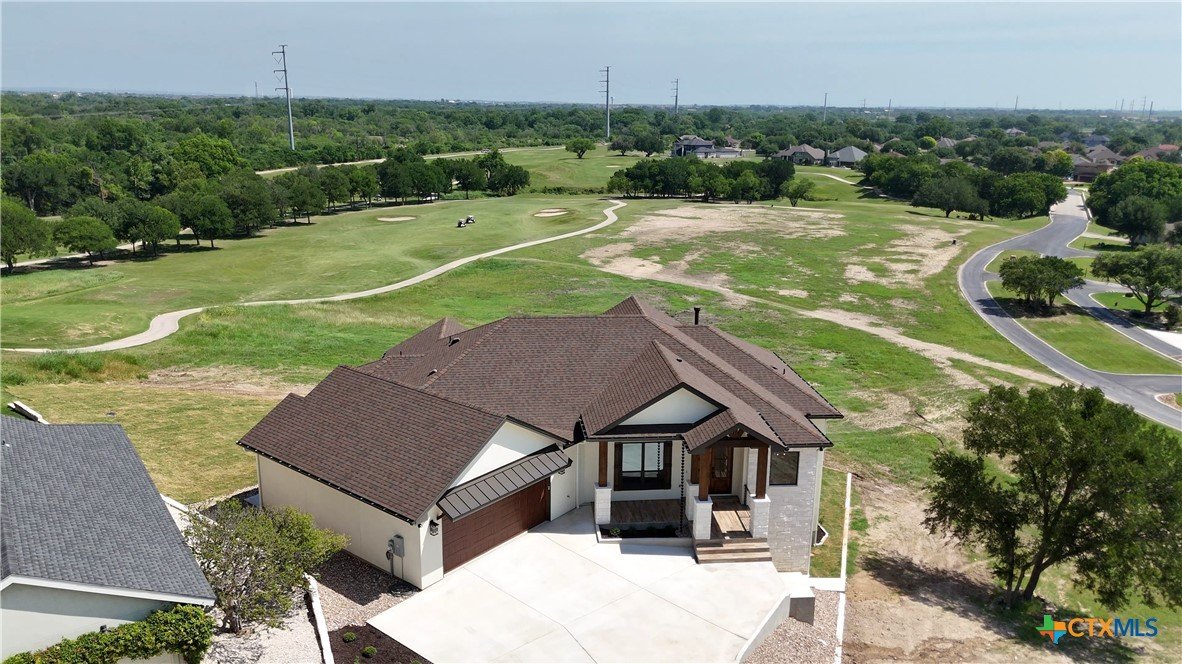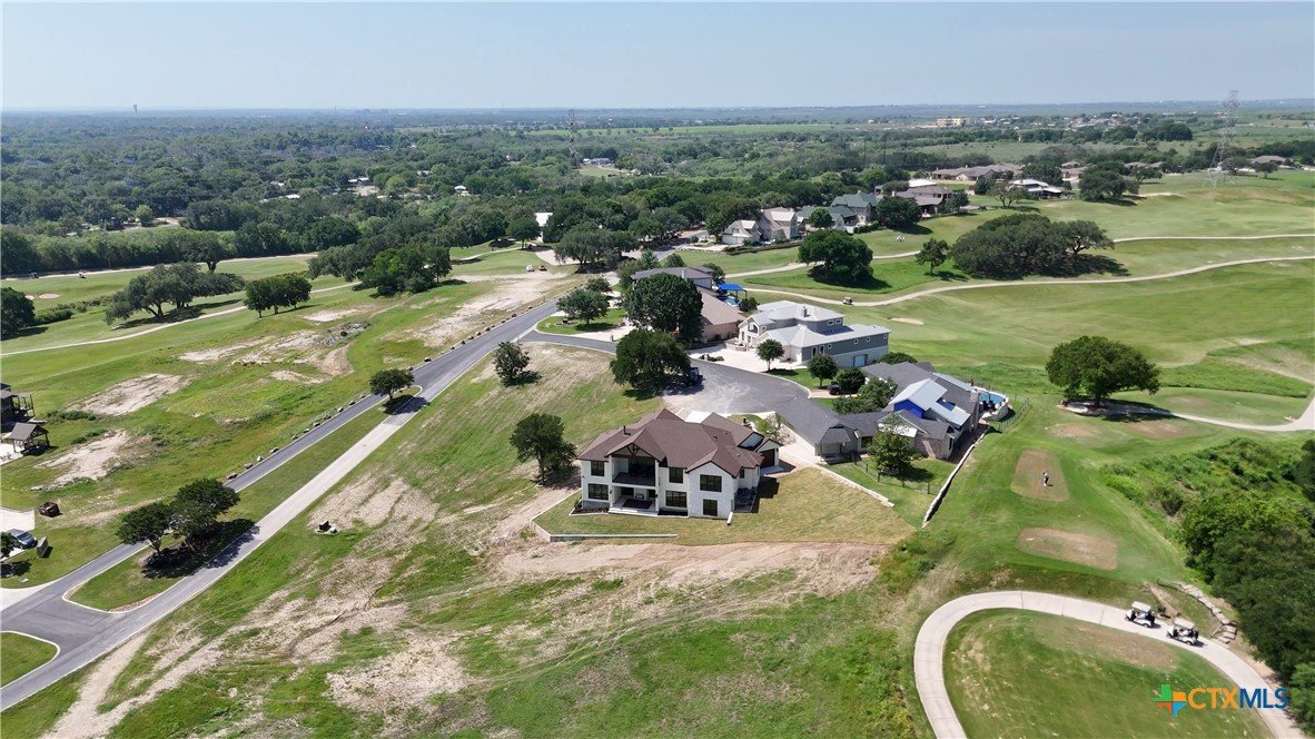 This stunning new build with exceptional views is located on the Bandit Golf Course. Built by Krug Construction LLC and designed by Krystle Weidner Designs, the first floor of this two story home features Mannington designer vinyl flooring and stair treads, a large kitchen with white custom cabinetry, quartz counter tops, a large island and coffee bar in white oak, marble backsplash tile, gold fixtures, and Zline designer appliances. The walk-in pantry has butcher block counters and room for small appliances as well as dry goods. The living area features a gas fireplace, logs and a marble surround, flanked on both sides with cabinetry and white oak shelving. The upstairs master suite has his and her closets. The master bath has tile flooring, white oak cabinetry, two separate vanities, a tiled shower, and a freestanding tub. The upstairs also features a second bedroom with a full bath down the hall, multiple closets, a mud room, utility room with a sink and cabinetry, and wrought iron rail on the stairway. The lower level features wood look tile throughout, a wet bar with granite counter tops and a full refrigerator, a large living area with a masonry gas fireplace and logs, a separate office, large storage room, multiple closets, a half-bath, and two large carpeted bedrooms with walk-in closets and attached bathrooms. The exterior of the home is stucco and white rock, with bronze accents. The 2 1/2 car garage has a separate door for a golf cart. The walk out balcony on the upper level has a cathedral stained wood ceiling, tiled flooring, and custom wrought iron railing. The lower level has two six foot french doors that walk out to a covered patio which steps down into a fully landscaped yard. The Electric company is GVEC and the water and sewer are Green Valley SUD. The Long Creek HOA has a river park with a covered picnic area, and access to Lake McQueeney. The Bandit Clubhouse is one block from the house.