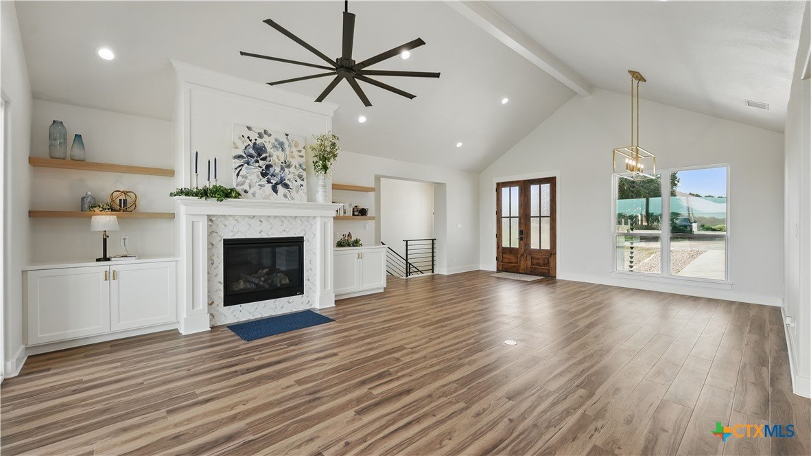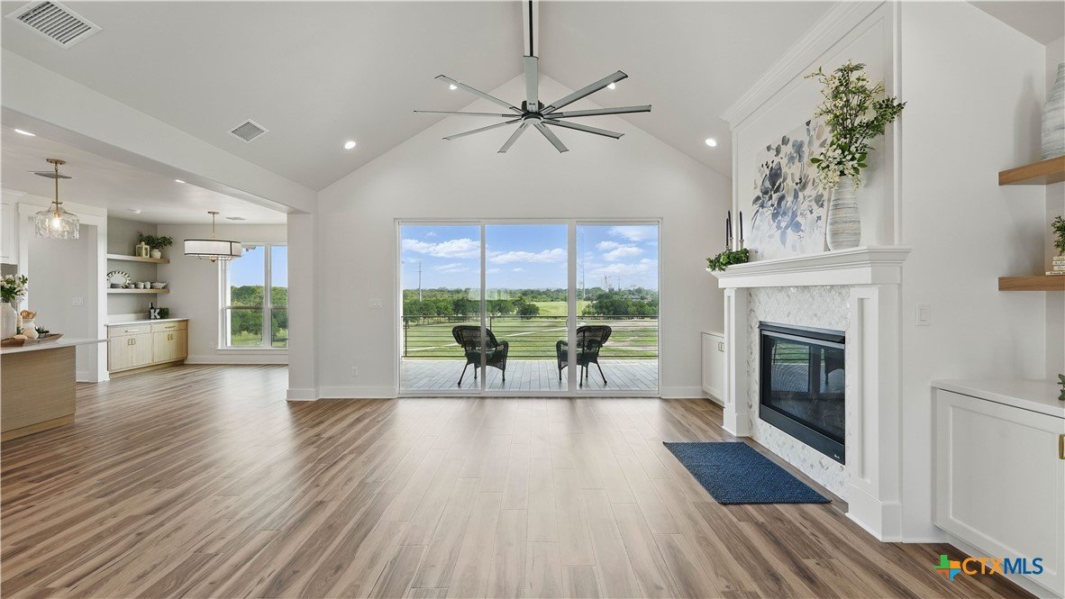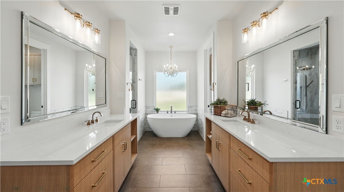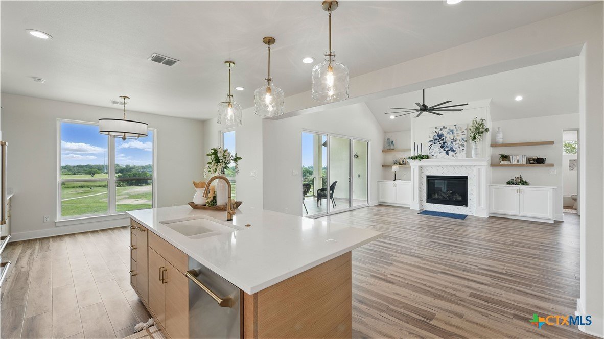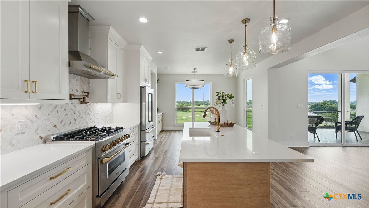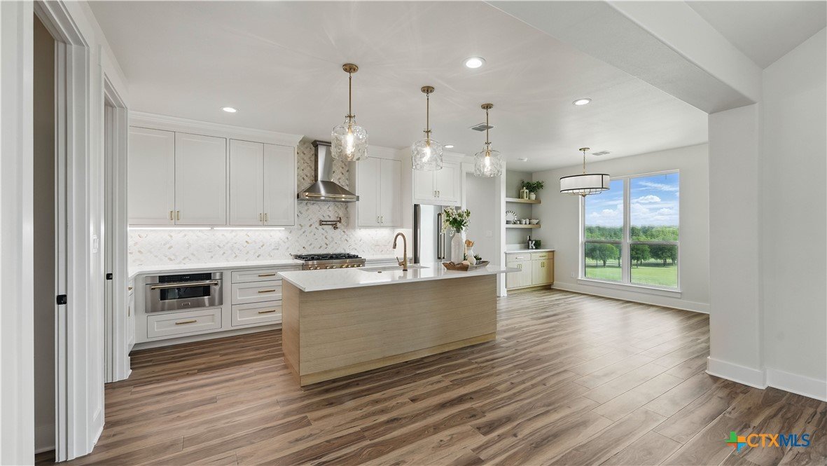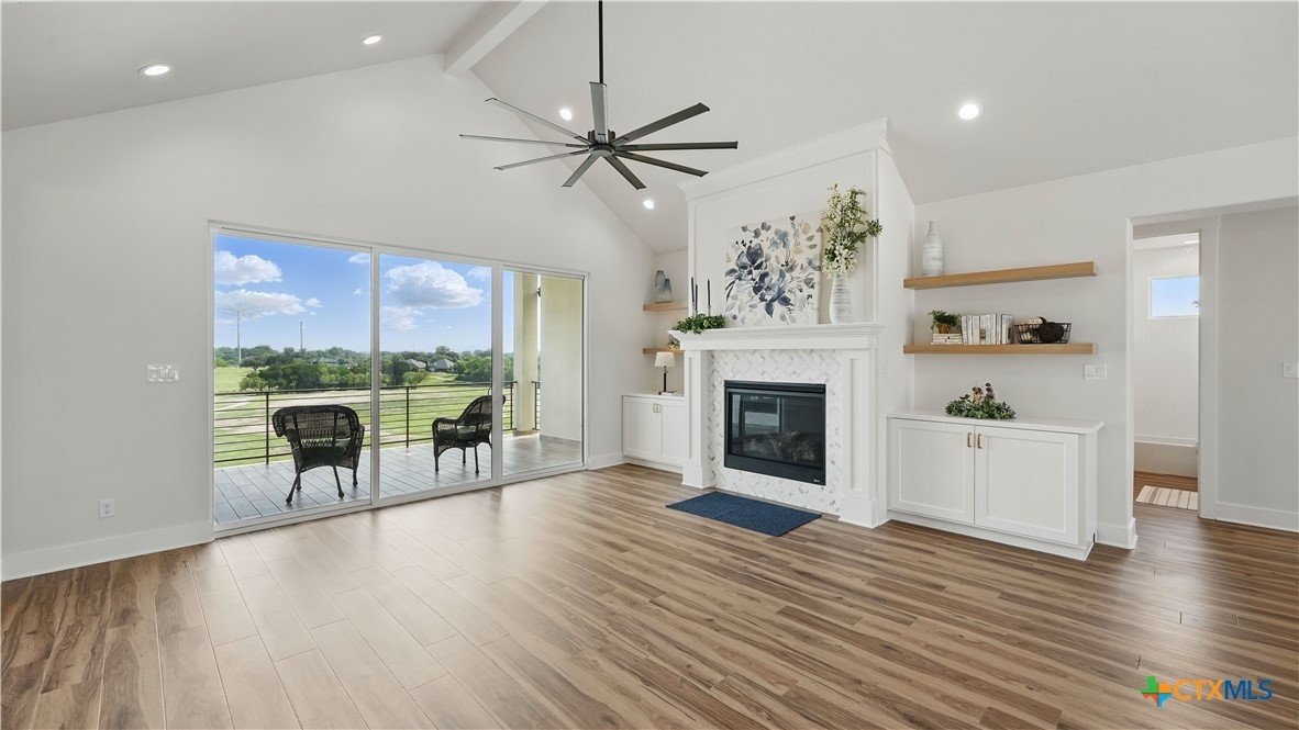 This stunning new build with exceptional views is located on the Bandit Golf Course. Built by Krug Construction LLC and designed by Krystle Weidner Designs, the first floor of this two story home features Mannington designer vinyl flooring and stair treads, a large kitchen with white custom cabinetry, quartz counter tops, a large island and coffee bar in white oak, marble backsplash tile, gold fixtures, and Zline designer appliances. The walk-in pantry has butcher block counters and room for small appliances as well as dry goods. The living area features a gas fireplace, logs and a marble surround, flanked on both sides with cabinetry and white oak shelving. The upstairs master suite has his and her closets. The master bath has tile flooring, white oak cabinetry, two separate vanities, a tiled shower, and a freestanding tub. The upstairs also features a second bedroom with a full bath down the hall, multiple closets, a mud room, utility room with a sink and cabinetry, and wrought iron rail on the stairway. The lower level features wood look tile throughout, a wet bar with granite counter tops and a full refrigerator, a large living area with a masonry gas fireplace and logs, a separate office, large storage room, multiple closets, a half-bath, and two large carpeted bedrooms with walk-in closets and attached bathrooms. The exterior of the home is stucco and white rock, with bronze accents. The 2 1/2 car garage has a separate door for a golf cart. The walk out balcony on the upper level has a cathedral stained wood ceiling, tiled flooring, and custom wrought iron railing. The lower level has two six foot french doors that walk out to a covered patio which steps down into a fully landscaped yard. The Electric company is GVEC and the water and sewer are Green Valley SUD. The Long Creek HOA has a river park with a covered picnic area, and access to Lake McQueeney. The Bandit Clubhouse is one block from the house.