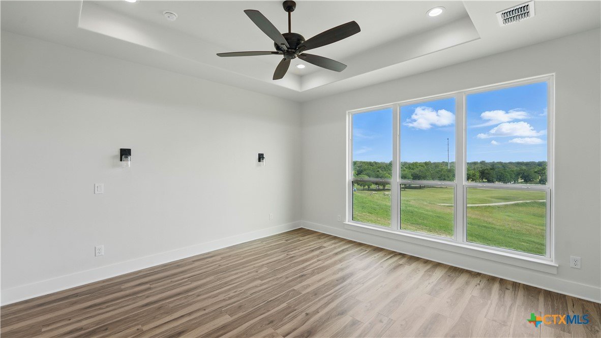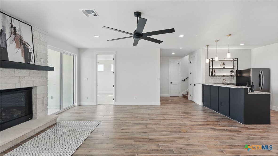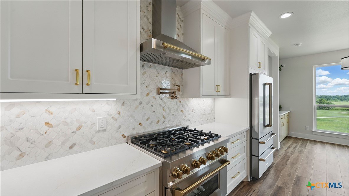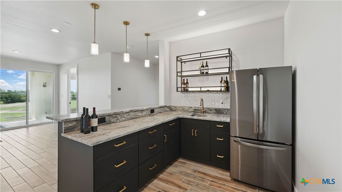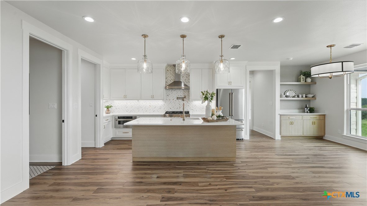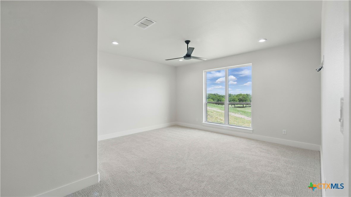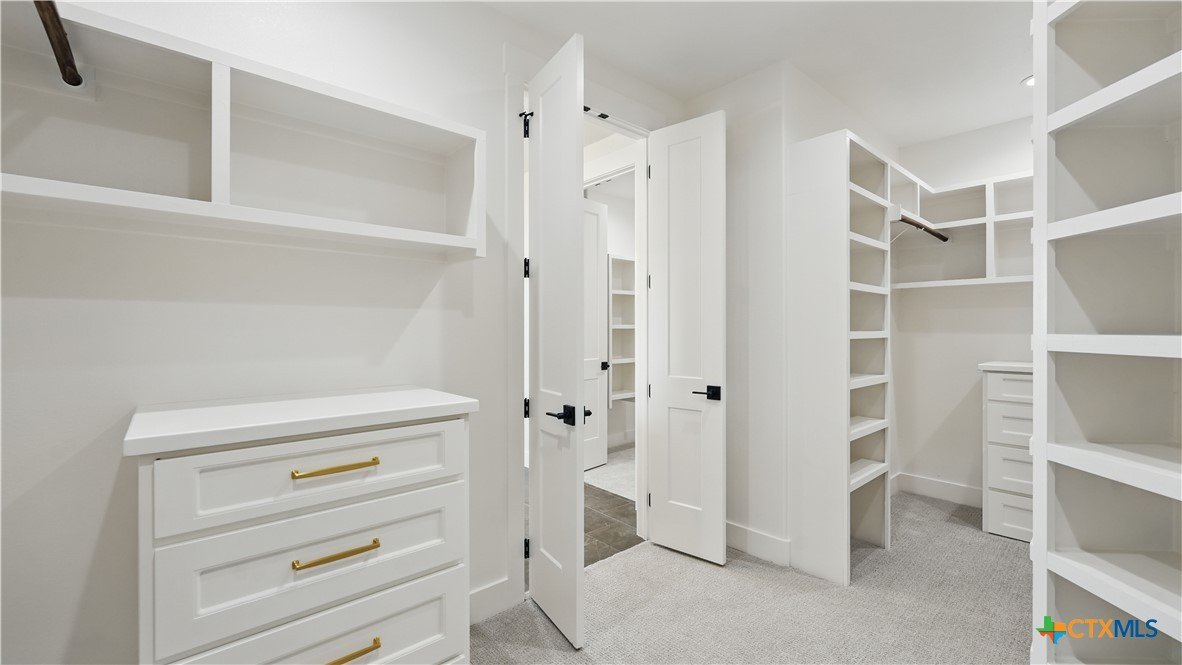 This stunning new build with exceptional views is located on the Bandit Golf Course. Built by Krug Construction LLC and designed by Krystle Weidner Designs, the first floor of this two story home features Mannington designer vinyl flooring and stair treads, a large kitchen with white custom cabinetry, quartz counter tops, a large island and coffee bar in white oak, marble backsplash tile, gold fixtures, and Zline designer appliances. The walk-in pantry has butcher block counters and room for small appliances as well as dry goods. The living area features a gas fireplace, logs and a marble surround, flanked on both sides with cabinetry and white oak shelving. The upstairs master suite has his and her closets. The master bath has tile flooring, white oak cabinetry, two separate vanities, a tiled shower, and a freestanding tub. The upstairs also features a second bedroom with a full bath down the hall, multiple closets, a mud room, utility room with a sink and cabinetry, and wrought iron rail on the stairway. The lower level features wood look tile throughout, a wet bar with granite counter tops and a full refrigerator, a large living area with a masonry gas fireplace and logs, a separate office, large storage room, multiple closets, a half-bath, and two large carpeted bedrooms with walk-in closets and attached bathrooms. The exterior of the home is stucco and white rock, with bronze accents. The 2 1/2 car garage has a separate door for a golf cart. The walk out balcony on the upper level has a cathedral stained wood ceiling, tiled flooring, and custom wrought iron railing. The lower level has two six foot french doors that walk out to a covered patio which steps down into a fully landscaped yard. The Electric company is GVEC and the water and sewer are Green Valley SUD. The Long Creek HOA has a river park with a covered picnic area, and access to Lake McQueeney. The Bandit Clubhouse is one block from the house.