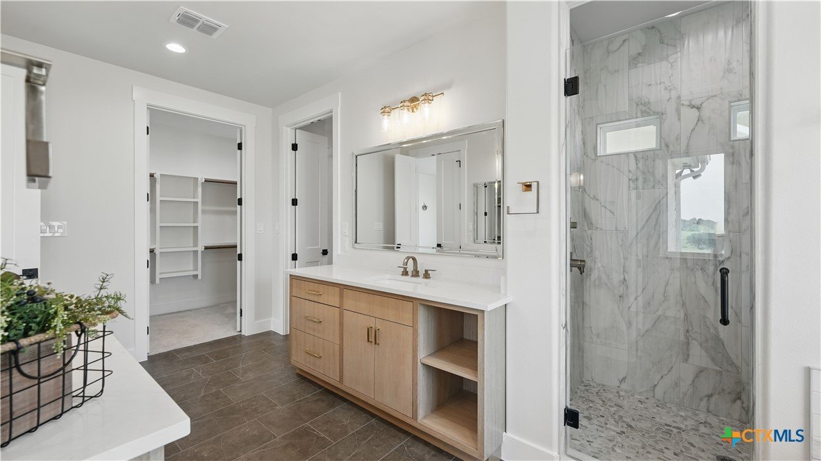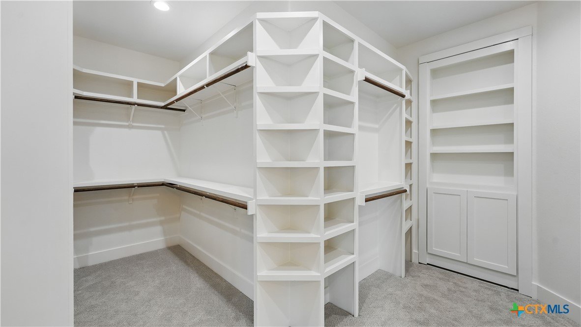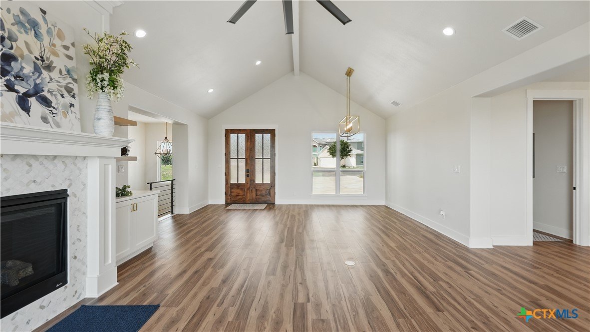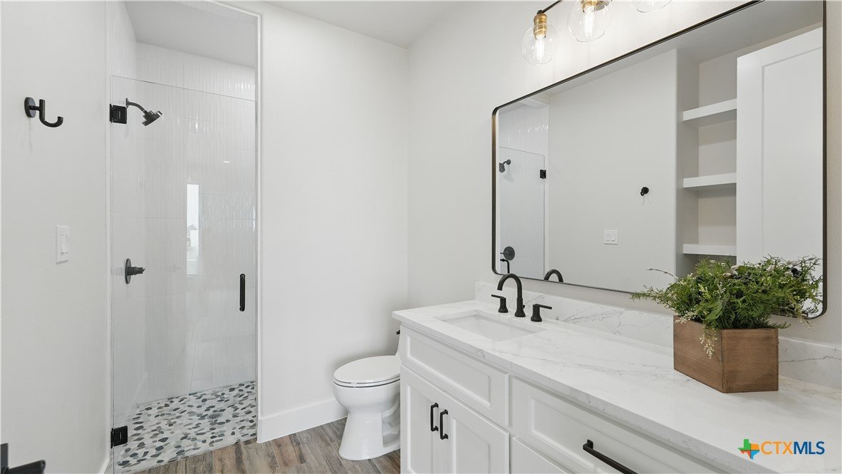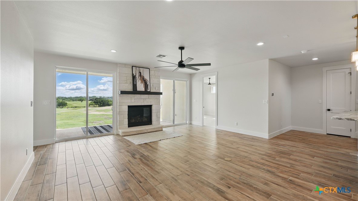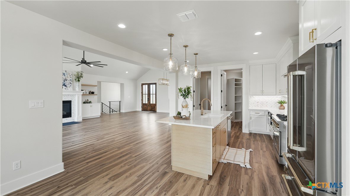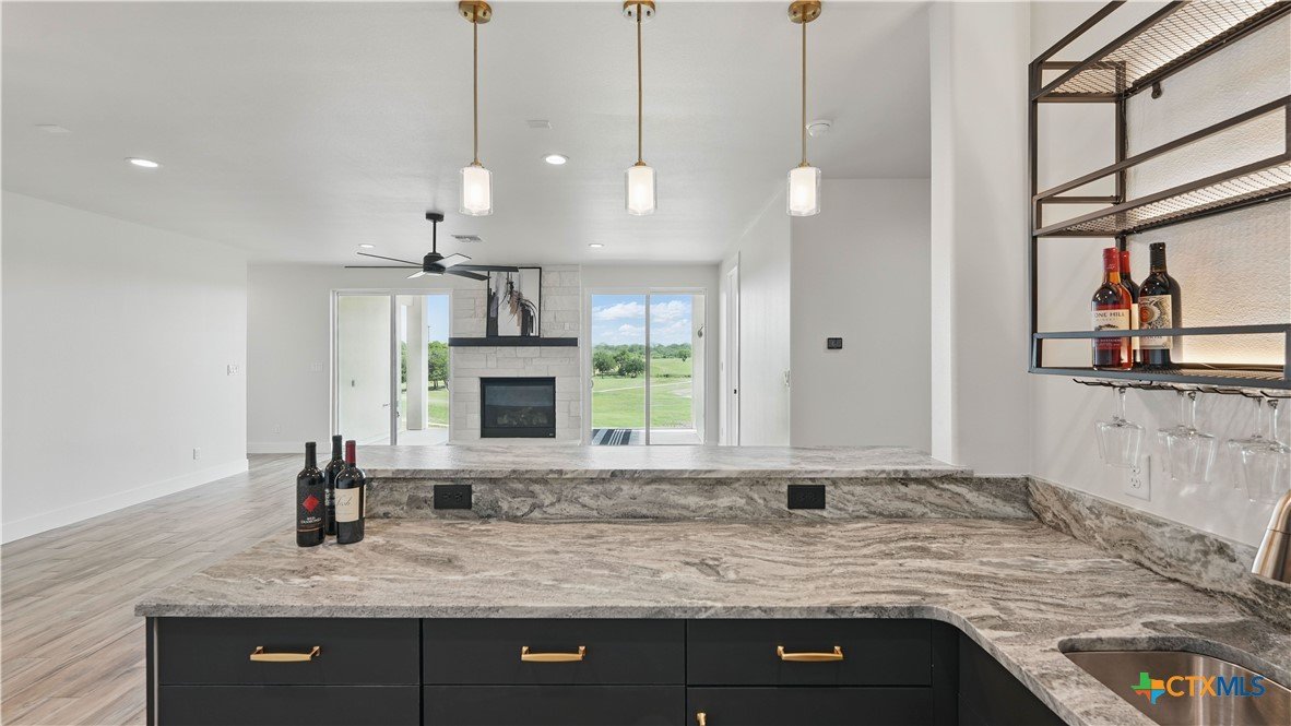 This stunning new build with exceptional views is located on the Bandit Golf Course. Built by Krug Construction LLC and designed by Krystle Weidner Designs, the first floor of this two story home features Mannington designer vinyl flooring and stair treads, a large kitchen with white custom cabinetry, quartz counter tops, a large island and coffee bar in white oak, marble backsplash tile, gold fixtures, and Zline designer appliances. The walk-in pantry has butcher block counters and room for small appliances as well as dry goods. The living area features a gas fireplace, logs and a marble surround, flanked on both sides with cabinetry and white oak shelving. The upstairs master suite has his and her closets. The master bath has tile flooring, white oak cabinetry, two separate vanities, a tiled shower, and a freestanding tub. The upstairs also features a second bedroom with a full bath down the hall, multiple closets, a mud room, utility room with a sink and cabinetry, and wrought iron rail on the stairway. The lower level features wood look tile throughout, a wet bar with granite counter tops and a full refrigerator, a large living area with a masonry gas fireplace and logs, a separate office, large storage room, multiple closets, a half-bath, and two large carpeted bedrooms with walk-in closets and attached bathrooms. The exterior of the home is stucco and white rock, with bronze accents. The 2 1/2 car garage has a separate door for a golf cart. The walk out balcony on the upper level has a cathedral stained wood ceiling, tiled flooring, and custom wrought iron railing. The lower level has two six foot french doors that walk out to a covered patio which steps down into a fully landscaped yard. The Electric company is GVEC and the water and sewer are Green Valley SUD. The Long Creek HOA has a river park with a covered picnic area, and access to Lake McQueeney. The Bandit Clubhouse is one block from the house.