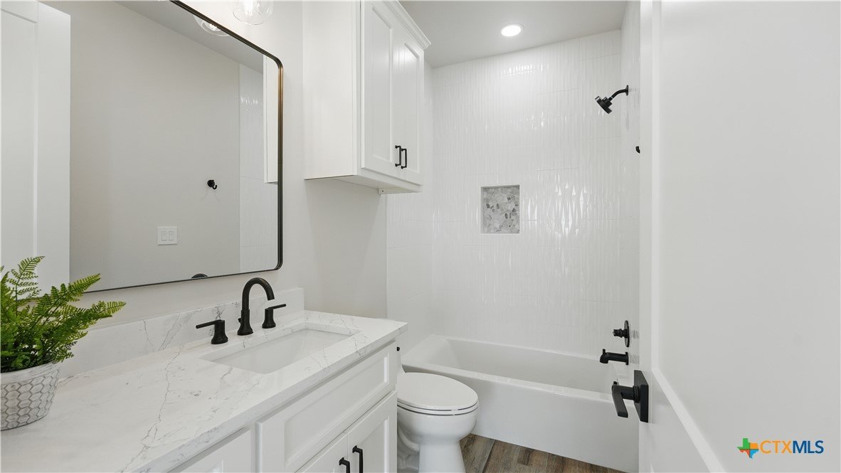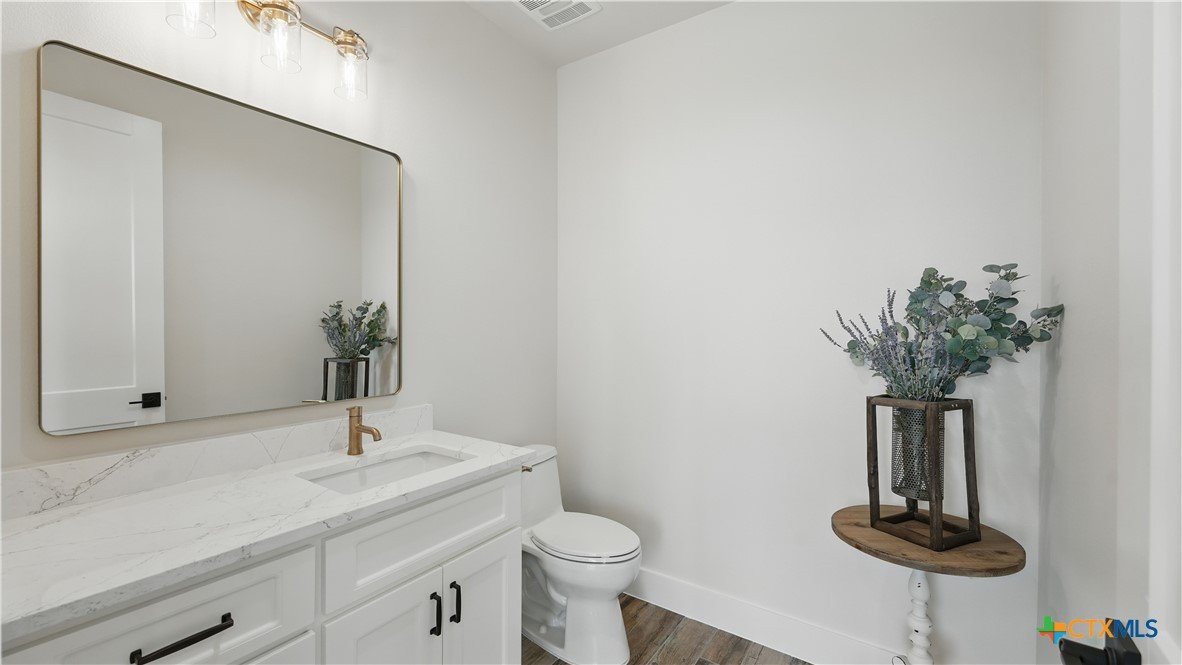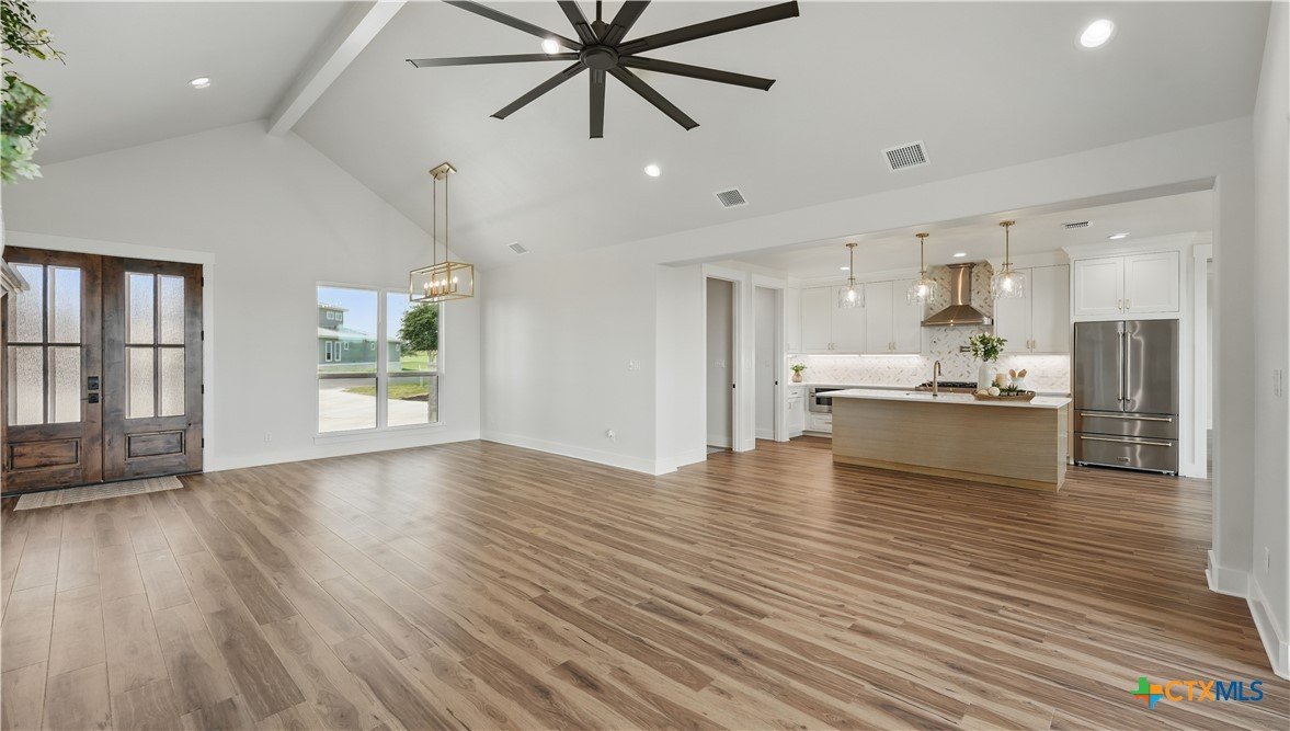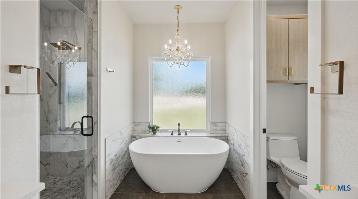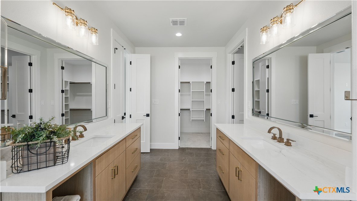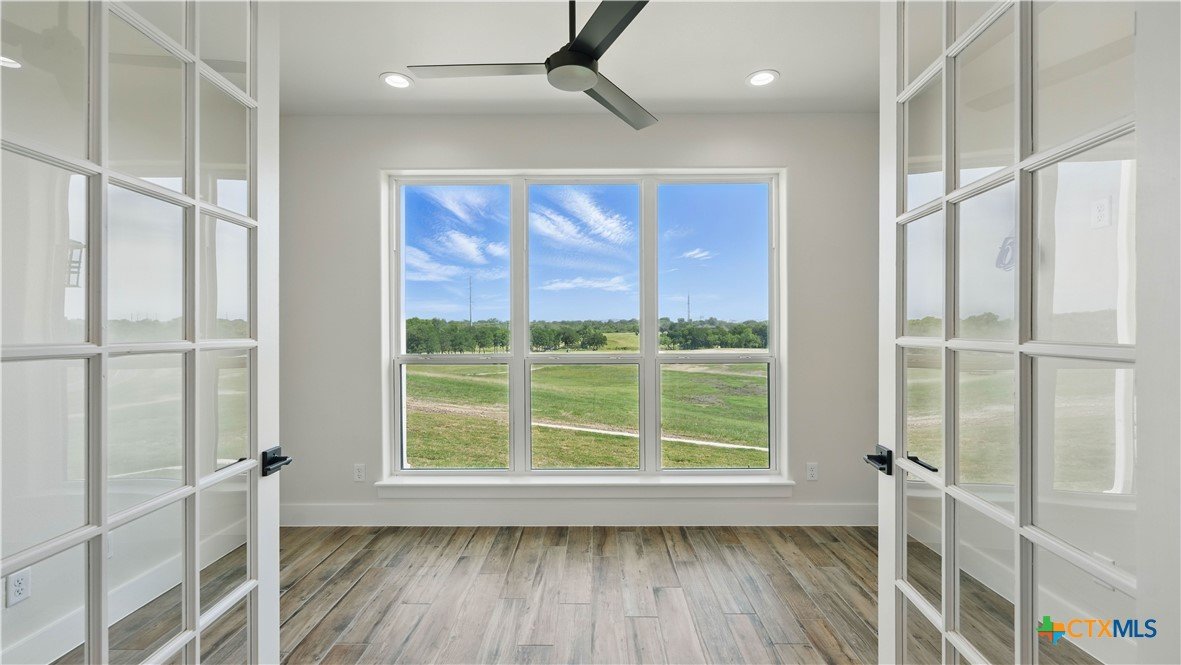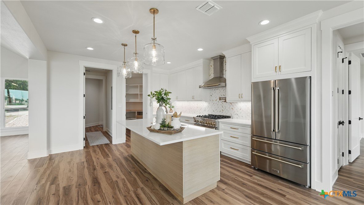 This stunning new build with exceptional views is located on the Bandit Golf Course. Built by Krug Construction LLC and designed by Krystle Weidner Designs, the first floor of this two story home features Mannington designer vinyl flooring and stair treads, a large kitchen with white custom cabinetry, quartz counter tops, a large island and coffee bar in white oak, marble backsplash tile, gold fixtures, and Zline designer appliances. The walk-in pantry has butcher block counters and room for small appliances as well as dry goods. The living area features a gas fireplace, logs and a marble surround, flanked on both sides with cabinetry and white oak shelving. The upstairs master suite has his and her closets. The master bath has tile flooring, white oak cabinetry, two separate vanities, a tiled shower, and a freestanding tub. The upstairs also features a second bedroom with a full bath down the hall, multiple closets, a mud room, utility room with a sink and cabinetry, and wrought iron rail on the stairway. The lower level features wood look tile throughout, a wet bar with granite counter tops and a full refrigerator, a large living area with a masonry gas fireplace and logs, a separate office, large storage room, multiple closets, a half-bath, and two large carpeted bedrooms with walk-in closets and attached bathrooms. The exterior of the home is stucco and white rock, with bronze accents. The 2 1/2 car garage has a separate door for a golf cart. The walk out balcony on the upper level has a cathedral stained wood ceiling, tiled flooring, and custom wrought iron railing. The lower level has two six foot french doors that walk out to a covered patio which steps down into a fully landscaped yard. The Electric company is GVEC and the water and sewer are Green Valley SUD. The Long Creek HOA has a river park with a covered picnic area, and access to Lake McQueeney. The Bandit Clubhouse is one block from the house.