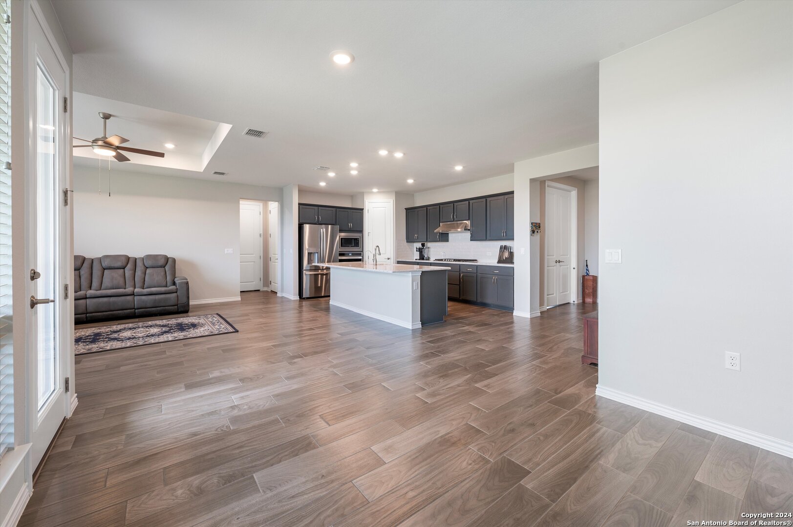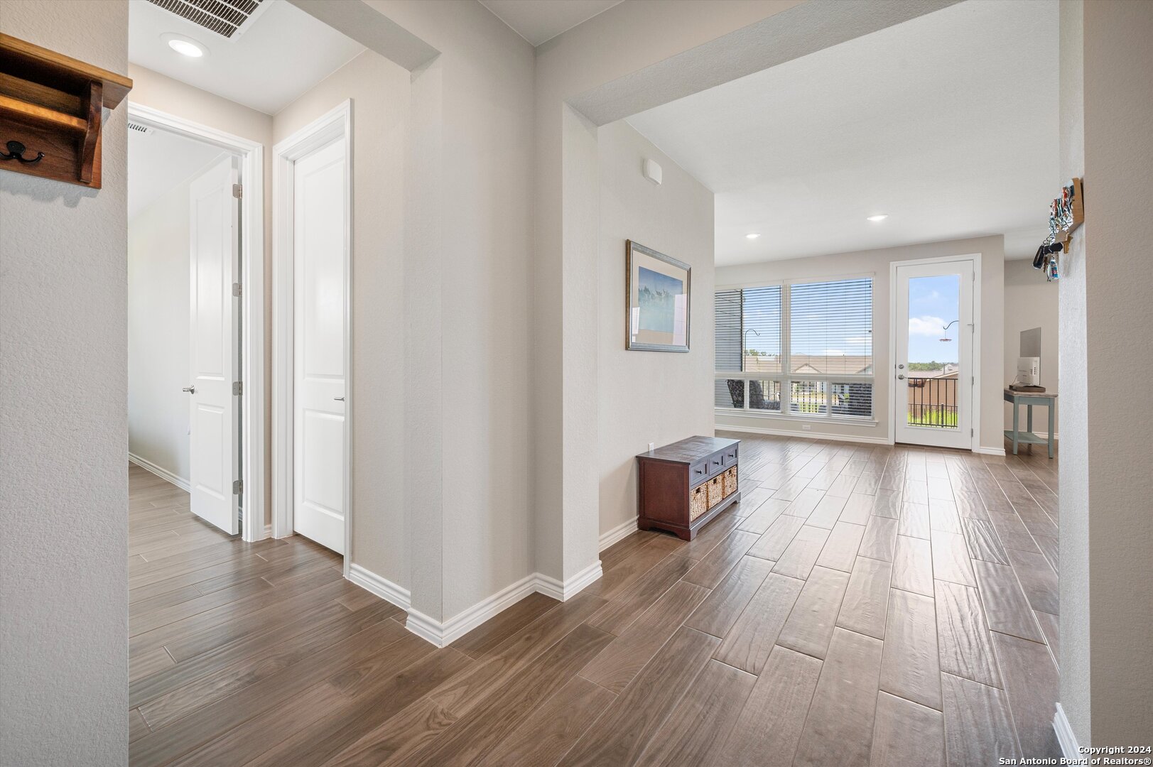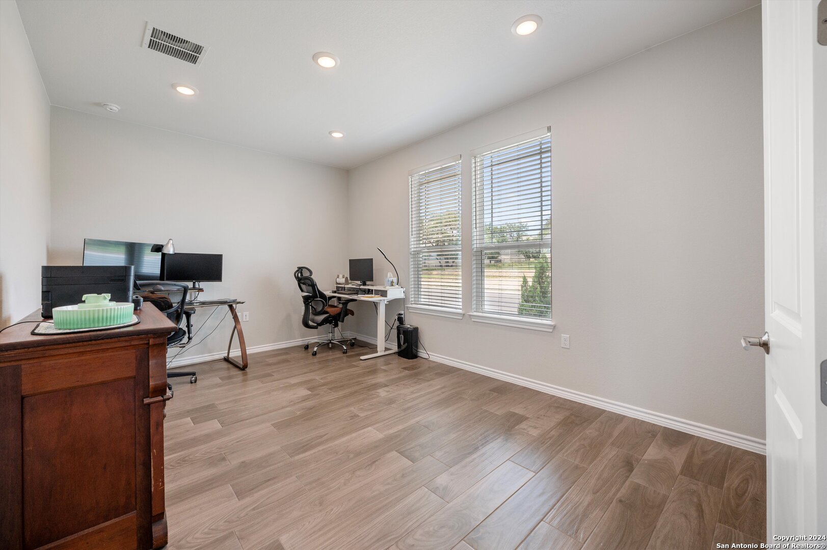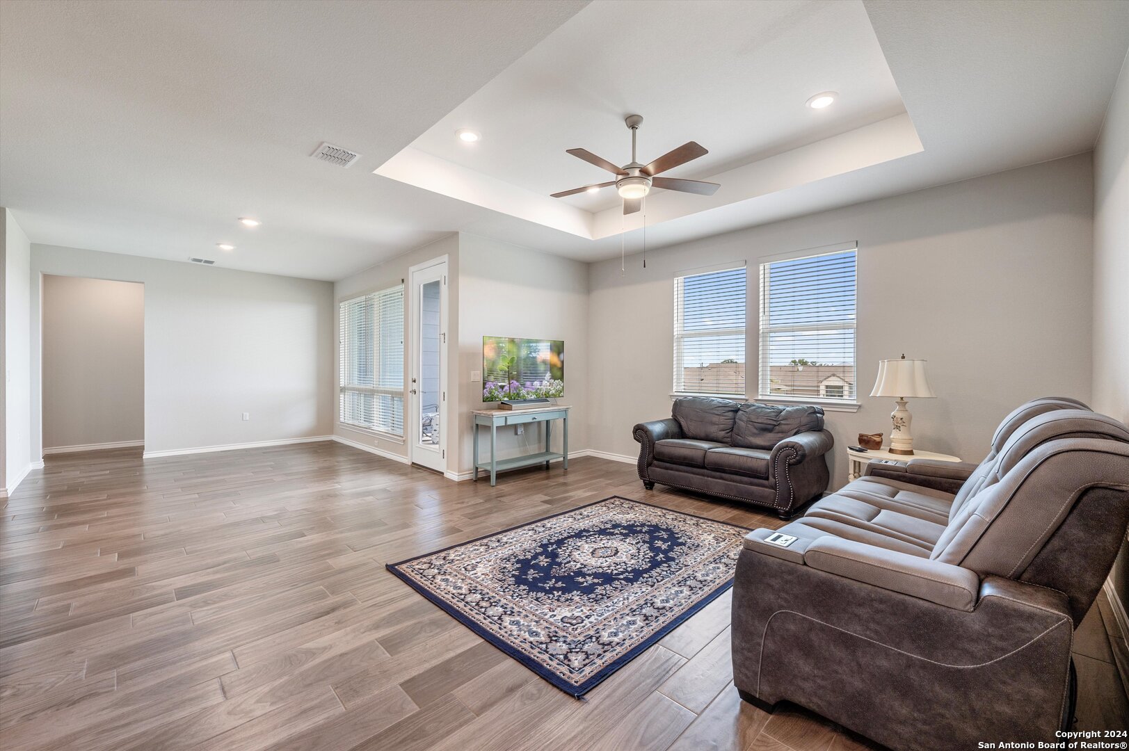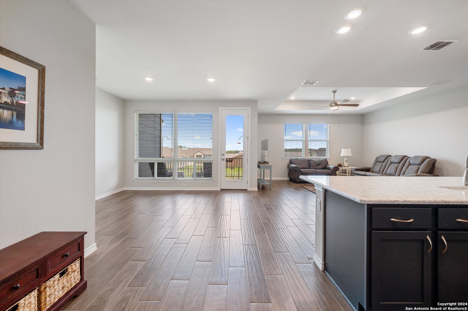 Welcome to this beautiful 2-bedroom, 2-bathroom Cottage with den/study in the highly desirable Kissing Tree community, designed exclusively for residents aged 55 and older. Boasting 1787 square feet of thoughtfully crafted living space, this home offers a blend of elegance,functionality, and modern upgrades that cater to a sophisticated lifestyle. As you step inside, you'll be greeted by an airy, open-concept living space with high ceilings and abundant natural light. The heart of the home is the large and upgraded kitchen, which features top-of-the-line appliances including a built-in oven, microwave, gas cooktop, refrigerator, and a convenient RO water filtration system. The countertops and spacious kitchen island have been tastefully upgraded to luxurious Quartz, providing both style and durability for all your culinary adventures. As you explore further, you'll notice the attention to detail in every corner, from the whole-home wood-look tile flooring to the 8-foot doors, to the tray ceilings in the primary bedroom and living room that add a touch of grandeur. The primary bathroom is a sanctuary of relaxation with separate vanities, a generously sized walk-in shower with a mud-set tile floor, and a stand-alone tub for soaking away the days stresses. Off the dining room, the covered patio beckons you to unwind and entertain, with a gas stub connection provided for creating your outdoor grilling haven. Enjoy the serene backdrop of greenspace behind the home, ensuring privacy and tranquility. Living in Kissing Tree offers more than a beautiful home; is a lifestyle upgrade. Enjoy peace of mind with 24/7 security staff and gated entrances. The amenities are second to none with multiple pools, a state-of-the-art workout facility, 10+ pickleball courts, a challenging golf course, scenic walking trails, a full-service restaurant, a vibrant entertainment area, and engaging activities to keep you entertained and connected to your community. Immerse yourself in the vibrant community of Kissing Tree, where every day offers new opportunities for relaxation, recreation, and social connections. Don't miss out on the chance to make this exceptional property your own and experience the best that 55+ living has to offer.