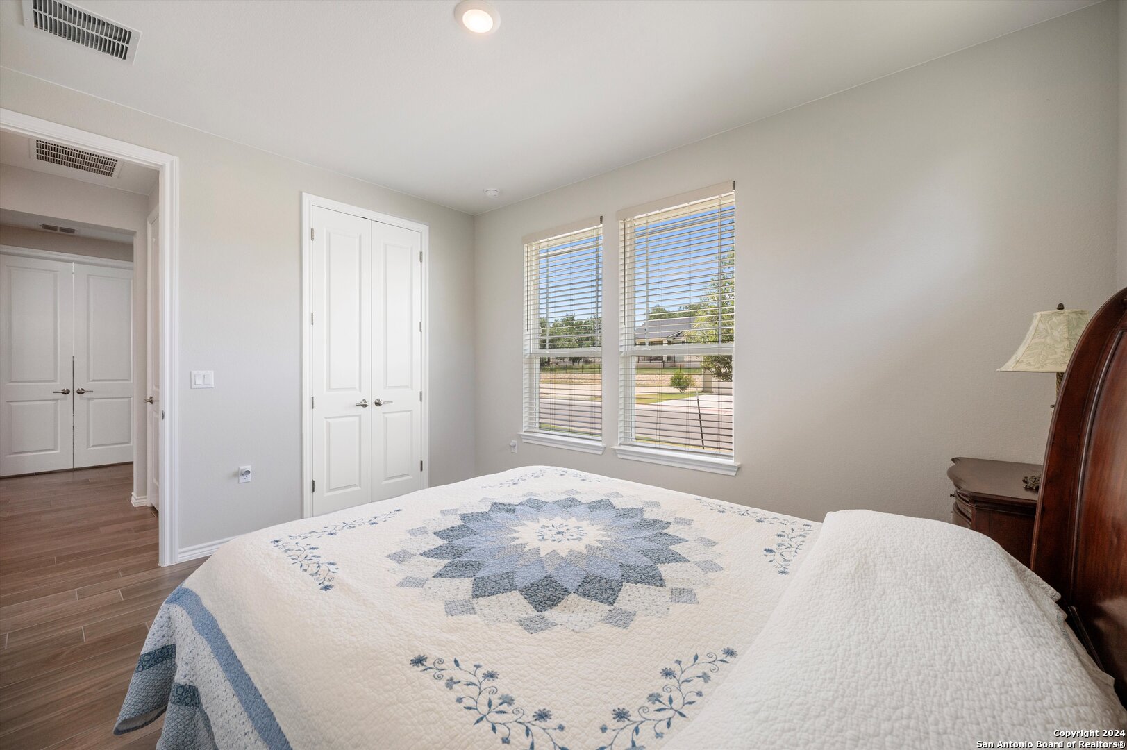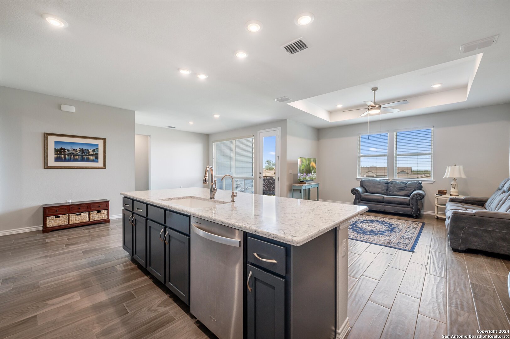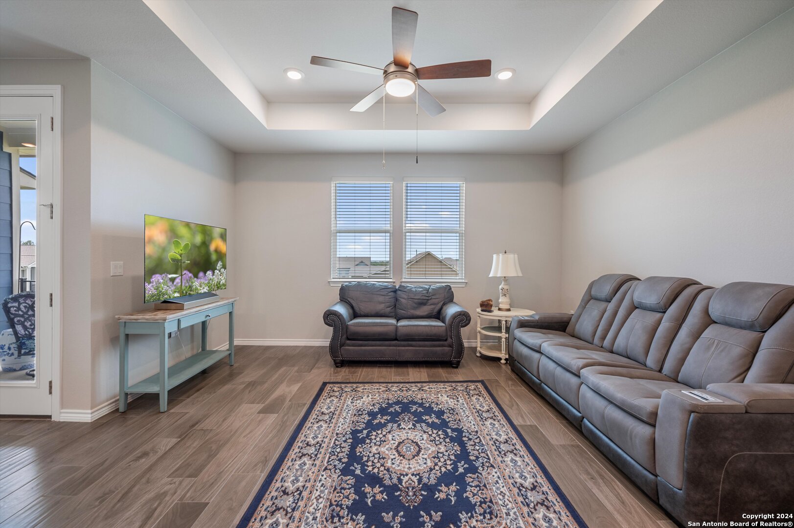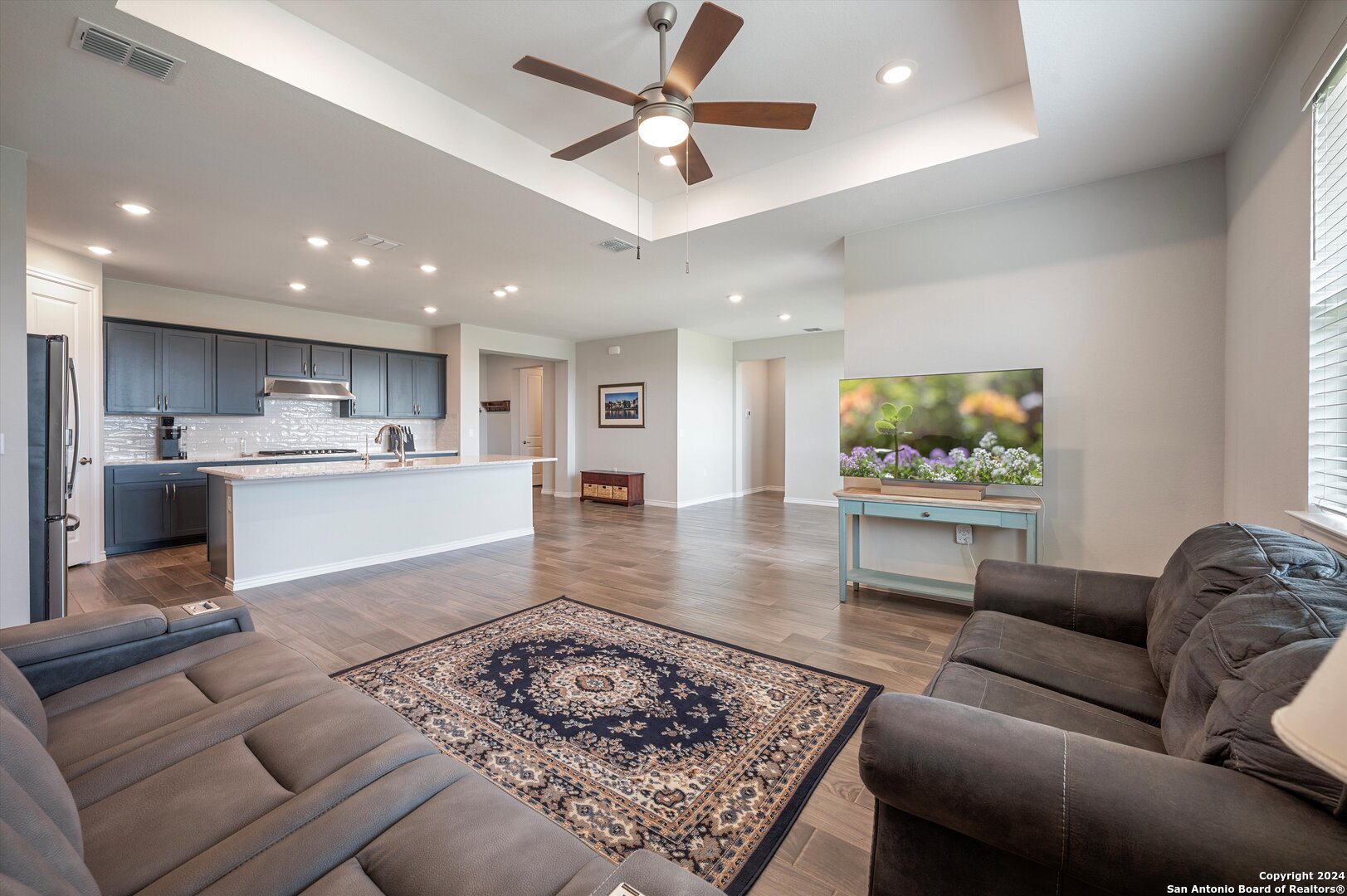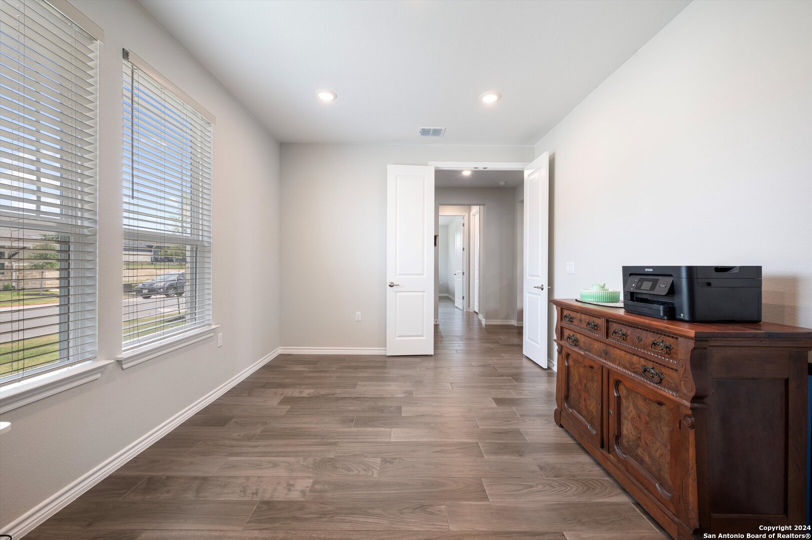 Welcome to this beautiful 2-bedroom, 2-bathroom Cottage with den/study in the highly desirable Kissing Tree community, designed exclusively for residents aged 55 and older. Boasting 1787 square feet of thoughtfully crafted living space, this home offers a blend of elegance,functionality, and modern upgrades that cater to a sophisticated lifestyle. As you step inside, you'll be greeted by an airy, open-concept living space with high ceilings and abundant natural light. The heart of the home is the large and upgraded kitchen, which features top-of-the-line appliances including a built-in oven, microwave, gas cooktop, refrigerator, and a convenient RO water filtration system. The countertops and spacious kitchen island have been tastefully upgraded to luxurious Quartz, providing both style and durability for all your culinary adventures. As you explore further, you'll notice the attention to detail in every corner, from the whole-home wood-look tile flooring to the 8-foot doors, to the tray ceilings in the primary bedroom and living room that add a touch of grandeur. The primary bathroom is a sanctuary of relaxation with separate vanities, a generously sized walk-in shower with a mud-set tile floor, and a stand-alone tub for soaking away the days stresses. Off the dining room, the covered patio beckons you to unwind and entertain, with a gas stub connection provided for creating your outdoor grilling haven. Enjoy the serene backdrop of greenspace behind the home, ensuring privacy and tranquility. Living in Kissing Tree offers more than a beautiful home; is a lifestyle upgrade. Enjoy peace of mind with 24/7 security staff and gated entrances. The amenities are second to none with multiple pools, a state-of-the-art workout facility, 10+ pickleball courts, a challenging golf course, scenic walking trails, a full-service restaurant, a vibrant entertainment area, and engaging activities to keep you entertained and connected to your community. Immerse yourself in the vibrant community of Kissing Tree, where every day offers new opportunities for relaxation, recreation, and social connections. Don't miss out on the chance to make this exceptional property your own and experience the best that 55+ living has to offer.