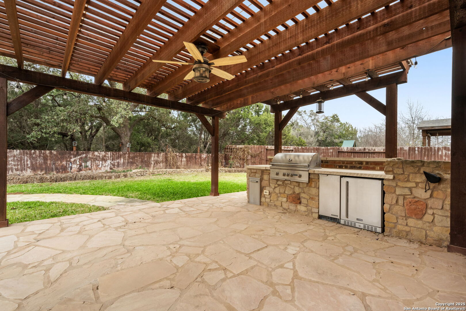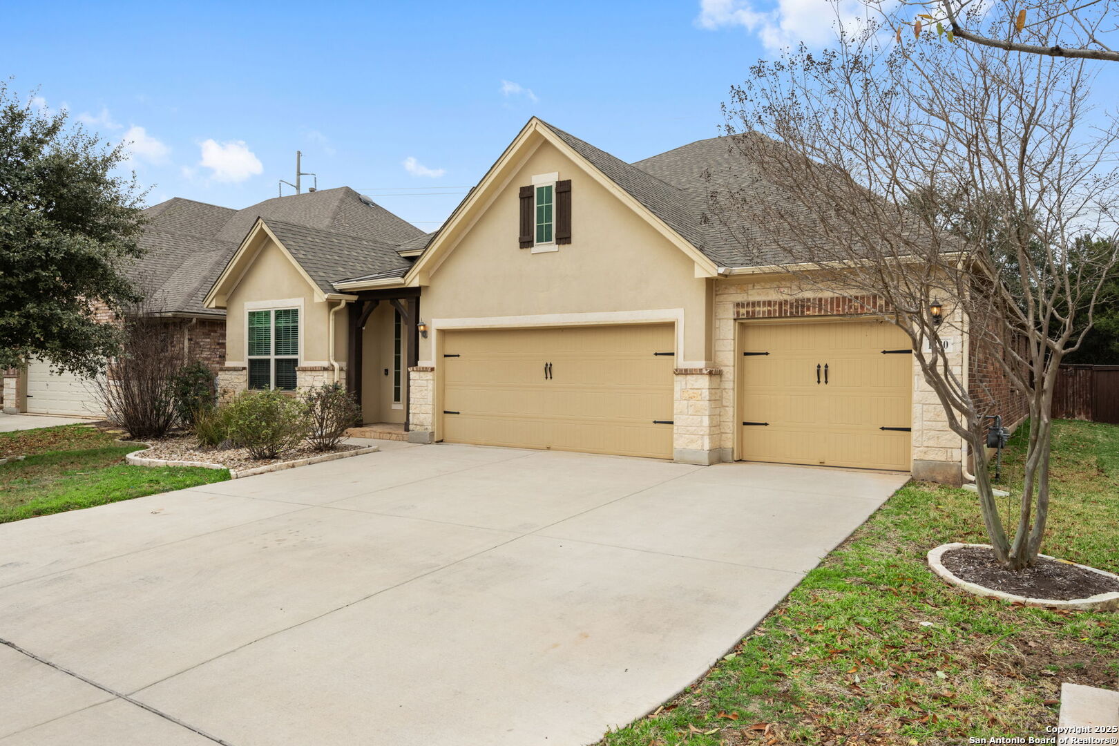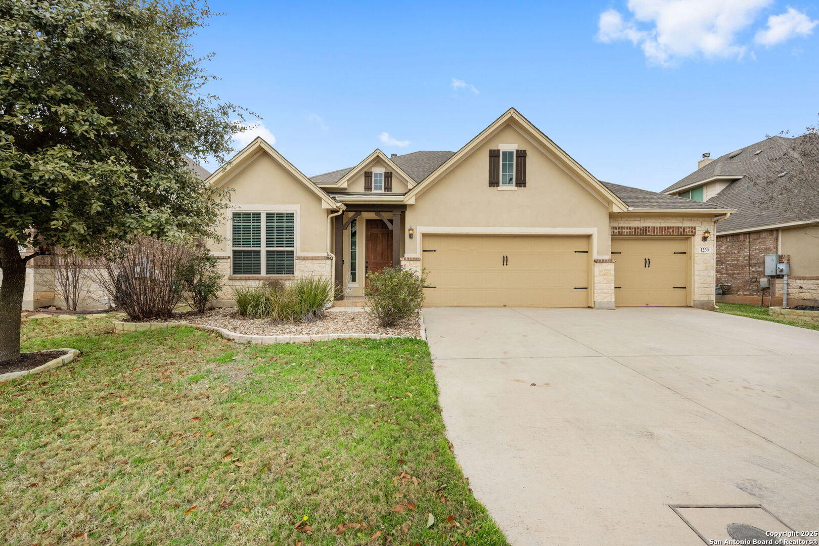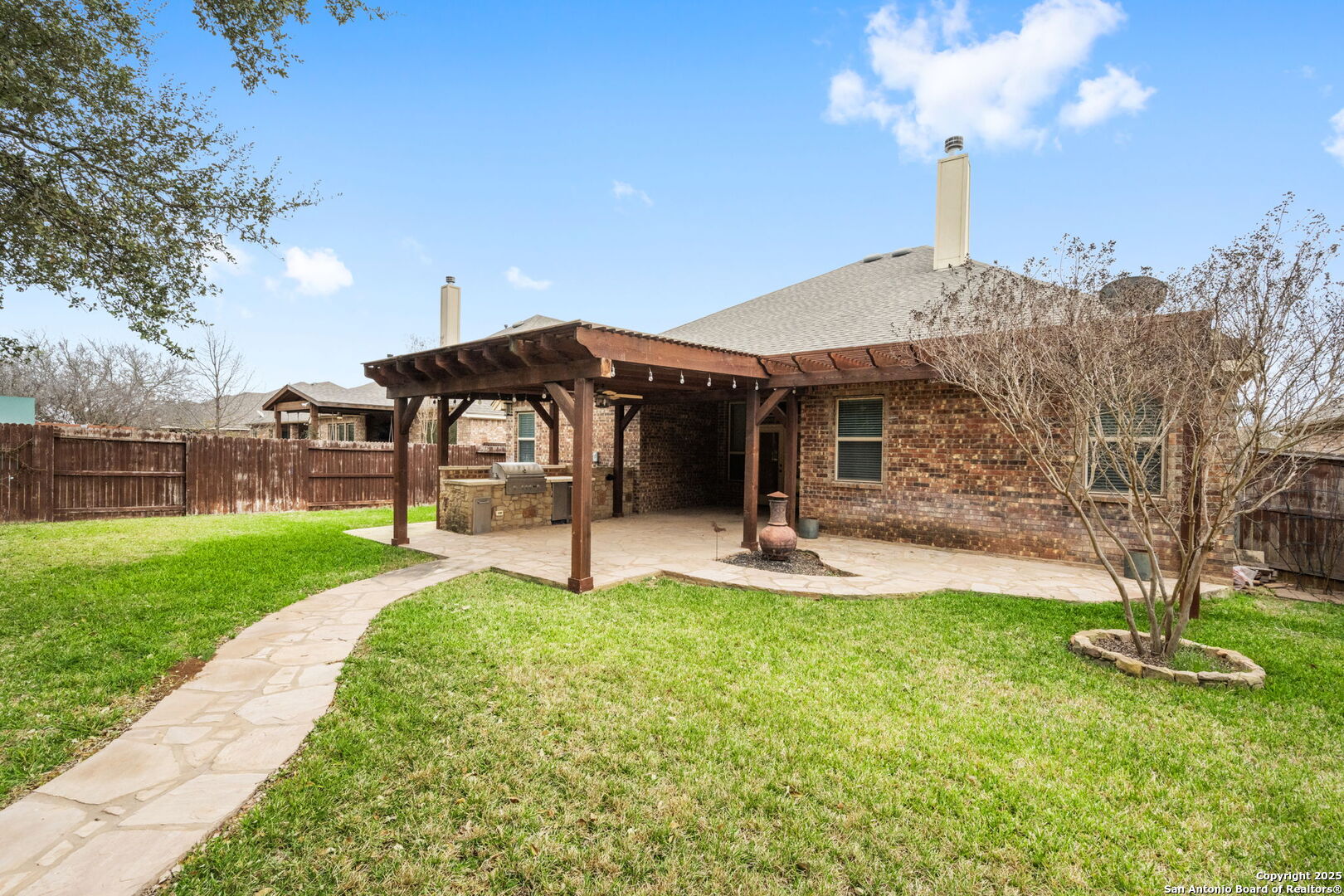 Charming one-story home on a Greenbelt, nestled in the desirable Estates at Stone Crossing in New Braunfels! With 4 beds, 3 baths, +/- 2,653 sqft, this home offers a perfect blend of comfort and style. Step inside to a cozy living room featuring a wood-burning fireplace, seamlessly flowing into the spacious kitchen. The kitchen boasts granite countertops, stainless steel appliances, ample cabinetry, and a large island. The primary bedroom is a private retreat with a separate his and her closets with built-in dressers and shelving, separate vanity, a garden tub, and a separate shower. Outside, enjoy a private backyard with a covered patio and a full outdoor kitchen, complete with a gas grill and ice maker that is perfect for gatherings! New Braunfels ISD. Welcome home!