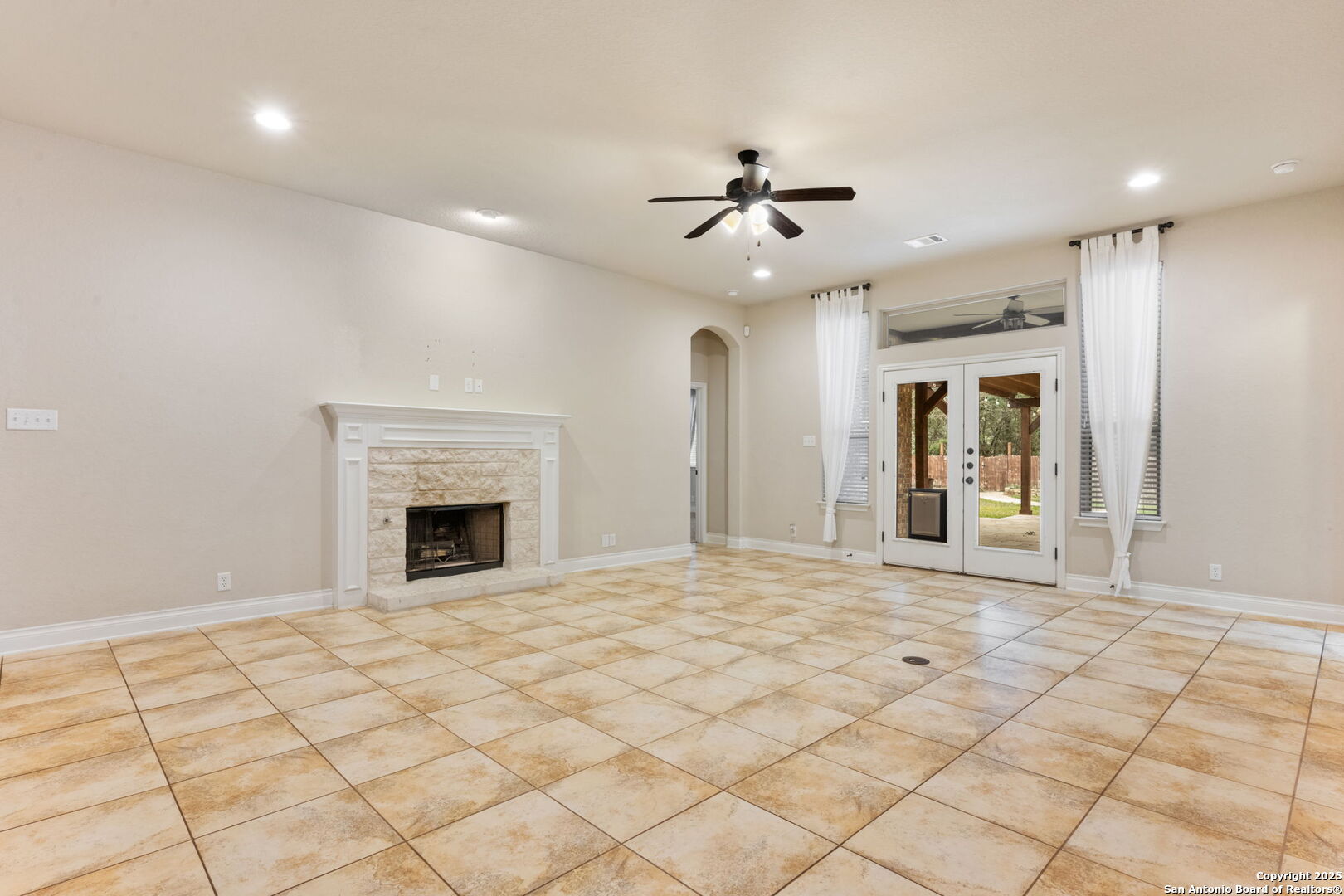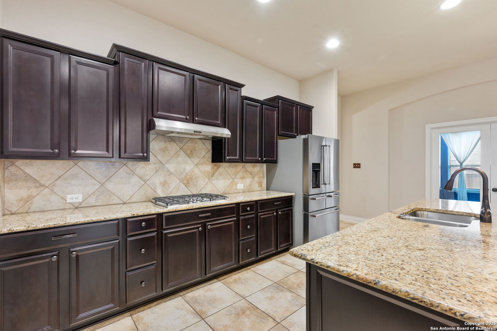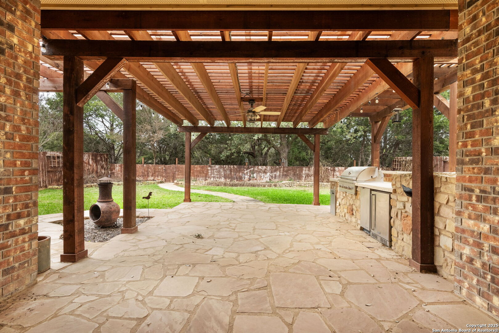 Charming one-story home on a Greenbelt, nestled in the desirable Estates at Stone Crossing in New Braunfels! With 4 beds, 3 baths, +/- 2,653 sqft, this home offers a perfect blend of comfort and style. Step inside to a cozy living room featuring a wood-burning fireplace, seamlessly flowing into the spacious kitchen. The kitchen boasts granite countertops, stainless steel appliances, ample cabinetry, and a large island. The primary bedroom is a private retreat with a separate his and her closets with built-in dressers and shelving, separate vanity, a garden tub, and a separate shower. Outside, enjoy a private backyard with a covered patio and a full outdoor kitchen, complete with a gas grill and ice maker that is perfect for gatherings! New Braunfels ISD. Welcome home!
