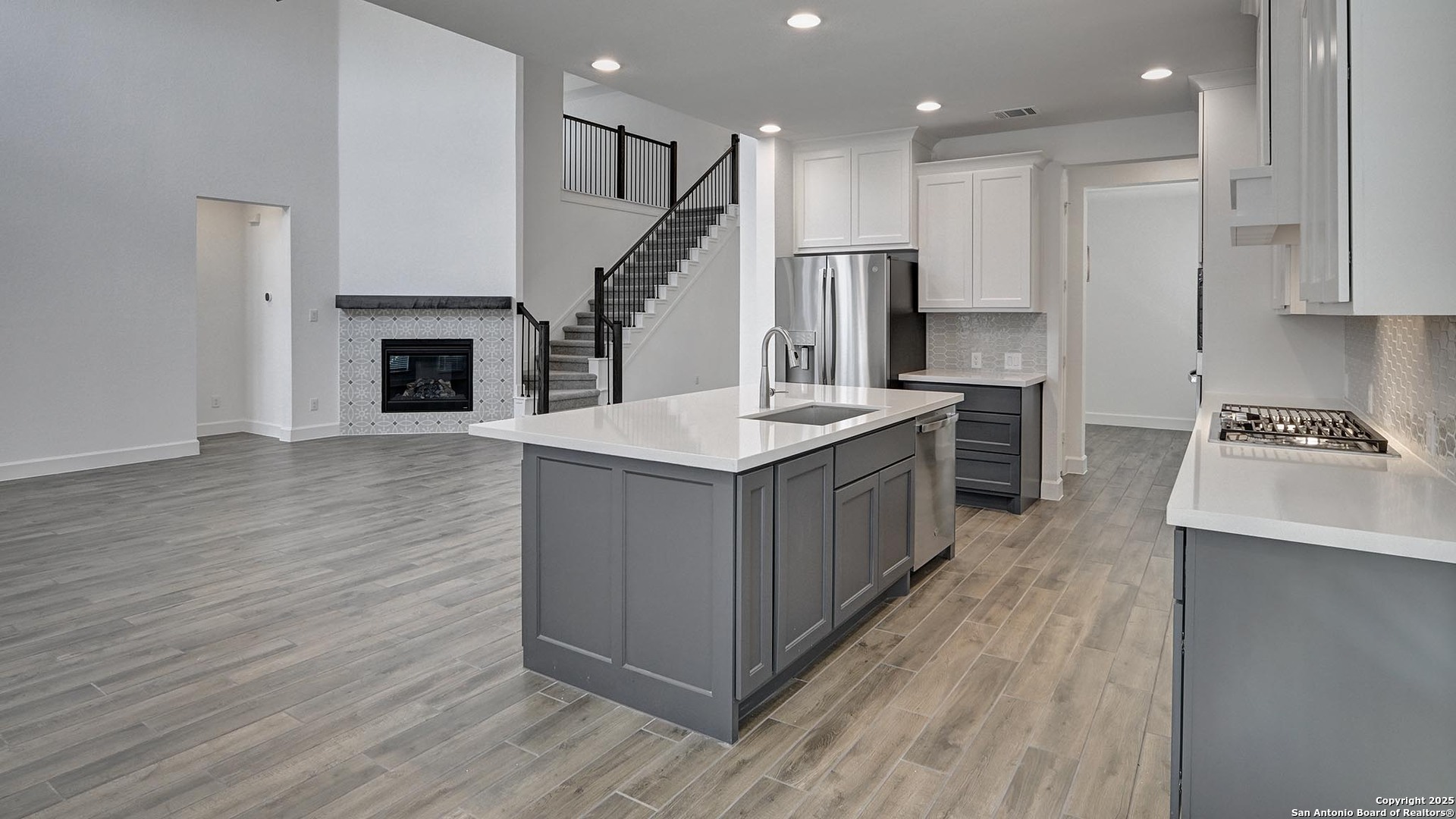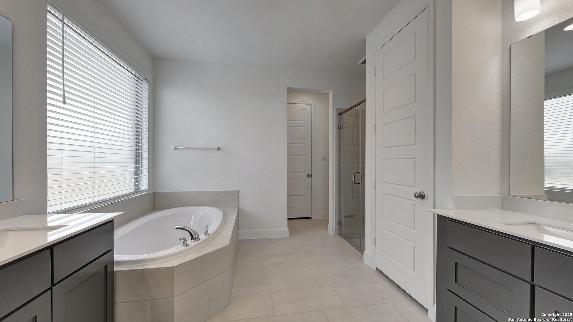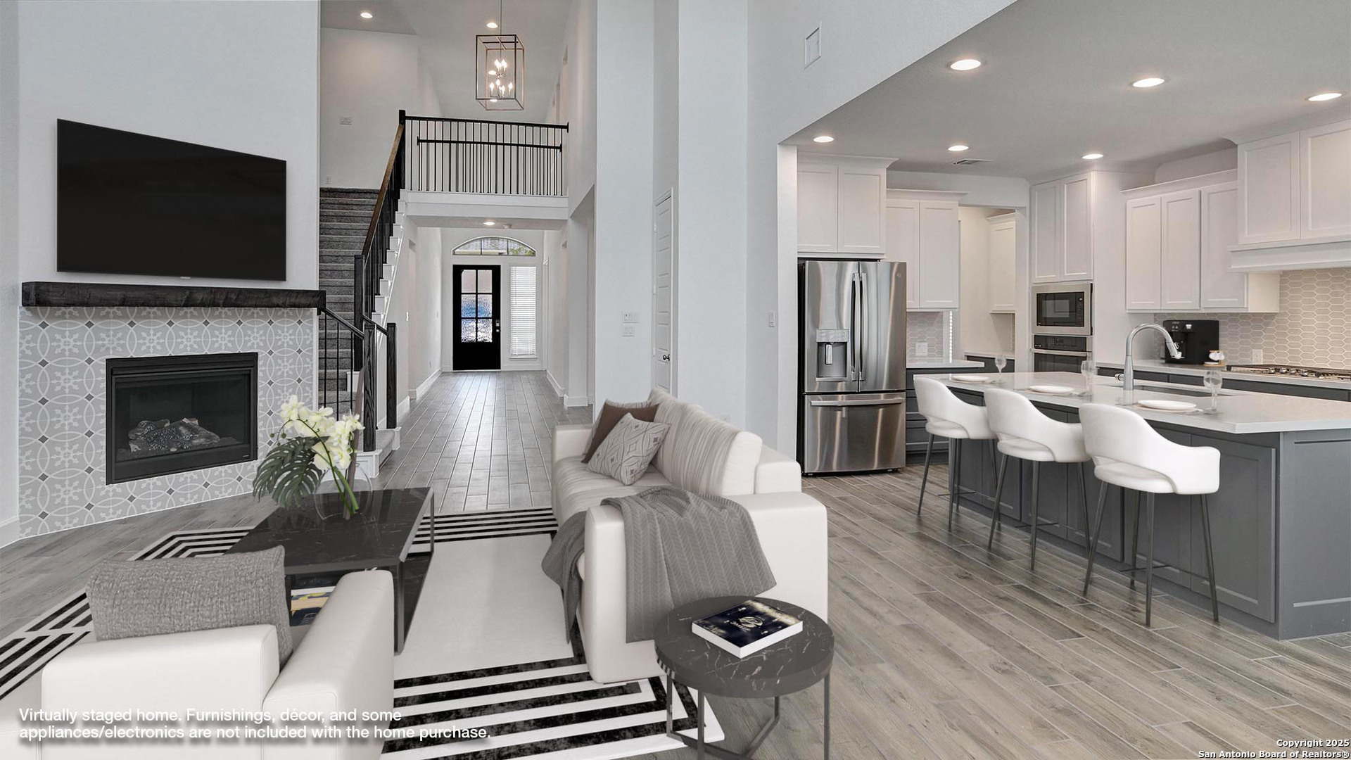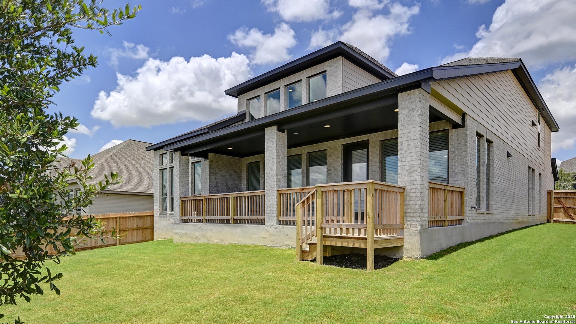 READY FOR MOVE-IN! Home office with French doors set at two-story entry. Formal dining room across from staircase. Two-story family room opens to kitchen and morning area. Family room features a wood mantel fireplace and wall of windows. Kitchen features deep walk-in pantry, Butler's pantry, 5-burner gas cooktop and large island with built-in seating space. First-floor primary suite includes bedroom with wall of windows. Double doors lead to primary bath with dual vanities, garden tub, separate glass-enclosed shower and two walk-in closets. An additional bedroom is downstairs. A game room and secondary bedrooms are upstairs. Extended covered backyard patio and 5-zone sprinkler system. Mud room off three-car garage.