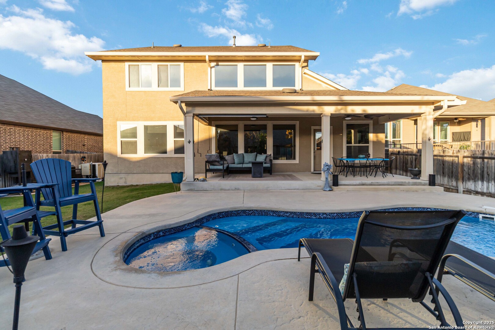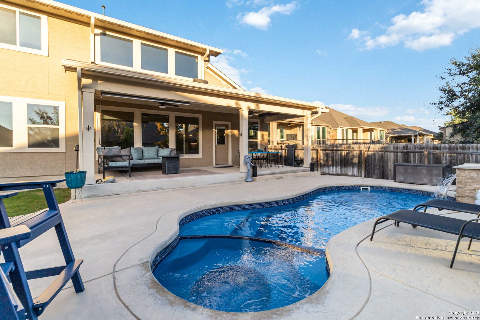 Welcome to 12336 Saddle Up Drive, nestled in the highly desired Davis Ranch community! This stunning 4-bedroom, 3.5-bath home, built in 2019, offers the perfect blend of modern comfort, thoughtful upgrades, and outdoor luxury-all situated on a quiet cul-de-sac lot with beautiful landscaping and curb appeal! Inside, you'll find a spacious and versatile layout featuring two living areas, an inviting dedicated study, and four extra-large bedrooms that provide comfort and privacy for the whole family. The heart of the home is the beautifully designed open kitchen, which seamlessly connects to the main living and dining spaces-perfect for entertaining and everyday living. The kitchen boasts a massive island, extensive storage, and modern finishes that make cooking and gathering effortless. The natural lighting and soaring ceilings give the space a warm yet expansive feel that truly elevates the home. Step outside to your private backyard oasis with an in-ground saltwater pool and spa with a tranquil water fountain equipped with both heater and chiller, and a Rain Bird sprinkler system to keep your landscaping beautiful year-round. Enjoy upgraded outdoor living with reflective tint for privacy and heat reduction, patio ceiling fans, enhanced lighting, patio shades, and a natural gas outlet ready for easy grilling. A dedicated barbecue concrete slab adds even more convenience for outdoor gatherings. The home also features an oversized two-car garage with an adjoining area ideal for additional storage, a home gym, or workspace, providing even more versatility. Additional upgrades include a water softener, full gutters around the entire home, landscaping with retention walls, extra long driveway for an estimated 6 plus vehicles with an extension on each side, extra electrical outlets and soffit lighting on the front and back patios, additional storage shelves in the garage and upgraded lighting throughout the patio areas. From the spacious interior to the resort-style backyard, this home has been thoughtfully designed and enhanced for comfort, entertainment, and everyday convenience. Located minutes from the highway, restaurants, shopping and entertainment! Schedule your showing today!