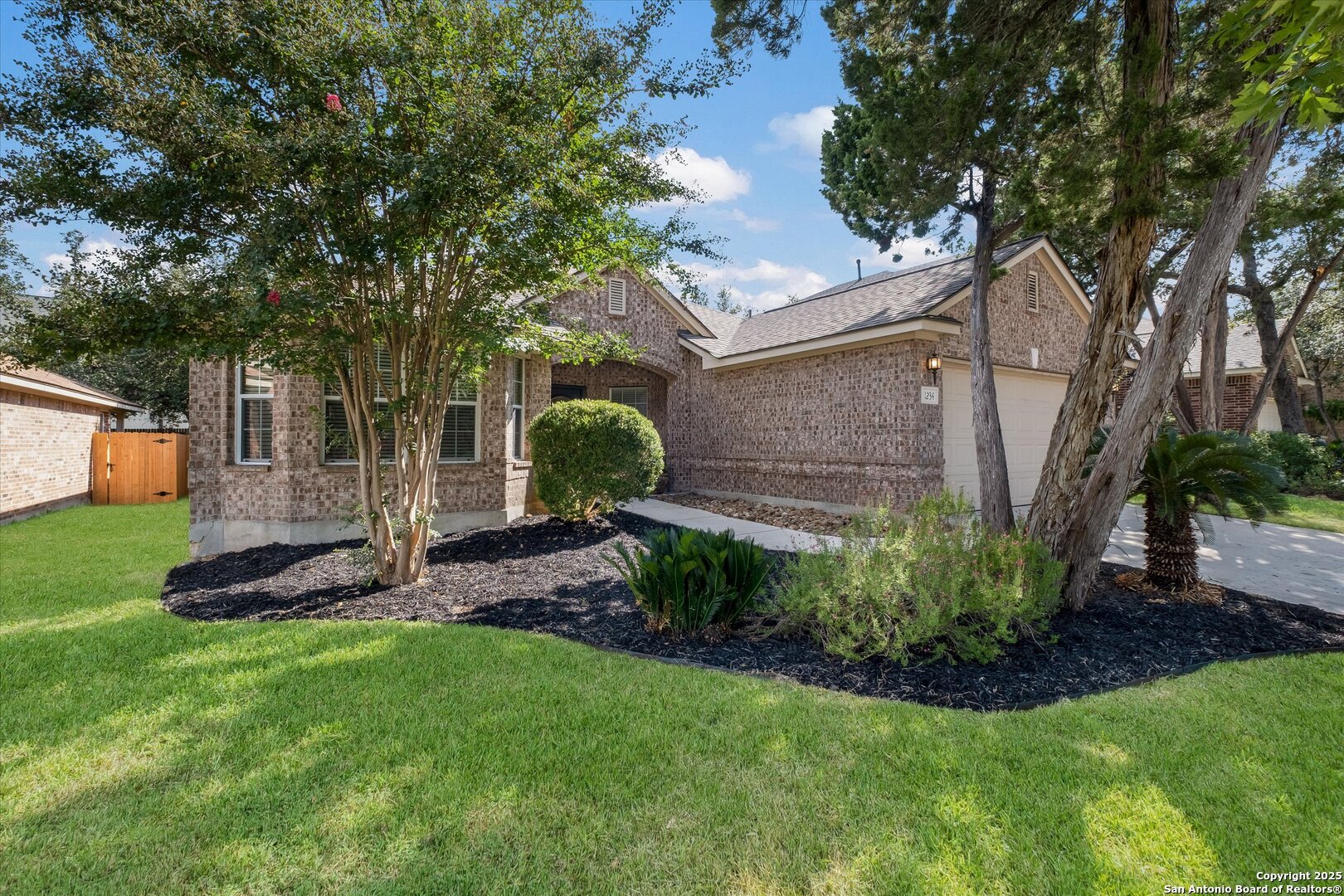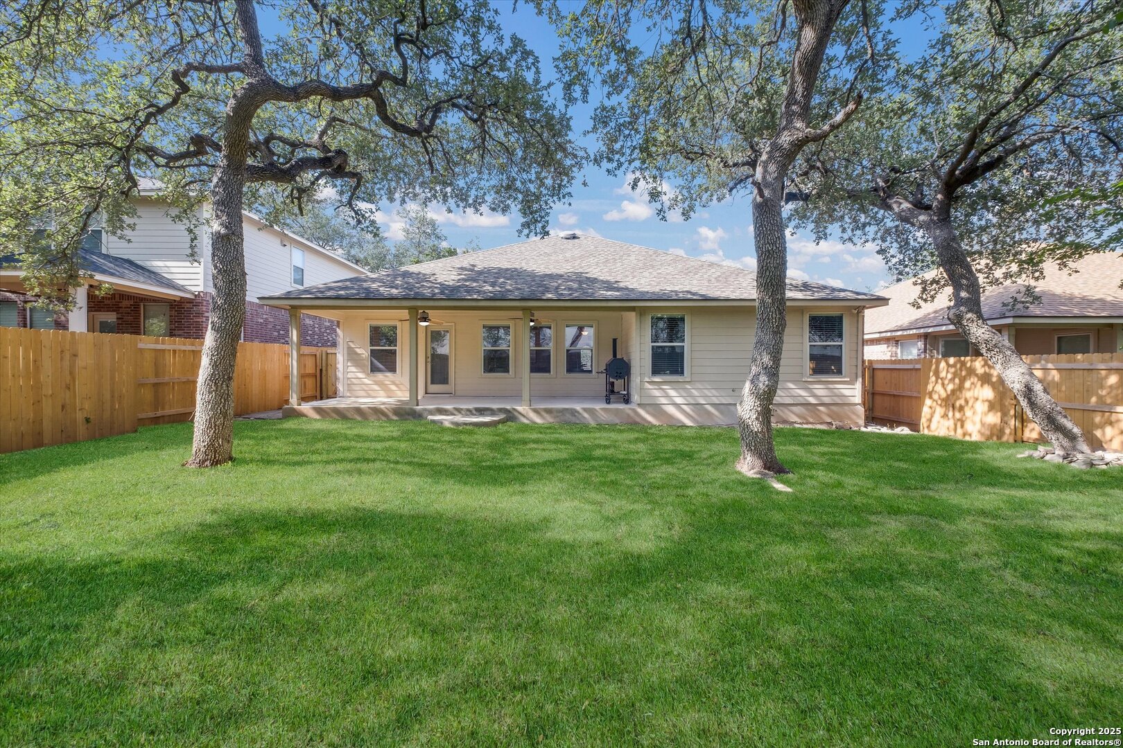 Welcome to effortless Hill Country living in the highly sought-after Enclave at Canyon Springs. This beautifully maintained one-story home offers a seamless blend of comfort, style, and convenience-all nestled in a peaceful neighborhood with top-rated Comal ISD schools and no city taxes. This charming home greets you with a spacious front porch-perfect for a quiet morning coffee or welcoming guests. Step inside to an open and airy floor plan, where wood flooring and tile extend through all main living areas and the primary bedroom. The kitchen is designed for both daily living and entertaining, featuring stainless steel appliances, recessed lighting, and an eat-in dining area. The large primary suite offers a private retreat with a walk-in closet and a spa-like en suite bath complete with a separate shower, garden tub, and double vanity. Step out back to a large covered porch overlooking a freshly sodded yard with a new fence-an ideal space for weekend gatherings or peaceful evenings outdoors. A new roof installed in May 2024 adds even more value and peace of mind. Community amenities include a sparkling pool, basketball and tennis courts, and a playground-providing fun and relaxation for all ages. This is where your next chapter begins!