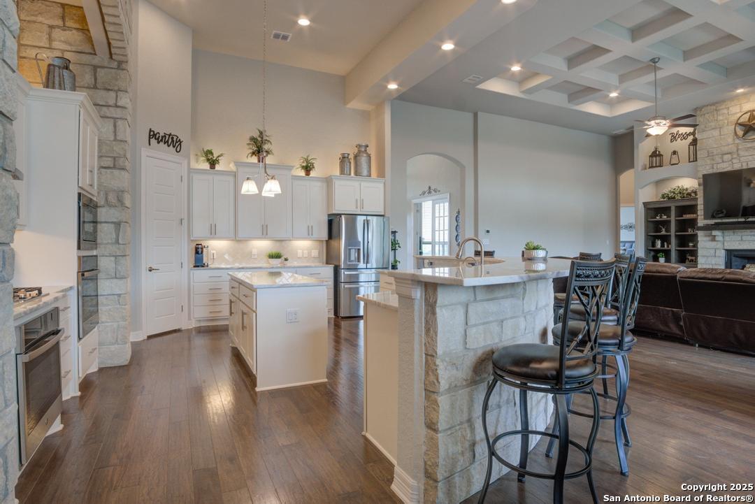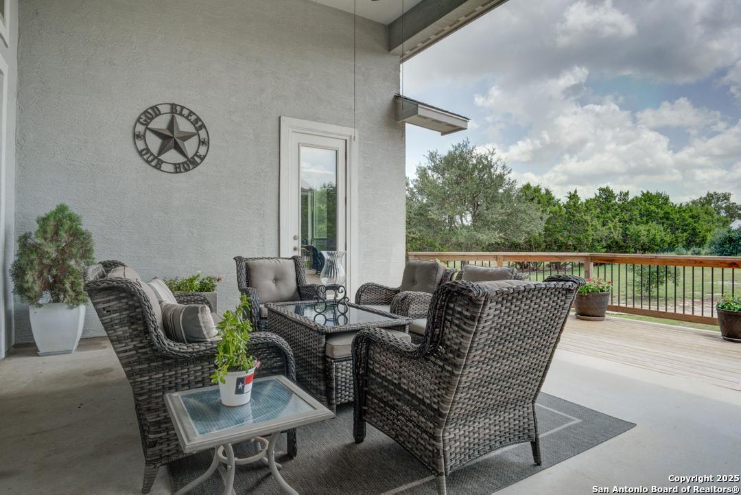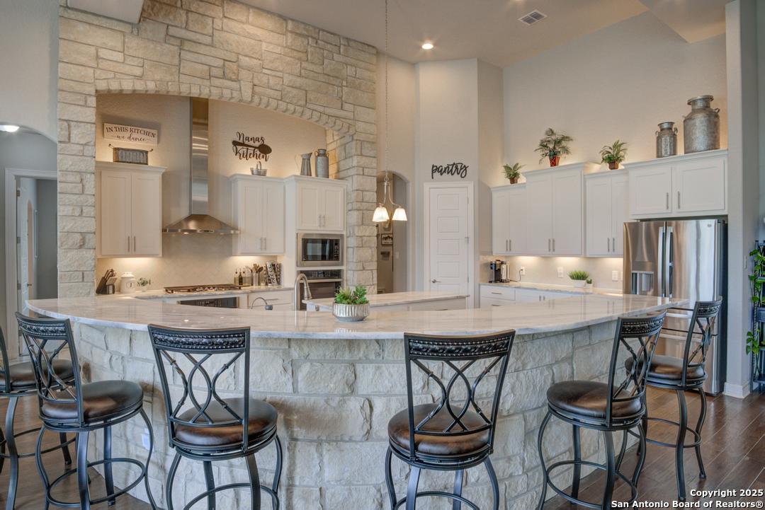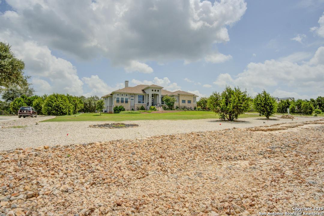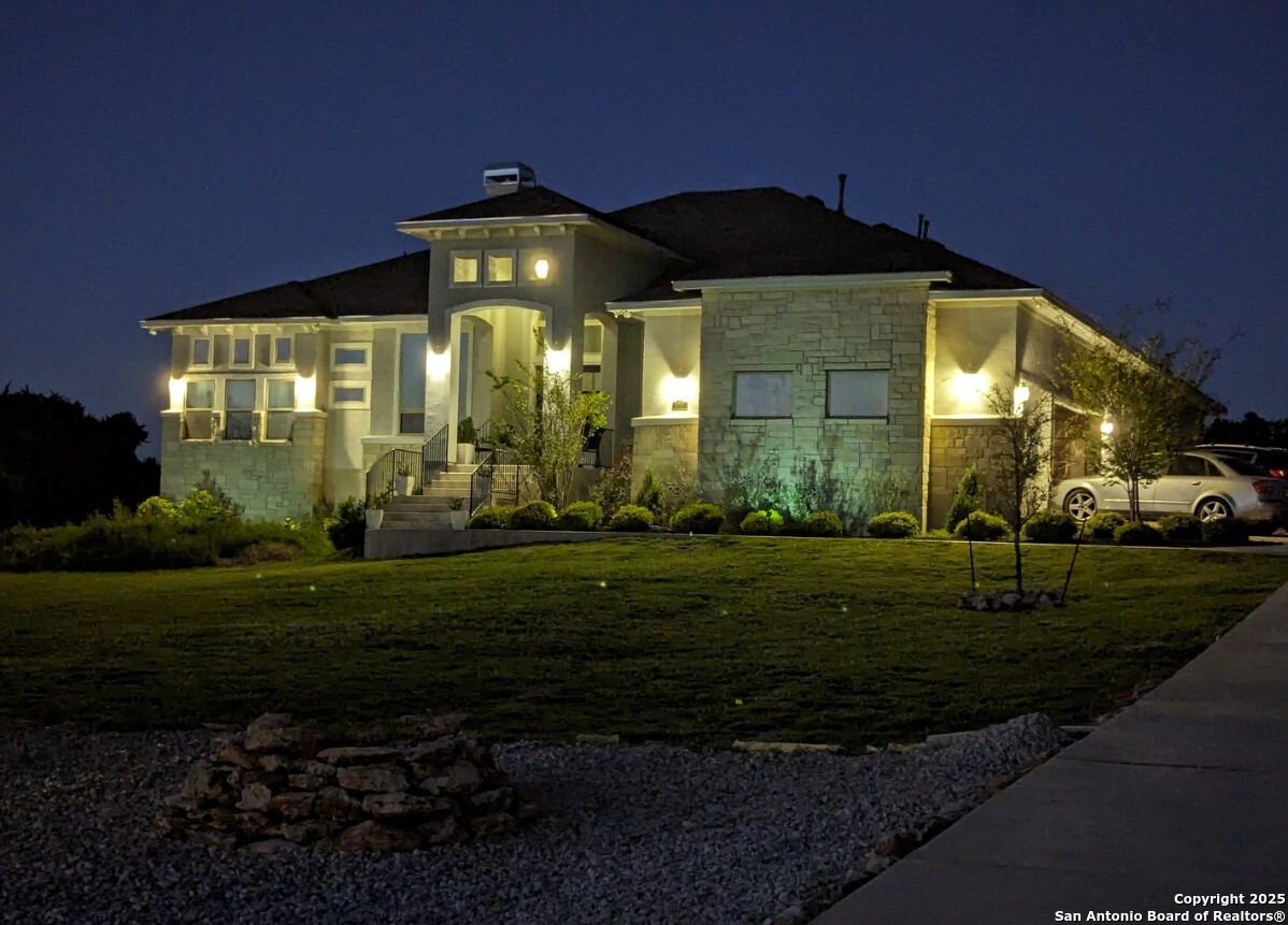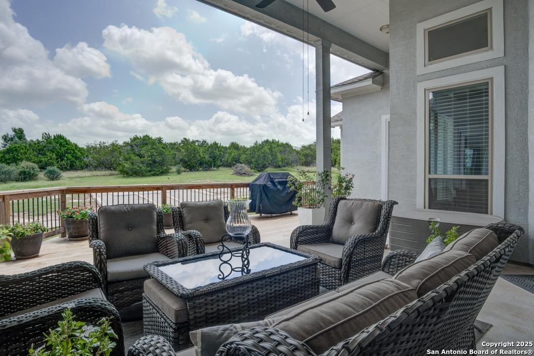 This gorgeous custom home sits on over an acre in the highly desired neighborhood of Vintage Oaks at the Vineyard! It is obvious this home has tons of tender loving care poured into it's quality custom features. The front entry opens into a large private dining room and study with beautiful hardwood floors, high coffered ceilings and open floor plan. The living area has tons of natural light with a floor to ceiling stone fireplace and custom cabinets that make for the perfect centerpiece. The gourmet kitchen is a chef's dream with beautiful matching stonework, gas cooking, dual ovens, farmhouse sink, marble countertops with tons of space, island, large wrap around bar, walk in pantry, plenty of custom cabinets with lighting under and above for the perfect setting. The primary suite is huge with high tray ceilings, plenty of natural light and a private exit to the perfect outdoor space. The primary bedroom also includes a resort style ensuite with a large soaking tub, huge walk in dual showers and a large walk in closet with ample space. There is a private guest suite with full bath, two more bedrooms and full bathrooms on the opposite side of the home for privacy. This truly is the perfect floor plan! The interior space opens up to a large covered patio with an extended deck for the perfect spot to admire the sunrise over your morning coffee or watch the deer and wildlife. The back yard is large and private with low maintenance zero scaping, a firepit and a serene prayer/meditation garden. The neighborhood clubhouse, park and pool is more than you could ask for! This home truly is the perfect place to create memories that will last a lifetime! Don't miss out. Schedule your showing ASAP!