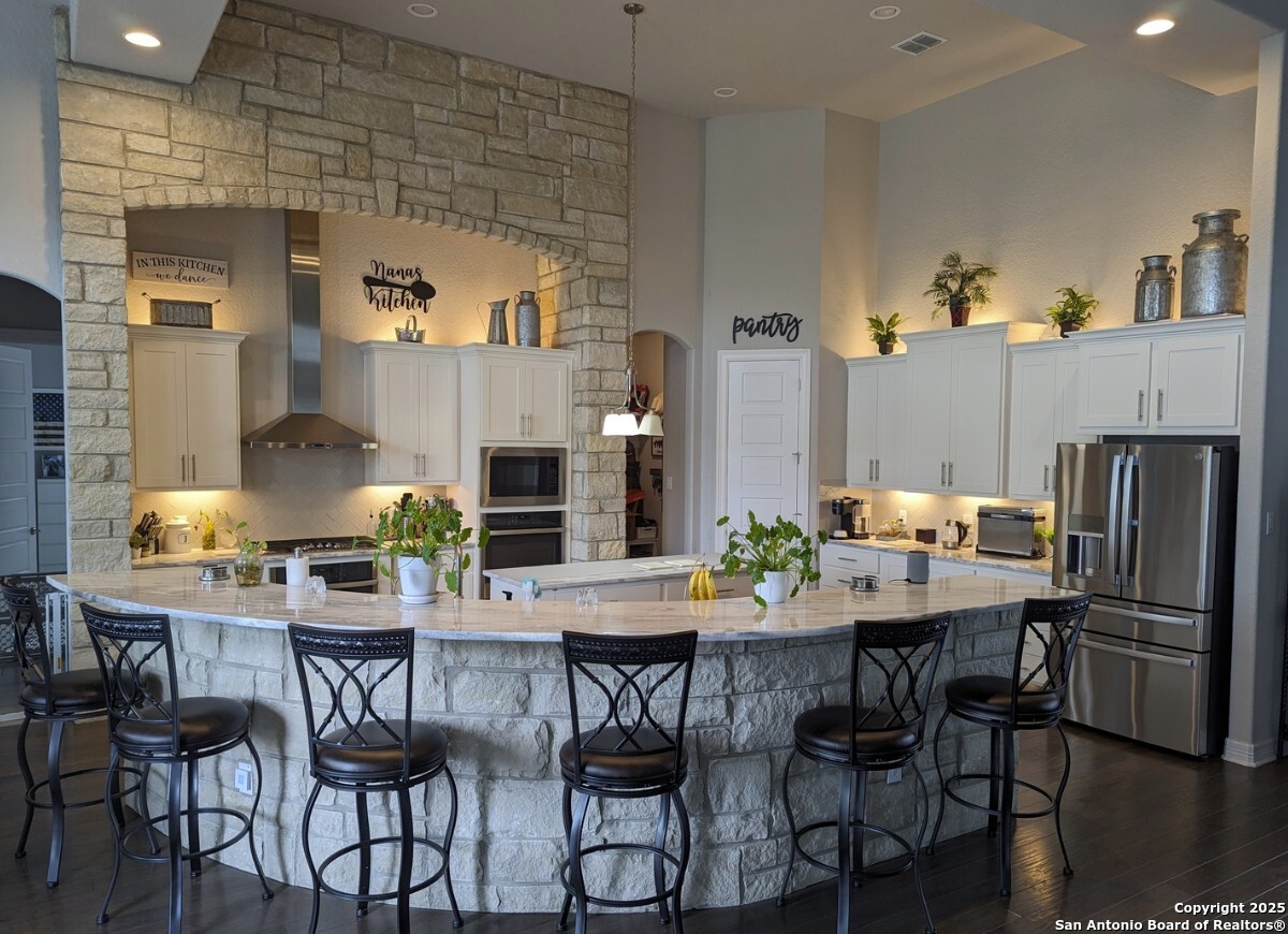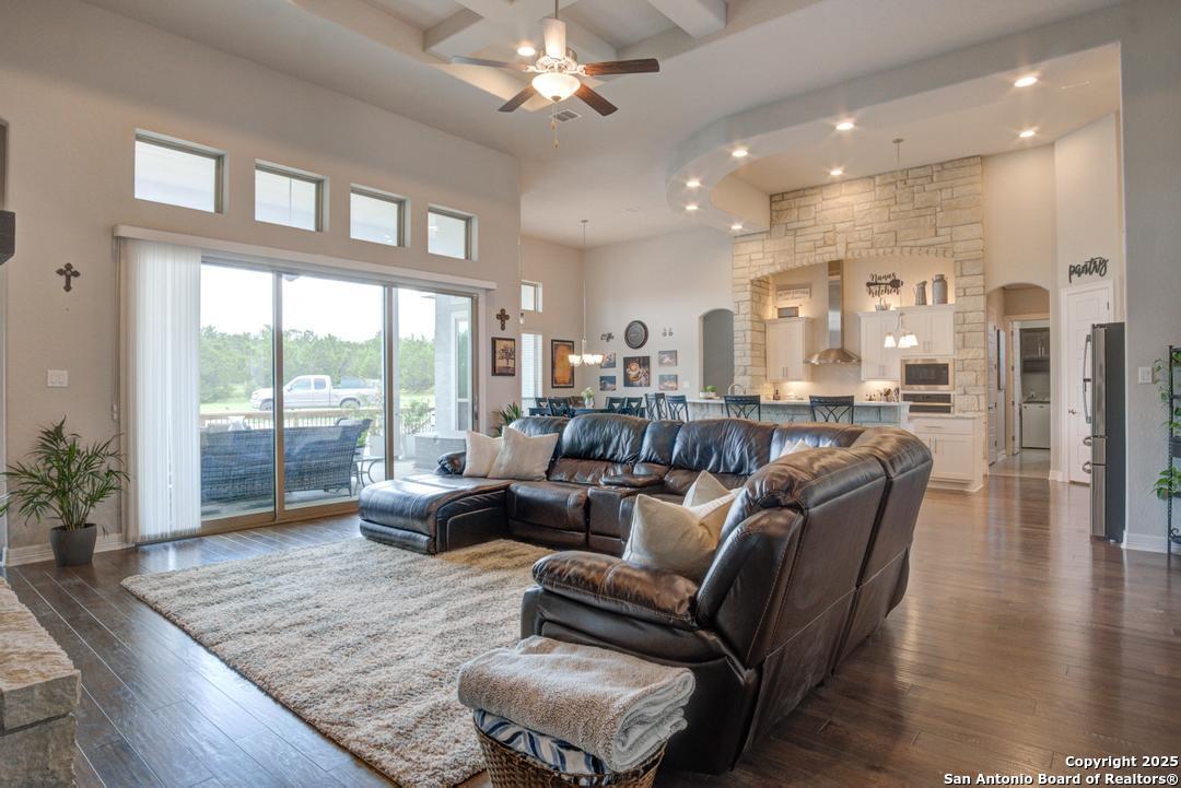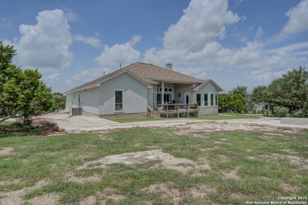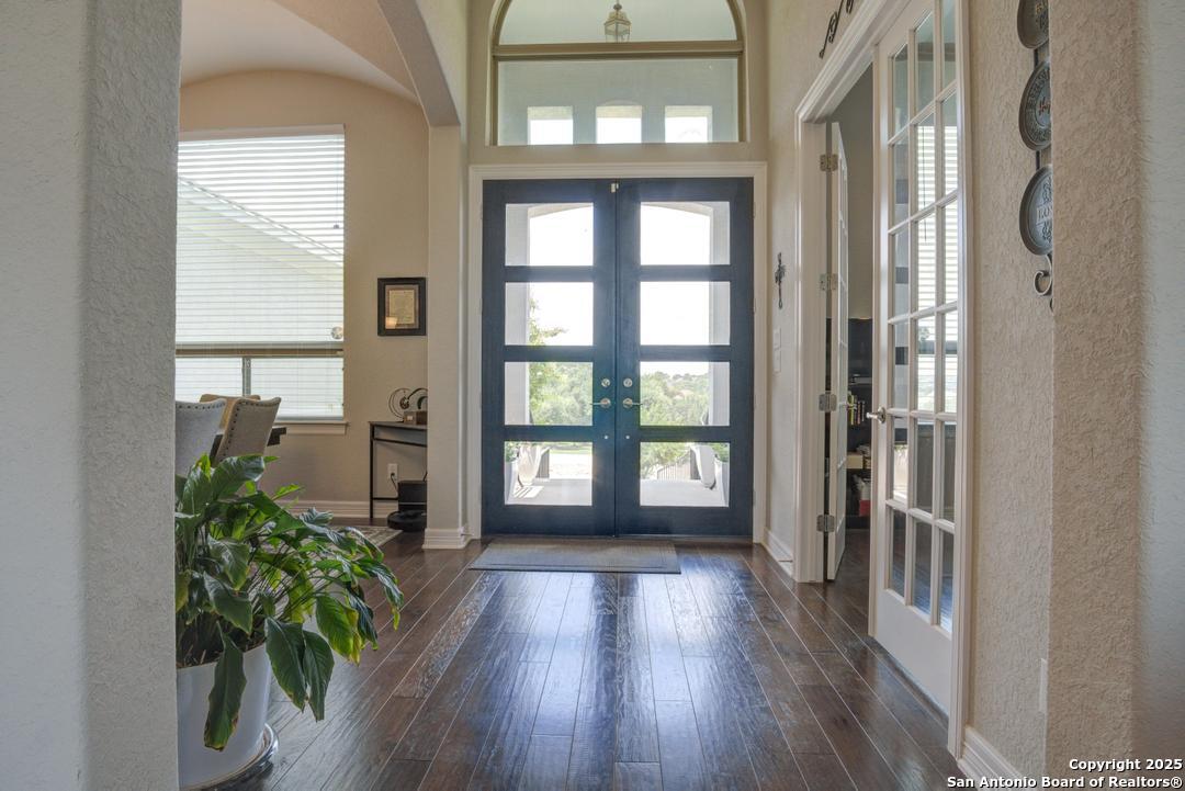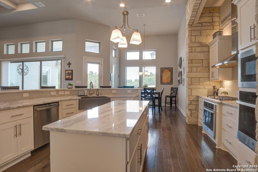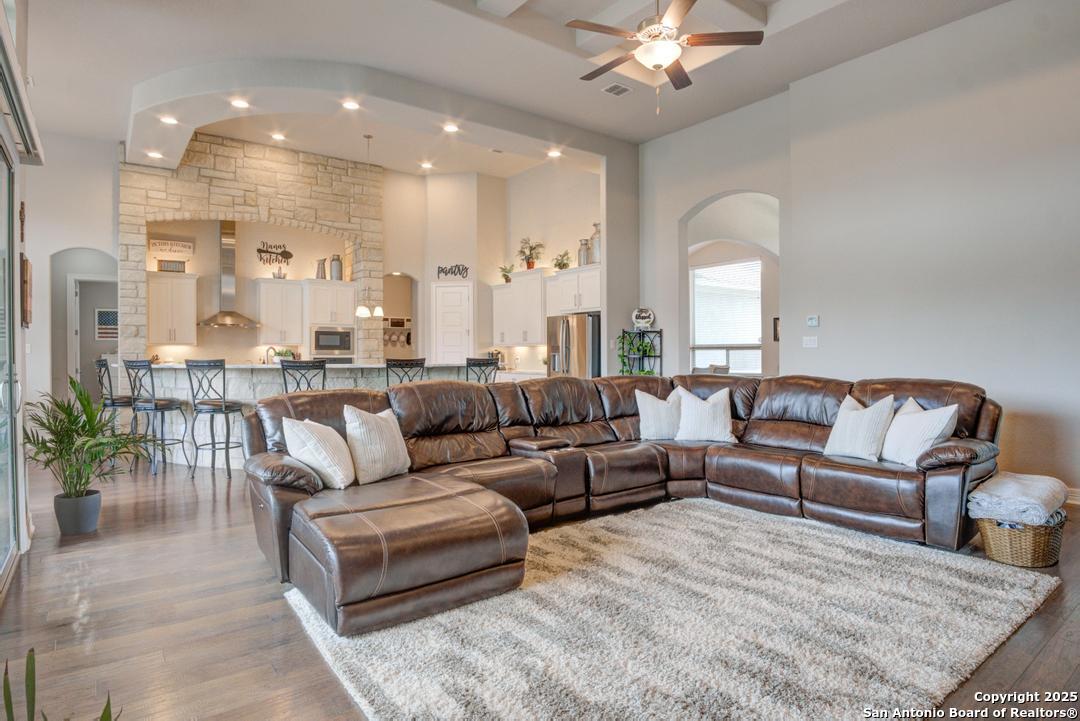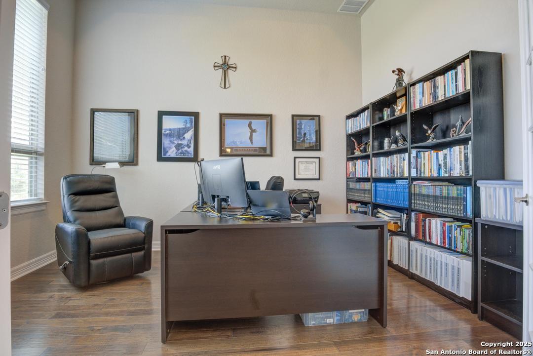 This gorgeous custom home sits on over an acre in the highly desired neighborhood of Vintage Oaks at the Vineyard! It is obvious this home has tons of tender loving care poured into it's quality custom features. The front entry opens into a large private dining room and study with beautiful hardwood floors, high coffered ceilings and open floor plan. The living area has tons of natural light with a floor to ceiling stone fireplace and custom cabinets that make for the perfect centerpiece. The gourmet kitchen is a chef's dream with beautiful matching stonework, gas cooking, dual ovens, farmhouse sink, marble countertops with tons of space, island, large wrap around bar, walk in pantry, plenty of custom cabinets with lighting under and above for the perfect setting. The primary suite is huge with high tray ceilings, plenty of natural light and a private exit to the perfect outdoor space. The primary bedroom also includes a resort style ensuite with a large soaking tub, huge walk in dual showers and a large walk in closet with ample space. There is a private guest suite with full bath, two more bedrooms and full bathrooms on the opposite side of the home for privacy. This truly is the perfect floor plan! The interior space opens up to a large covered patio with an extended deck for the perfect spot to admire the sunrise over your morning coffee or watch the deer and wildlife. The back yard is large and private with low maintenance zero scaping, a firepit and a serene prayer/meditation garden. The neighborhood clubhouse, park and pool is more than you could ask for! This home truly is the perfect place to create memories that will last a lifetime! Don't miss out. Schedule your showing ASAP!