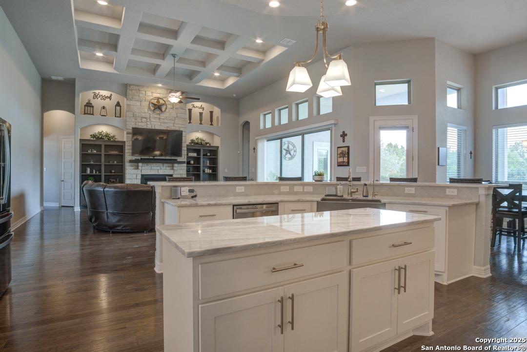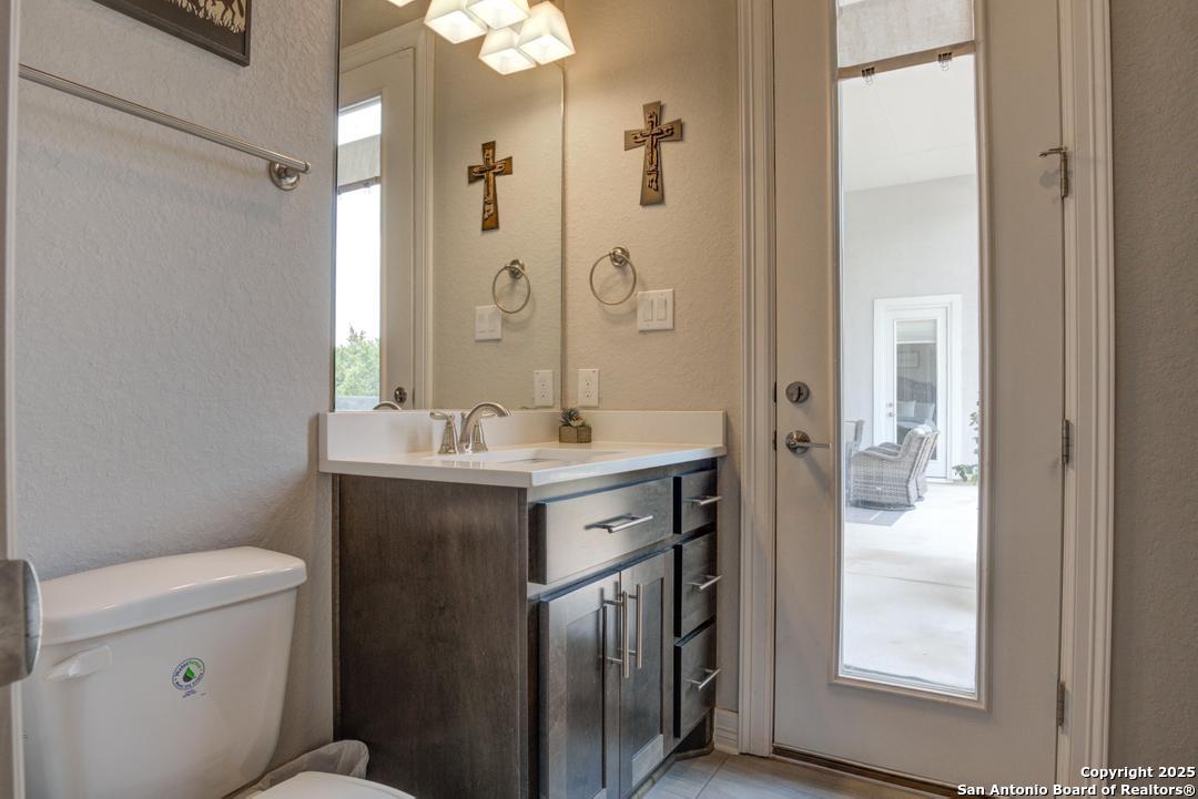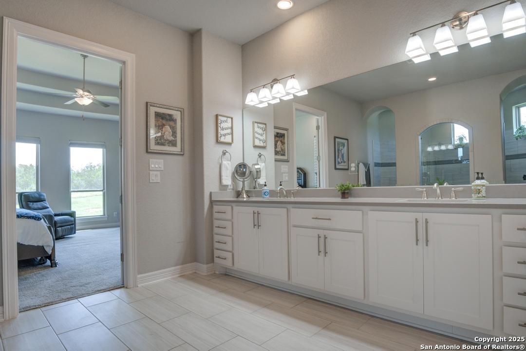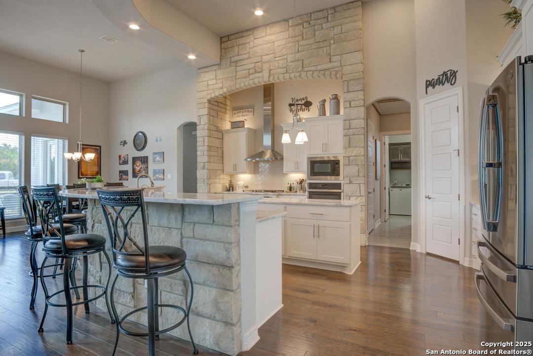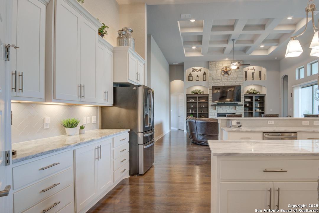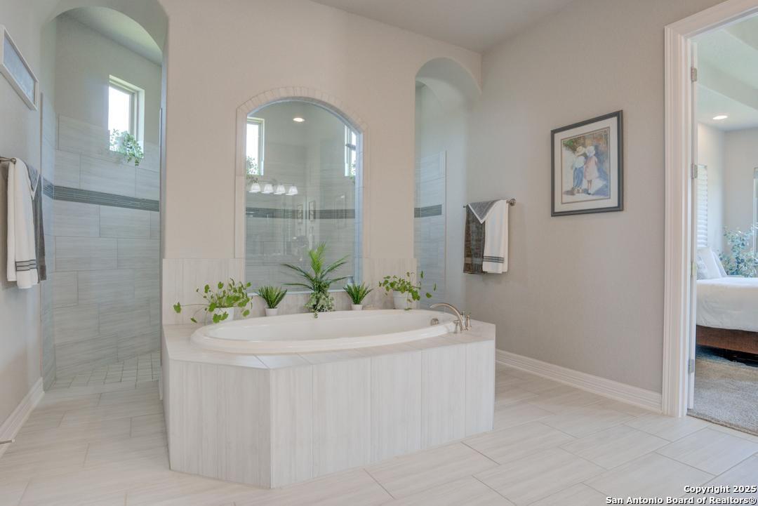 This gorgeous custom home sits on over an acre in the highly desired neighborhood of Vintage Oaks at the Vineyard! It is obvious this home has tons of tender loving care poured into it's quality custom features. The front entry opens into a large private dining room and study with beautiful hardwood floors, high coffered ceilings and open floor plan. The living area has tons of natural light with a floor to ceiling stone fireplace and custom cabinets that make for the perfect centerpiece. The gourmet kitchen is a chef's dream with beautiful matching stonework, gas cooking, dual ovens, farmhouse sink, marble countertops with tons of space, island, large wrap around bar, walk in pantry, plenty of custom cabinets with lighting under and above for the perfect setting. The primary suite is huge with high tray ceilings, plenty of natural light and a private exit to the perfect outdoor space. The primary bedroom also includes a resort style ensuite with a large soaking tub, huge walk in dual showers and a large walk in closet with ample space. There is a private guest suite with full bath, two more bedrooms and full bathrooms on the opposite side of the home for privacy. This truly is the perfect floor plan! The interior space opens up to a large covered patio with an extended deck for the perfect spot to admire the sunrise over your morning coffee or watch the deer and wildlife. The back yard is large and private with low maintenance zero scaping, a firepit and a serene prayer/meditation garden. The neighborhood clubhouse, park and pool is more than you could ask for! This home truly is the perfect place to create memories that will last a lifetime! Don't miss out. Schedule your showing ASAP!