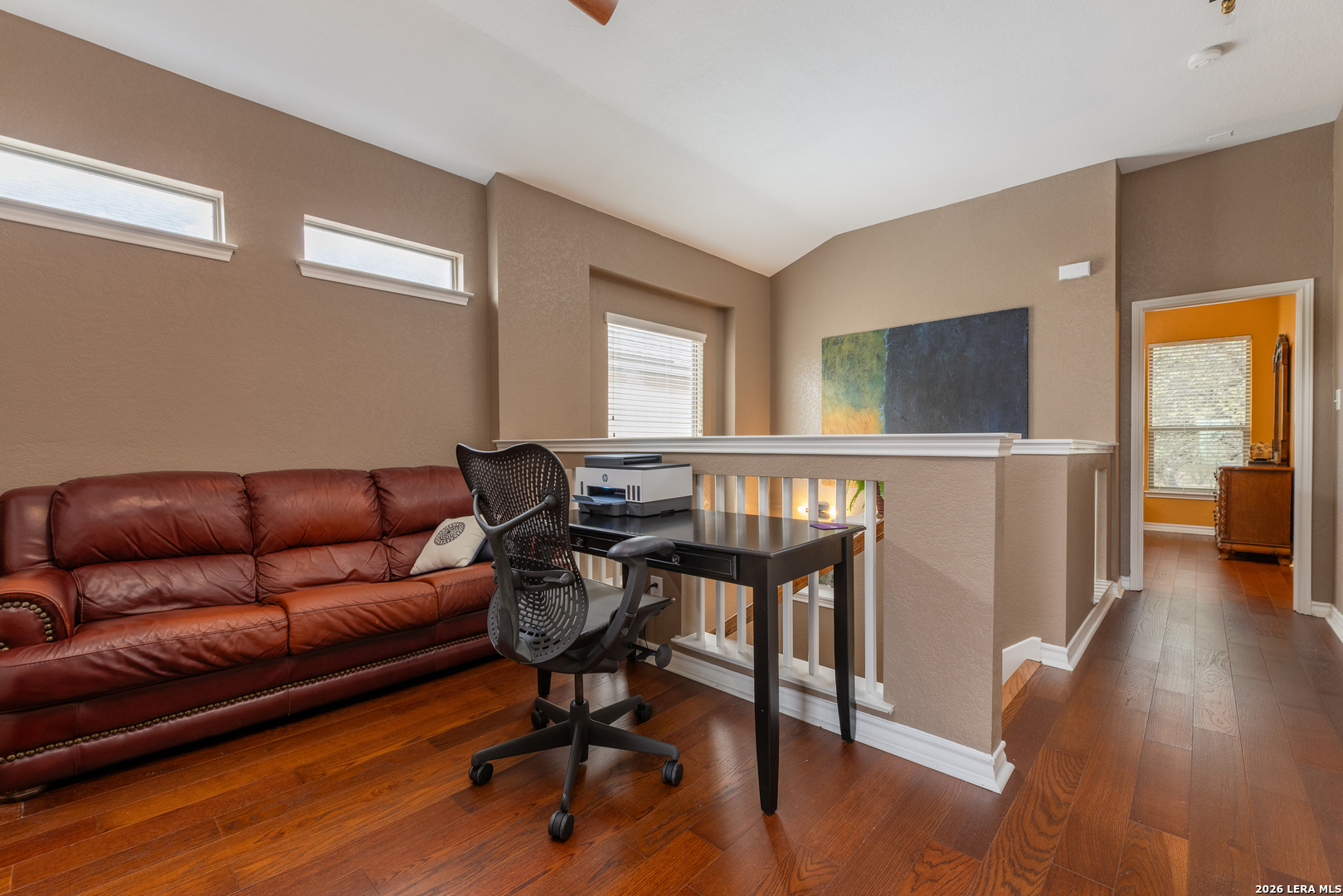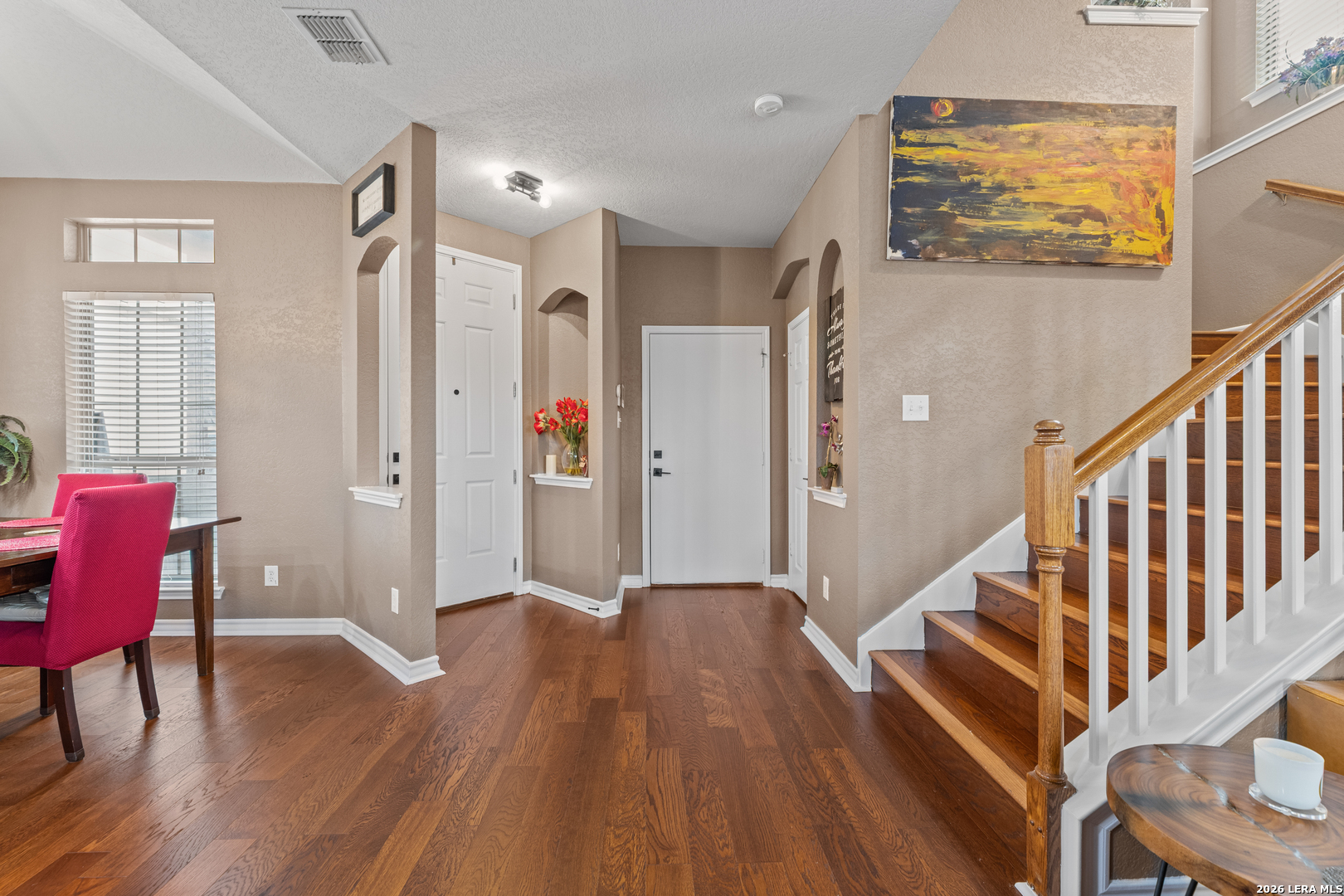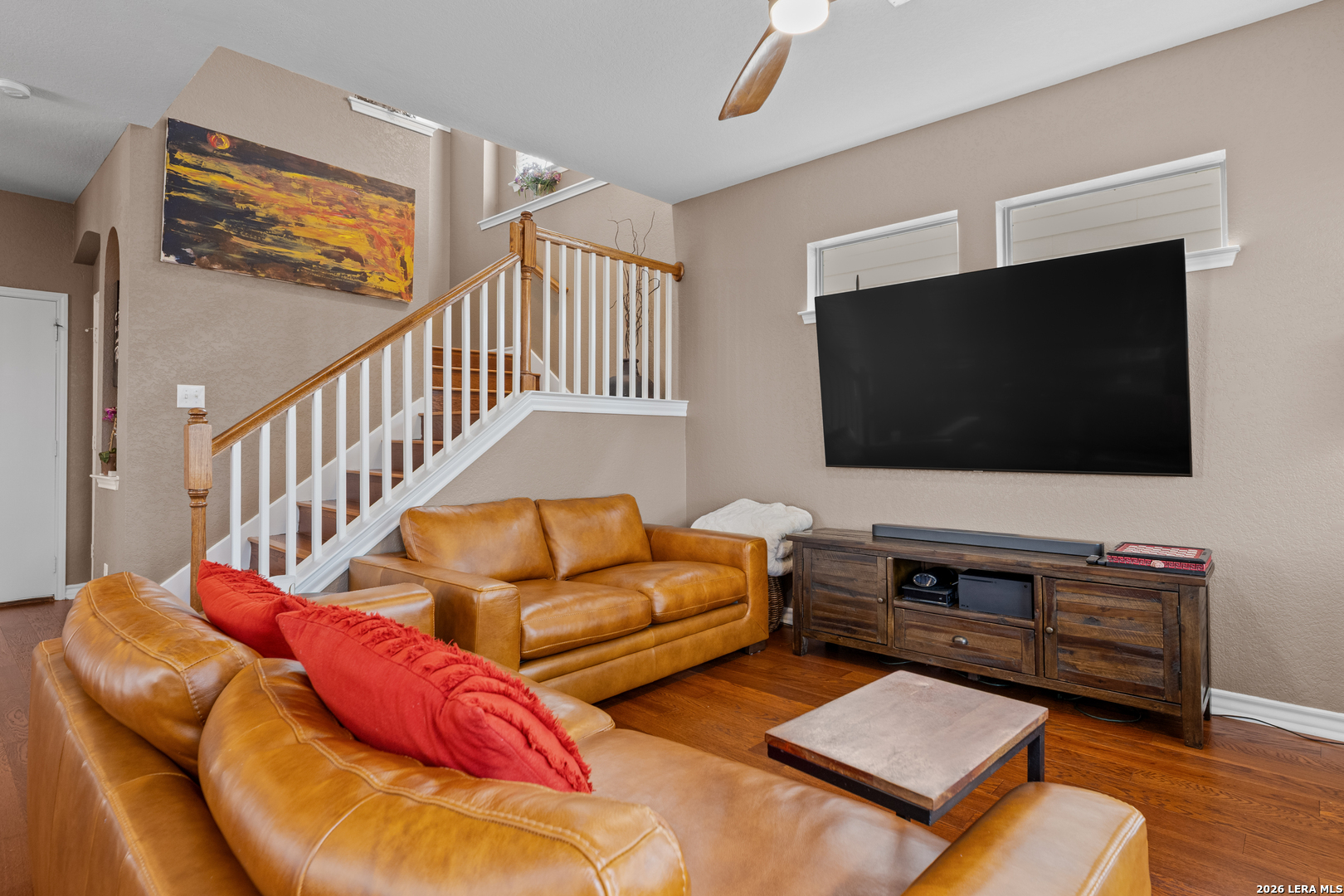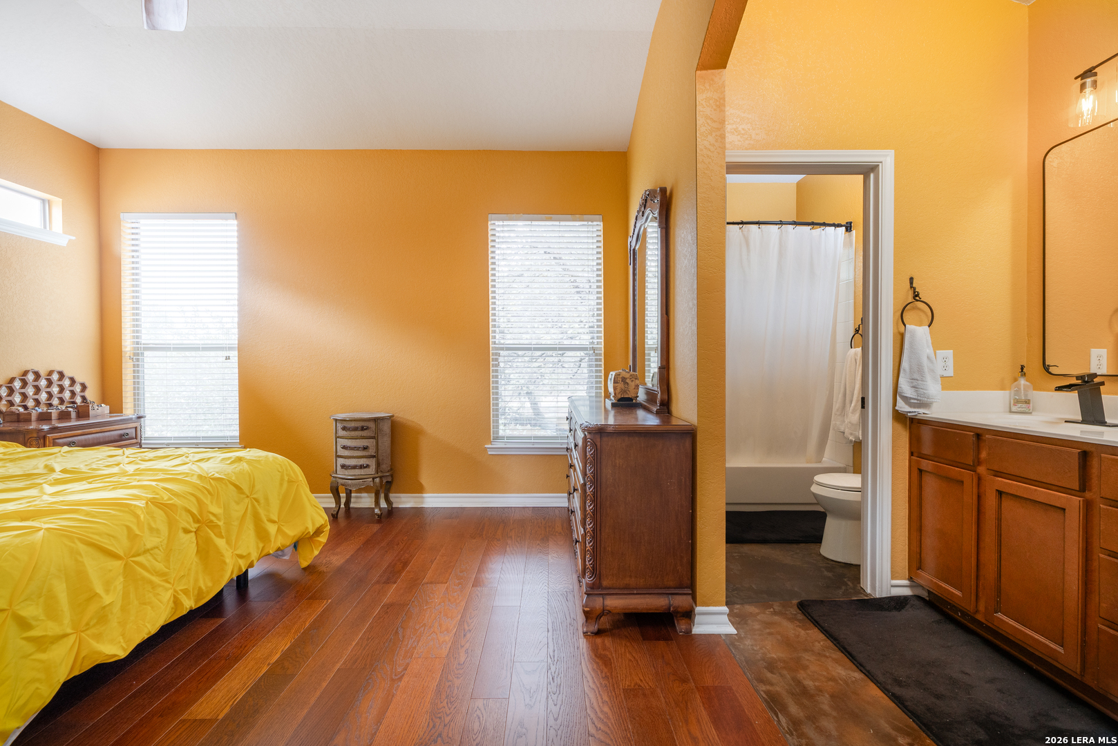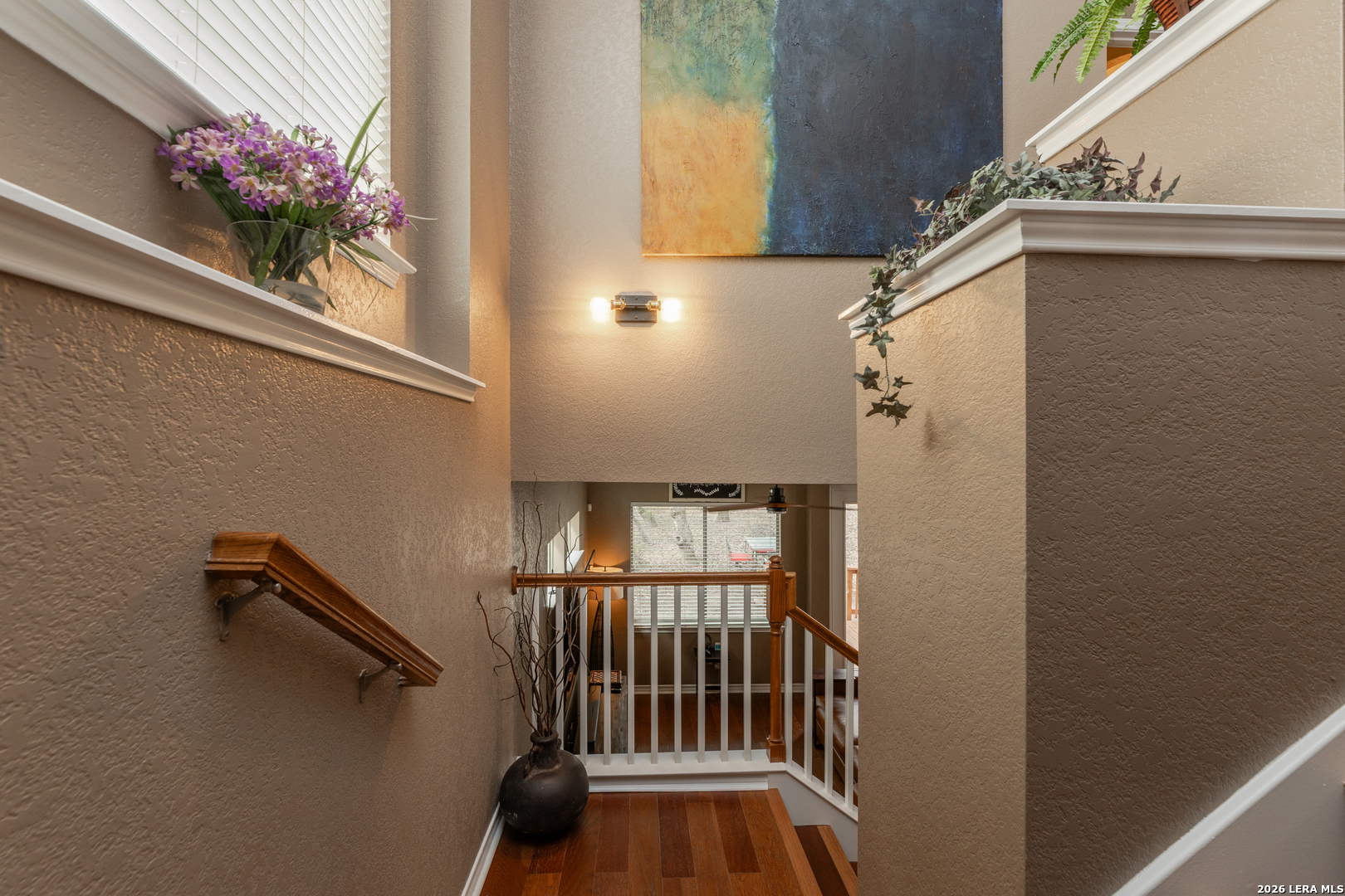 Welcome to 1235 Nicholas Manor, a beautifully maintained home in the highly sought-after gated community of The Villages of Stone Oak. Nestled in the heart of prestigious Stone Oak, this 2-bedroom, 2.5-bath residence offers a perfect blend of comfort, style, and convenience. The thoughtfully designed open floor plan features wood flooring throughout, architectural niches, and abundant natural light. The dining area is highlighted by vaulted ceilings, an elegant chandelier, and a charming alcove window. The chef's kitchen is both functional and inviting, showcasing stainless steel appliances, ample cabinetry, and a generous center island. Glass doors off the living room open to a private backyard with deck creating a seamless indoor-outdoor living experience. Upstairs, you'll find two spacious primary suites with en-suite bathrooms, along with a versatile loft featuring high ceilings. Additional highlights include an oversized two-car garage, a fully enclosed backyard with mature trees, new modern fixtures and hardware, new HVAC system, and enhanced smart-home technology with Nest thermostat and Nest security system featuring three cameras. The home conveys with refrigerator, washer and dryer, and mounted 75" and 55" TVs with acceptable offer. Conveniently located near Hwy 281, Loop 1604, walking trails, a dog park, and a variety of nearby amenities, this home truly has it all.