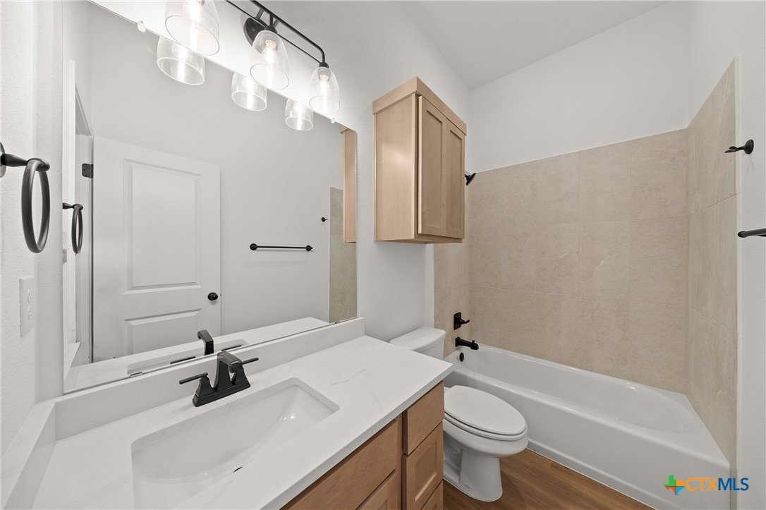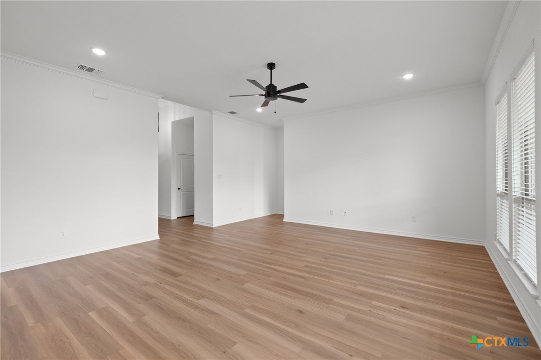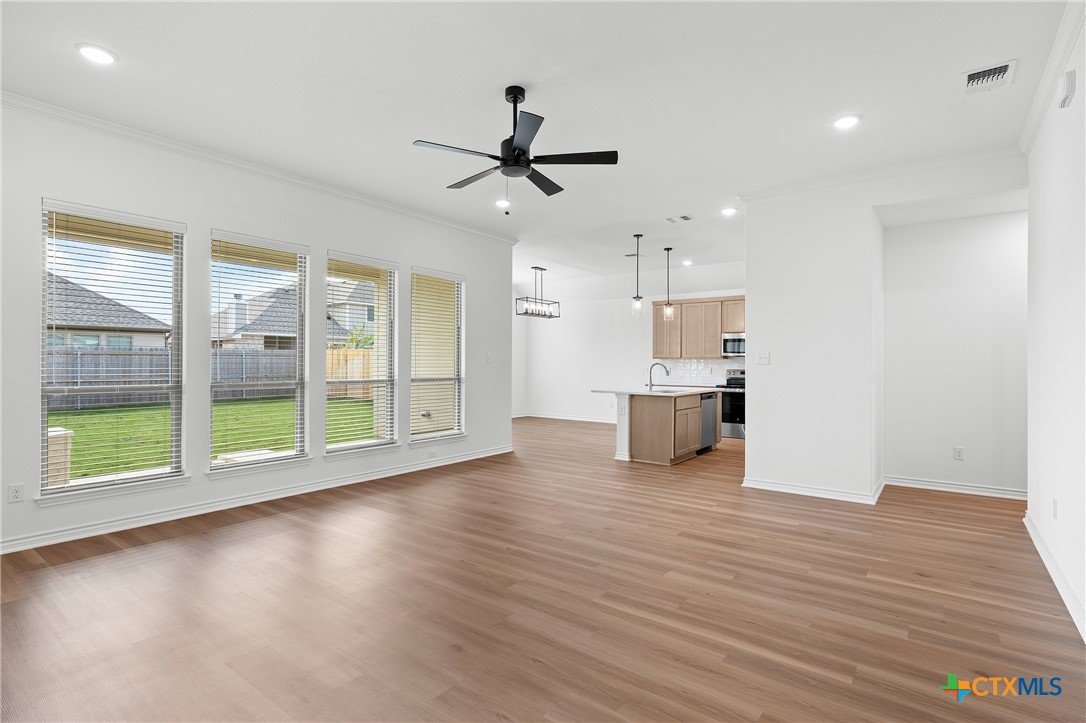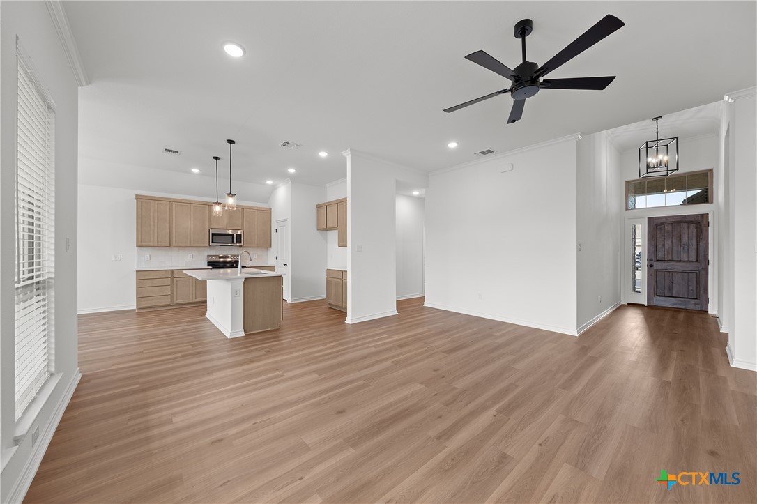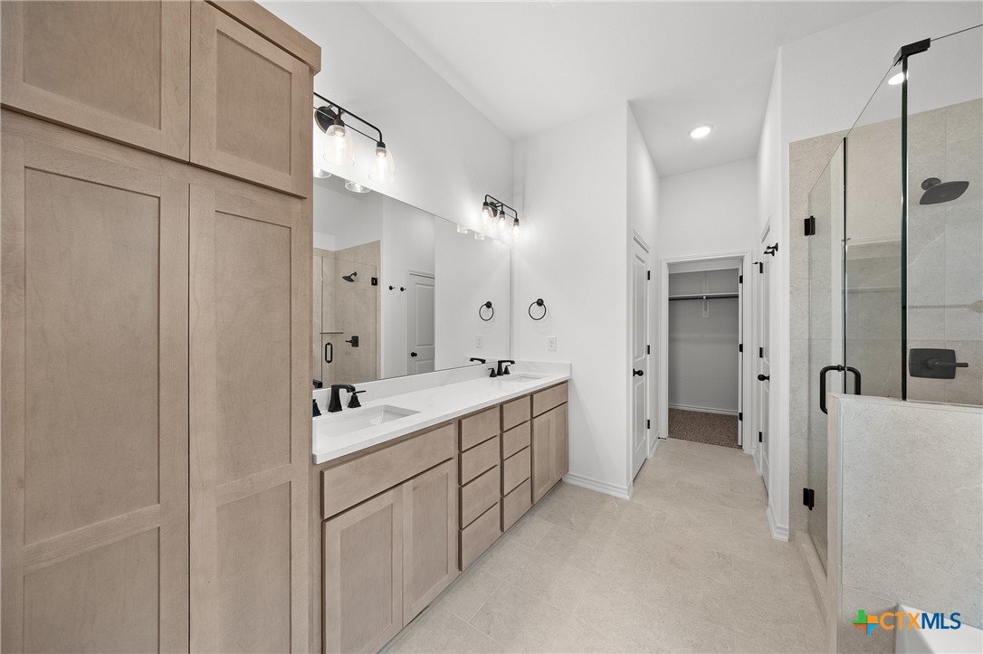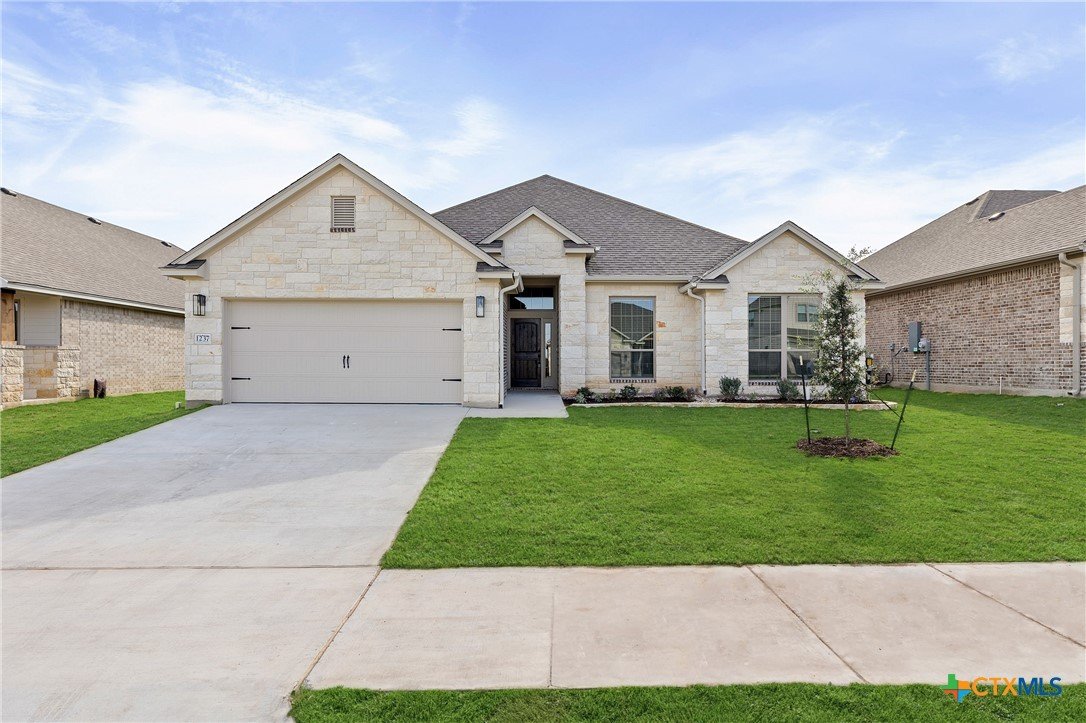 A popular choice among young families, the 1,875-square-foot Houston floor plan offers a suitable living space with four bedrooms and two bathrooms. The kitchen includes stainless steel appliances and a large walk-in pantry, while the primary suite has dual vanity sinks, a private water closet, and a walk-in closet. Plan variations include a walk-in shower or a separate tub and shower in the primary bath and an outdoor fireplace.