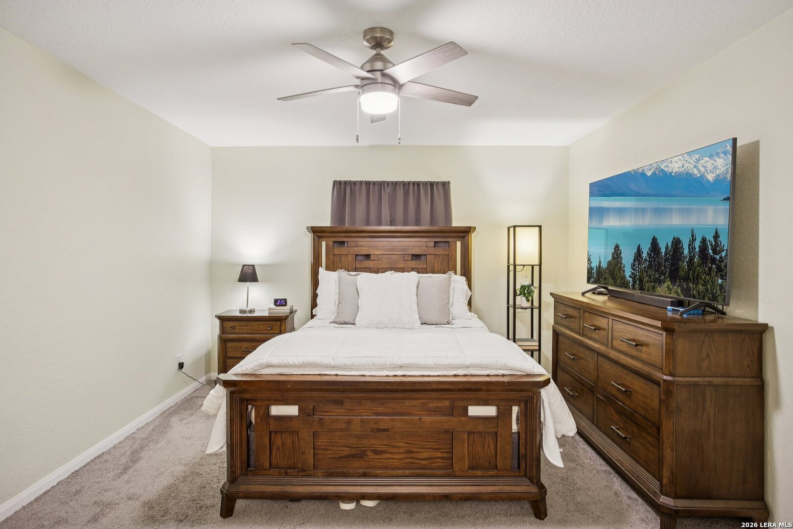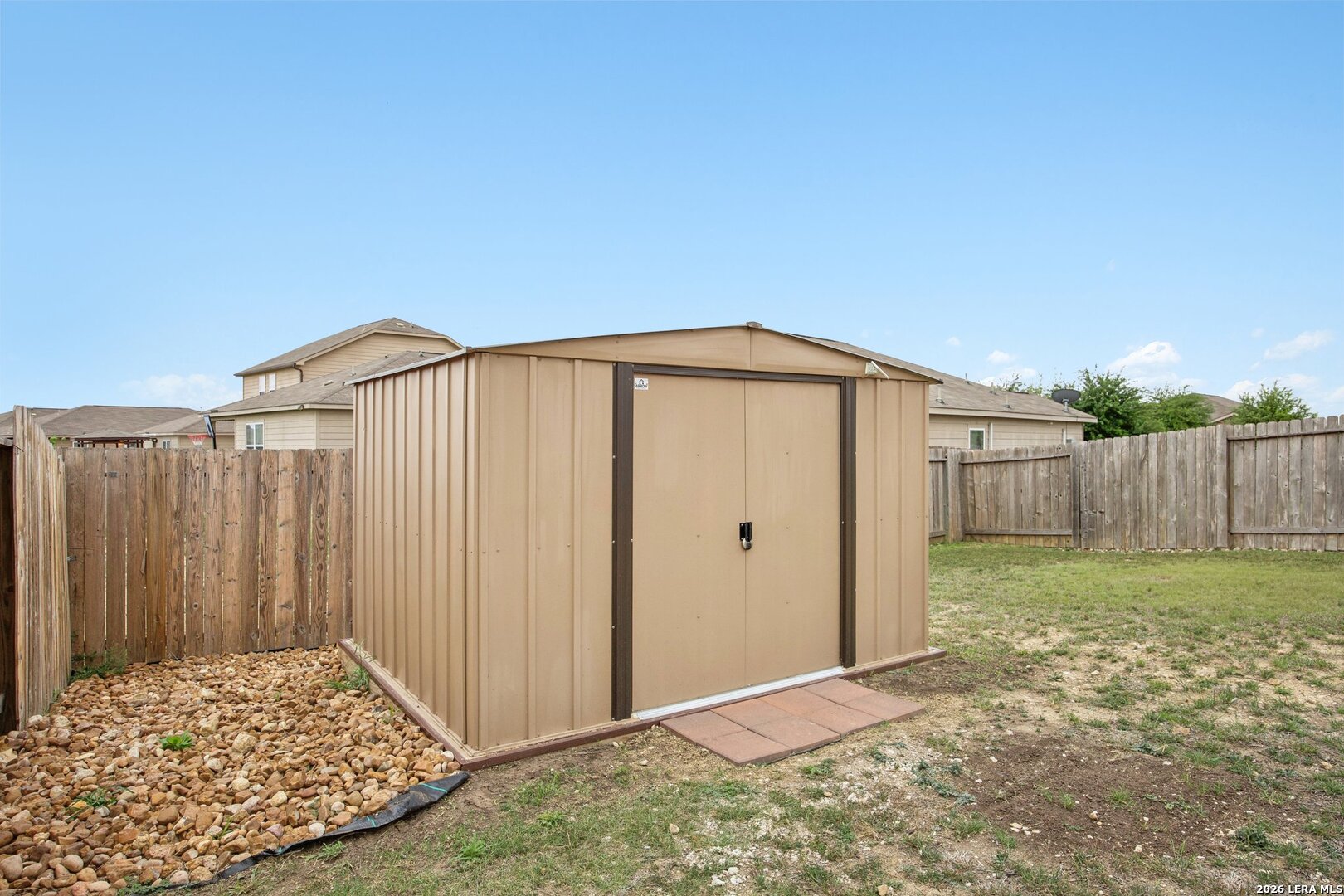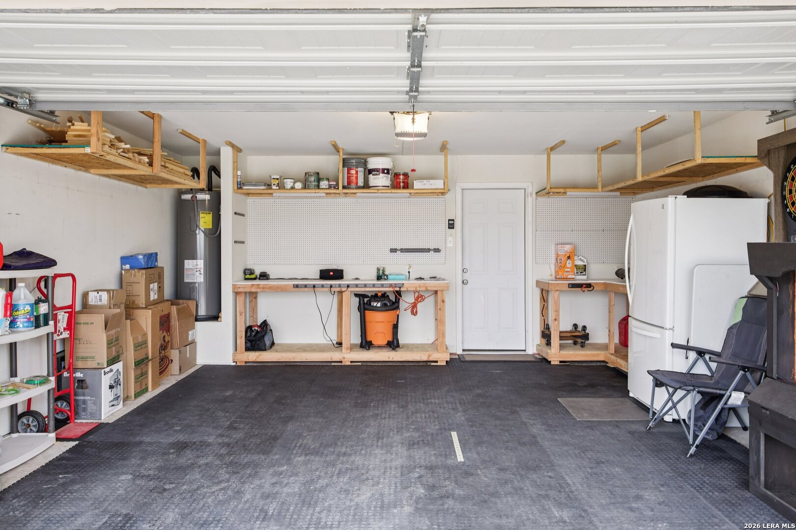 Located in Luckey Ranch within Medina Valley Independent School District, this move-in ready one-story home offers an ideal combination of affordability, convenience, and recent updates. Recent east/west widening of Highway 90 makes commuting into San Antonio easier than ever while still enjoying the neighborhood amenities of Luckey Ranch, including a pool, park, clubhouse, jogging trails, sports courts, playground, BBQ area, and bike trails. Inside, the home features one living area with vinyl flooring, an eat-in kitchen with tile floors, breakfast bar, under-cabinet lighting, electric cooking, and new kitchen appliances. The split-bedroom layout offers a spacious primary suite with walk-in closet and private bath, while both secondary bedrooms are located separately for privacy. Fresh interior paint on the walls, ceilings, doors, and trim, along with new light fixtures and ceiling fans, give the home a clean and updated feel. The backyard is designed for everyday enjoyment with a covered patio, fire pit area, storage shed, privacy fence, and plenty of room to entertain or relax. The garage has been upgraded with grid tile flooring, overhead storage, shelving, workbench space, beverage fridge, and water softener, making it ideal for hobbies, projects, or additional storage.