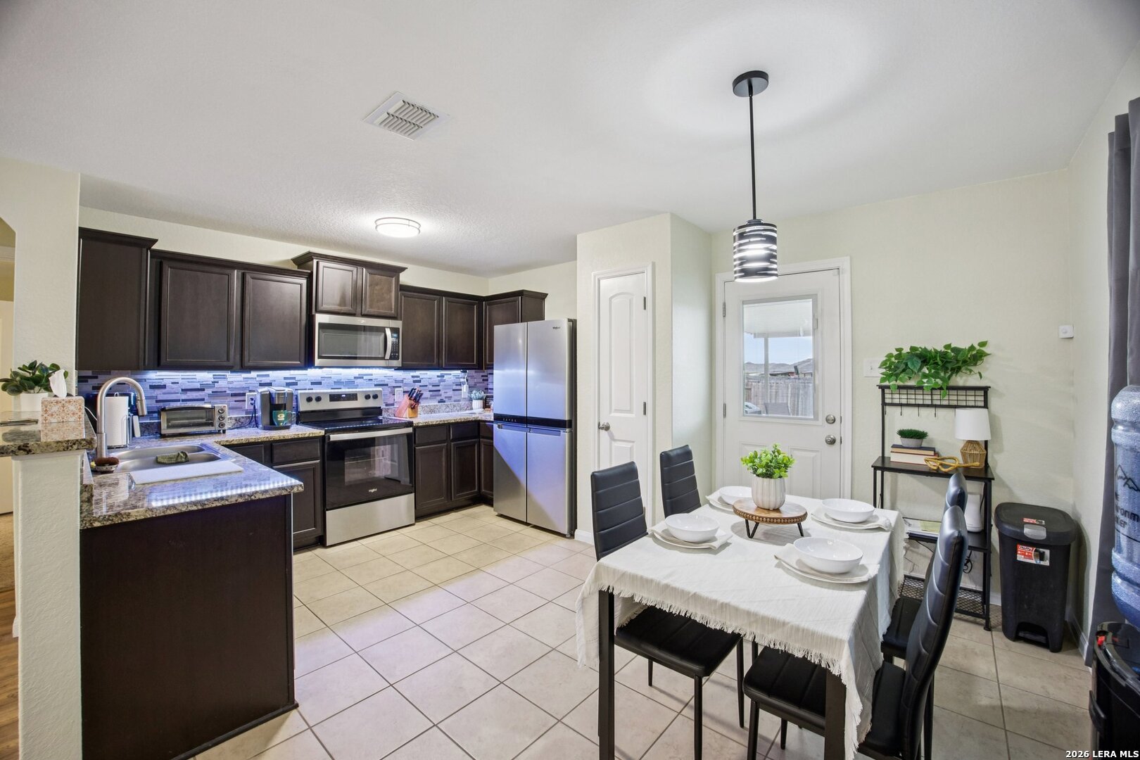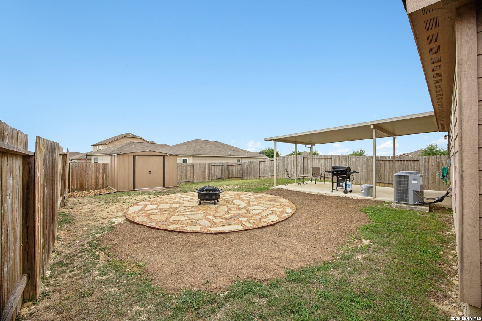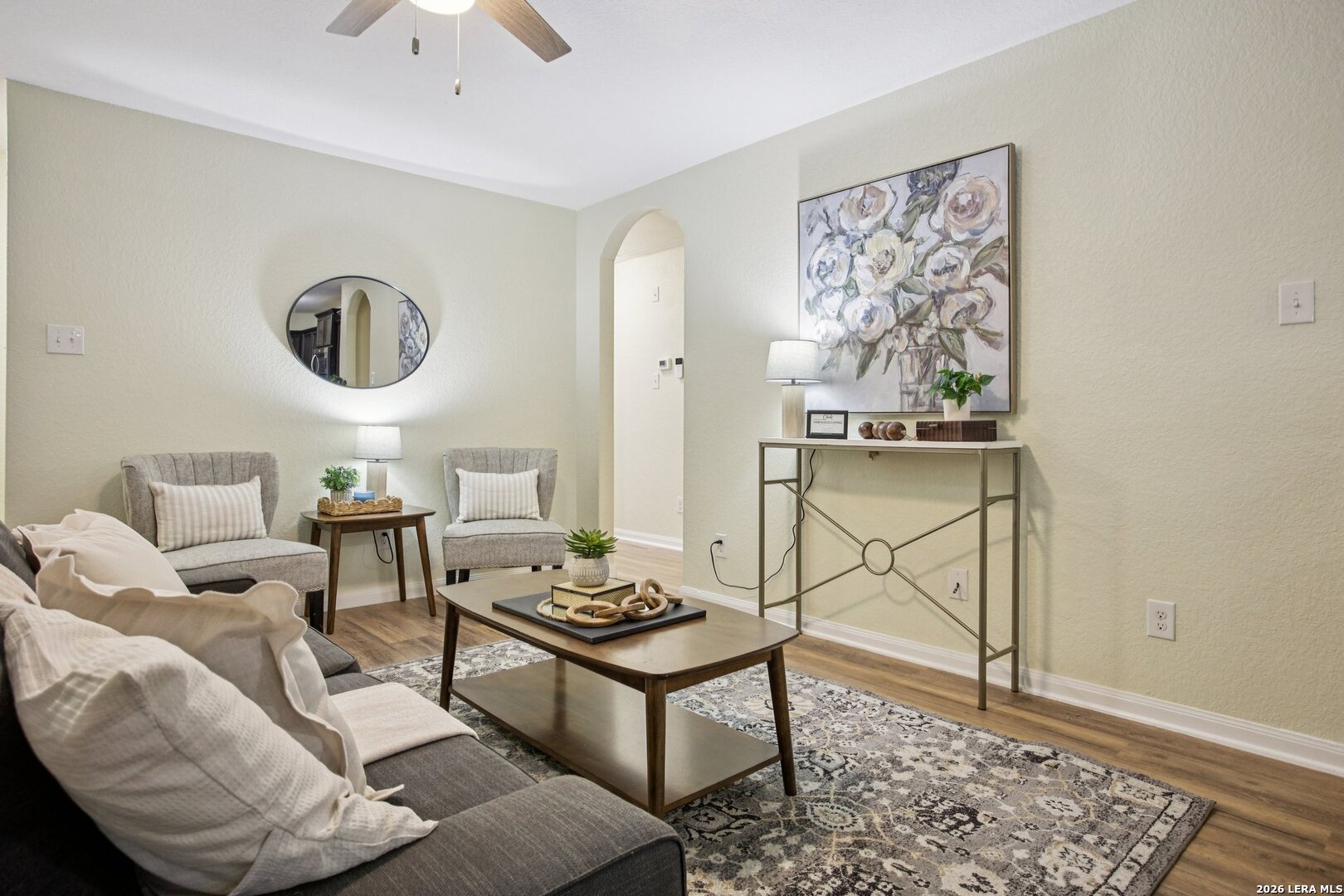 Located in Luckey Ranch within Medina Valley Independent School District, this move-in ready one-story home offers an ideal combination of affordability, convenience, and recent updates. Recent east/west widening of Highway 90 makes commuting into San Antonio easier than ever while still enjoying the neighborhood amenities of Luckey Ranch, including a pool, park, clubhouse, jogging trails, sports courts, playground, BBQ area, and bike trails. Inside, the home features one living area with vinyl flooring, an eat-in kitchen with tile floors, breakfast bar, under-cabinet lighting, electric cooking, and new kitchen appliances. The split-bedroom layout offers a spacious primary suite with walk-in closet and private bath, while both secondary bedrooms are located separately for privacy. Fresh interior paint on the walls, ceilings, doors, and trim, along with new light fixtures and ceiling fans, give the home a clean and updated feel. The backyard is designed for everyday enjoyment with a covered patio, fire pit area, storage shed, privacy fence, and plenty of room to entertain or relax. The garage has been upgraded with grid tile flooring, overhead storage, shelving, workbench space, beverage fridge, and water softener, making it ideal for hobbies, projects, or additional storage.