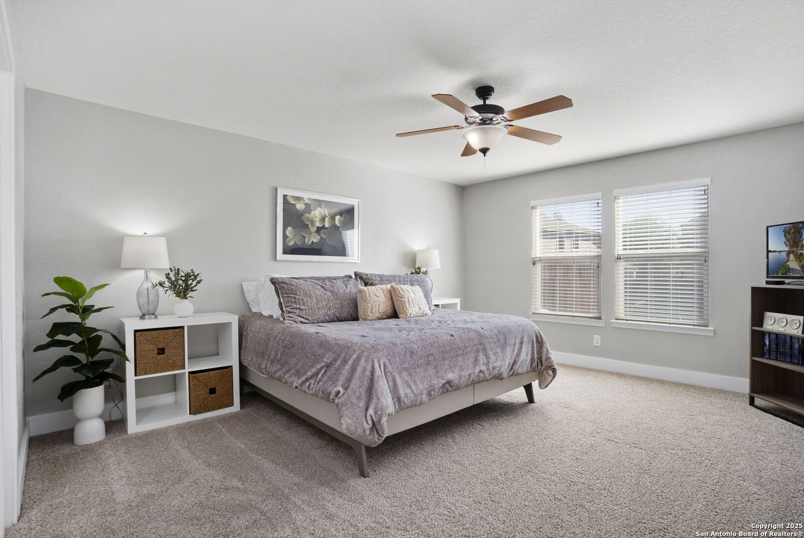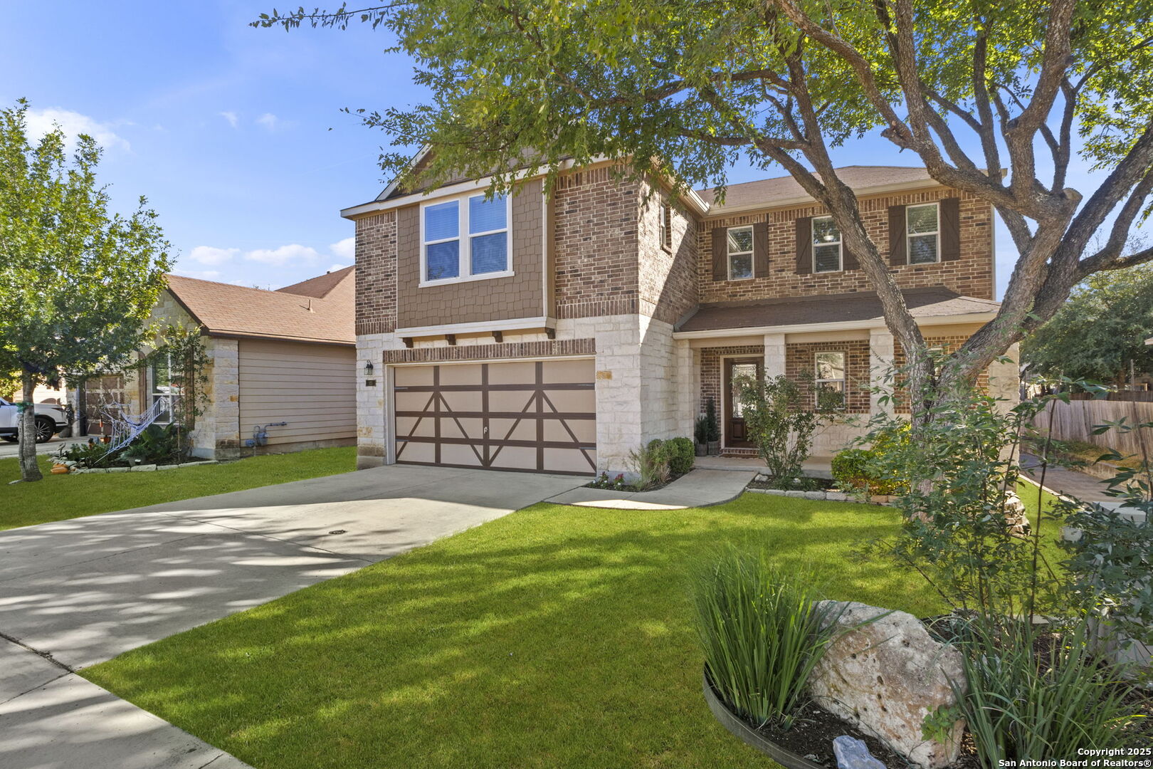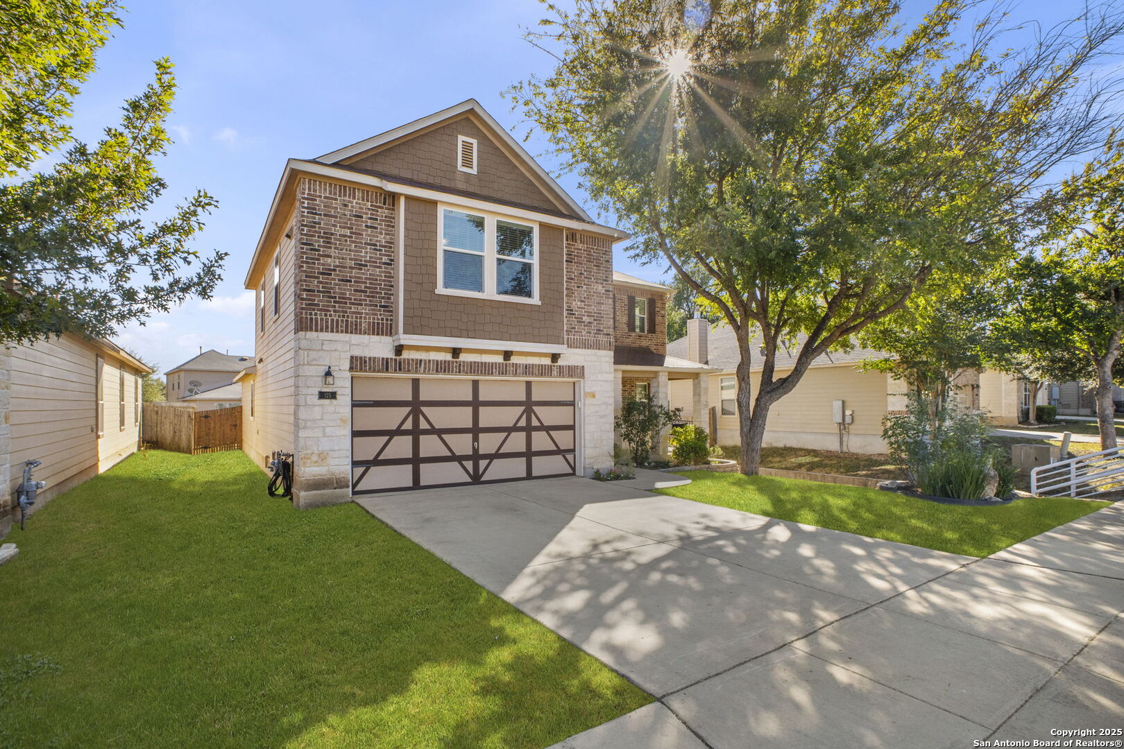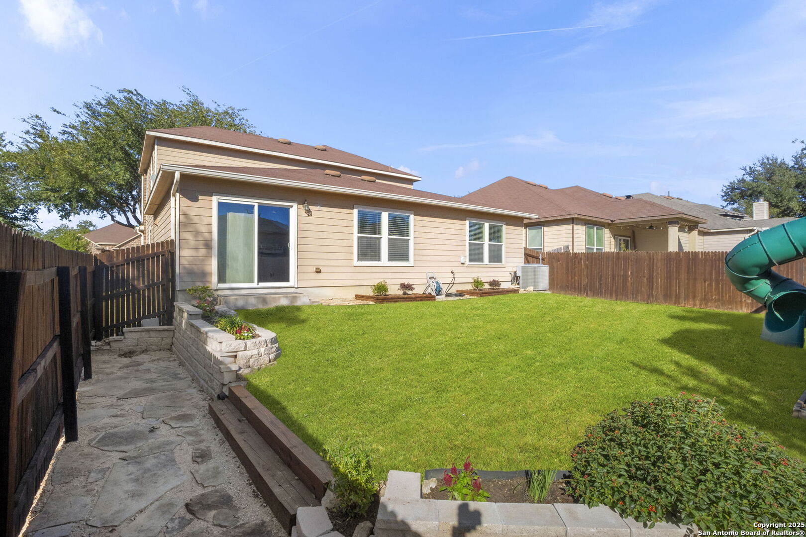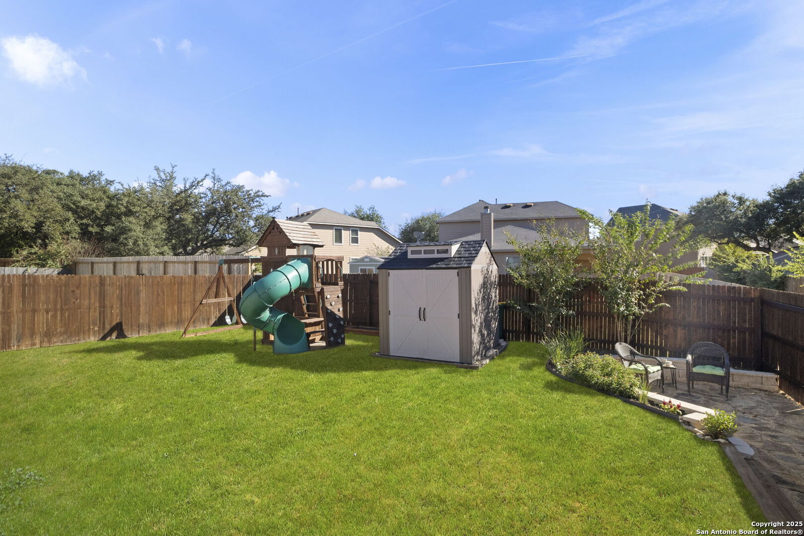 Most popular floor plan in the neighborhood with the primary bedroom downstairs. Home is in great condition and has been conscientiously maintained. Many recent upgrades to include interior paint, flooring in primary bedroom and bath and landscaping. Game room upstairs with secondary bedrooms, all with walk in closets. Additional features include ceiling fans throughout, wired for surround sound, and attic storage. Fully fenced backyard with play structure and shed that stays! Owner is offering a one year home warranty plan through Fidelity National Home Warranty. Community features include large neighborhood pool and splash pad, covered playground, basketball court, walking trail to Cibolo Nature Center and Boerne City Park. Home is walking distance to elementary and high schools.