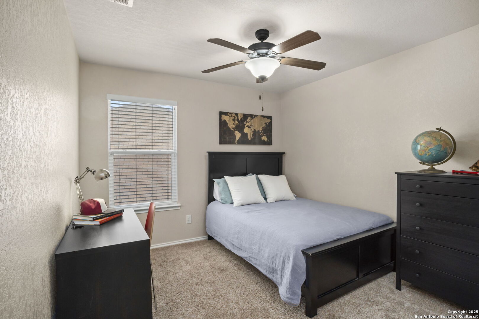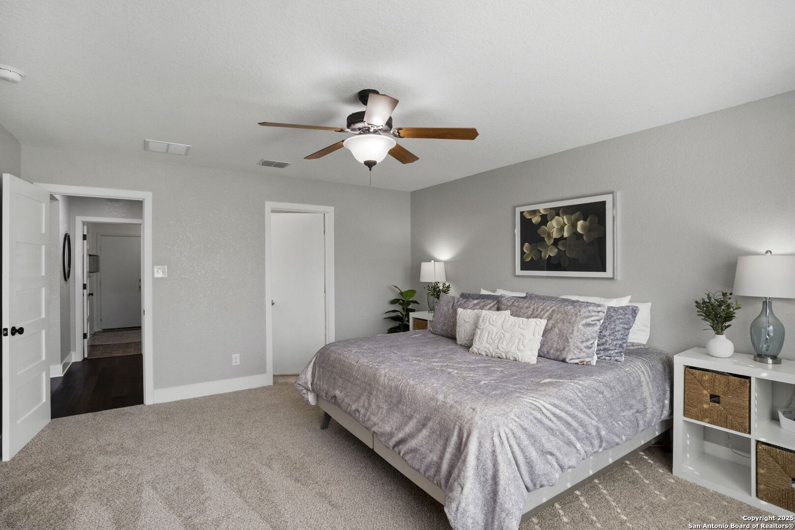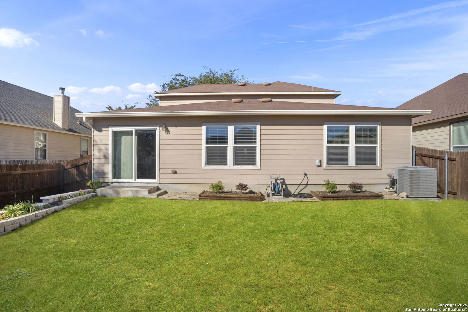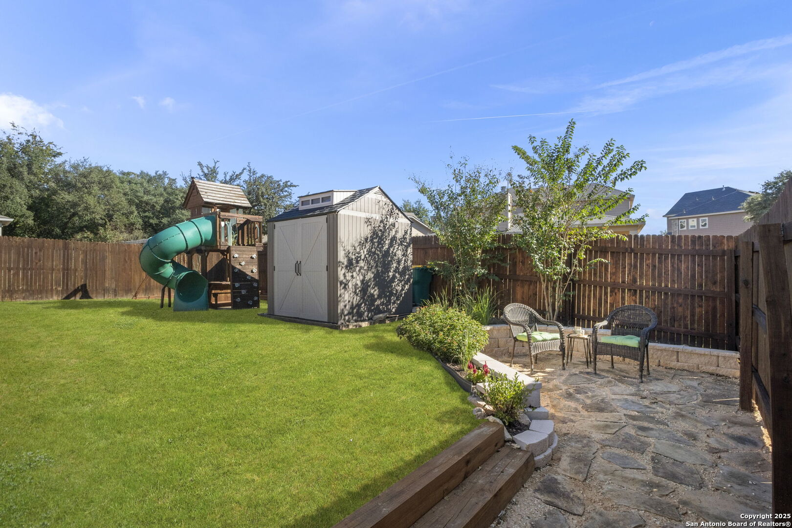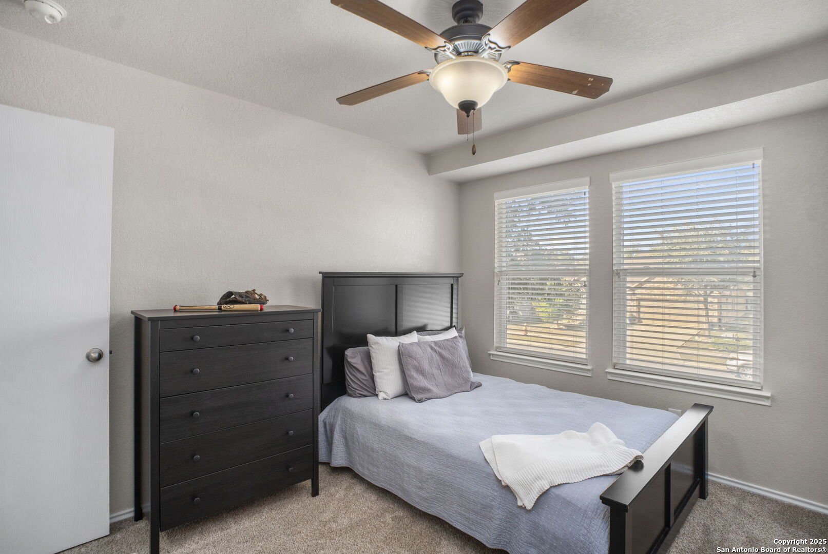 Most popular floor plan in the neighborhood with the primary bedroom downstairs. Home is in great condition and has been conscientiously maintained. Many recent upgrades to include interior paint, flooring in primary bedroom and bath and landscaping. Game room upstairs with secondary bedrooms, all with walk in closets. Additional features include ceiling fans throughout, wired for surround sound, and attic storage. Fully fenced backyard with play structure and shed that stays! Owner is offering a one year home warranty plan through Fidelity National Home Warranty. Community features include large neighborhood pool and splash pad, covered playground, basketball court, walking trail to Cibolo Nature Center and Boerne City Park. Home is walking distance to elementary and high schools.