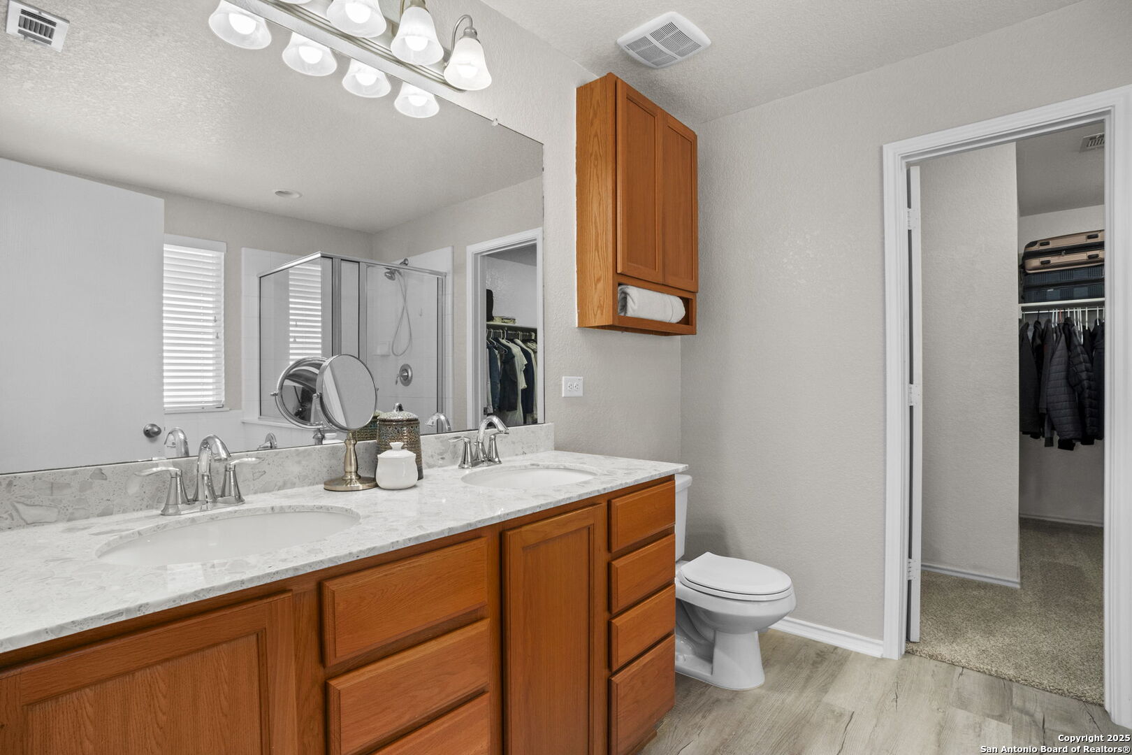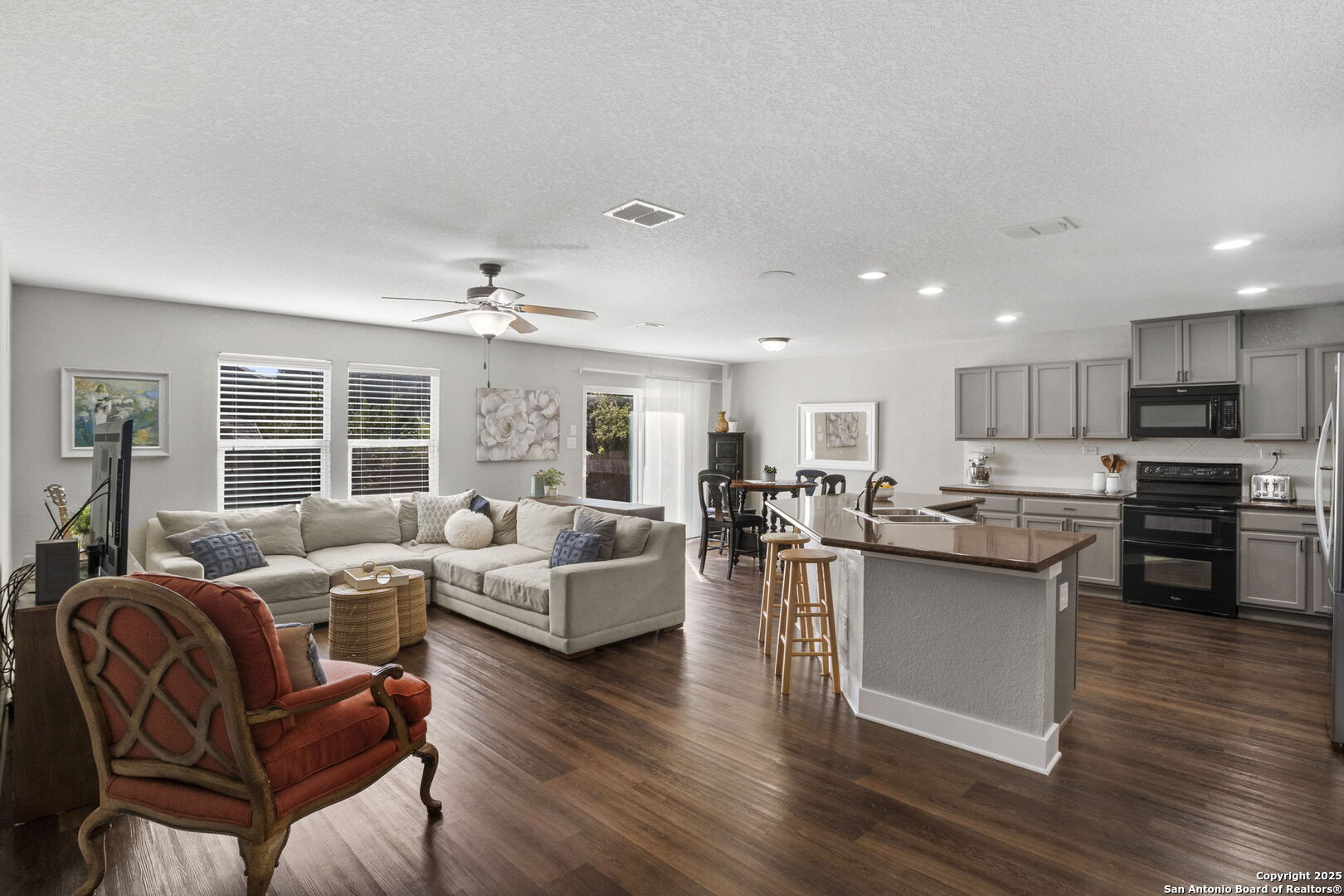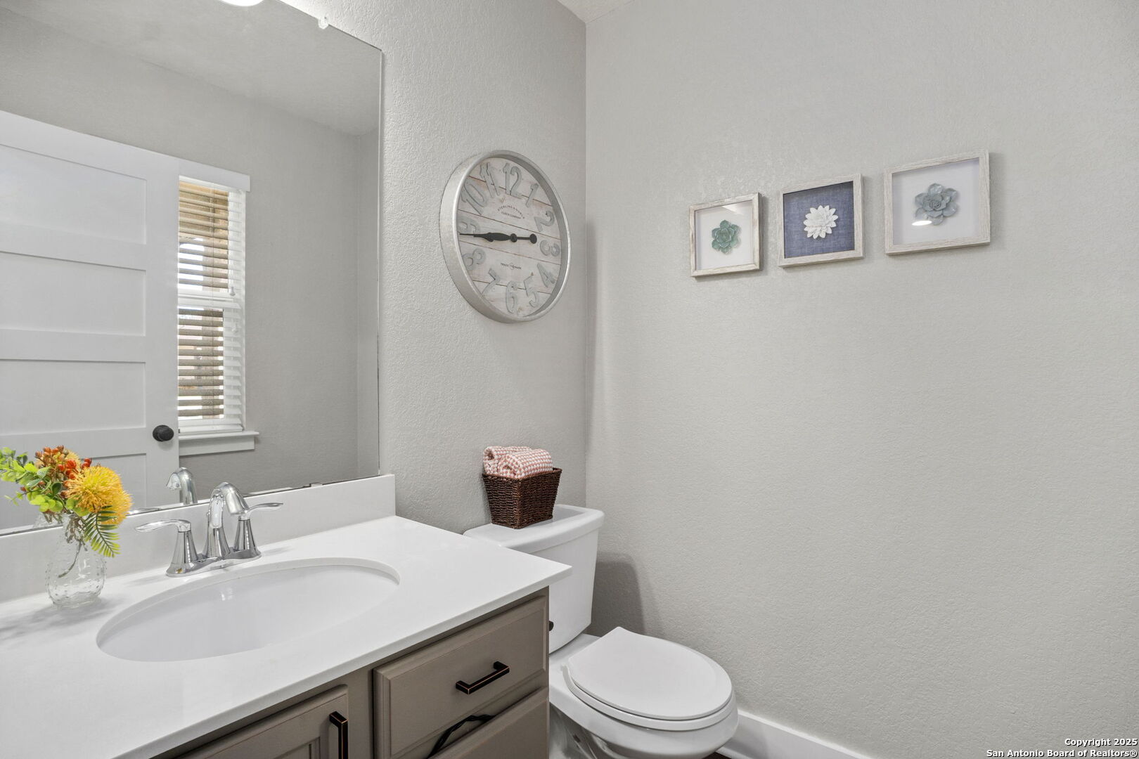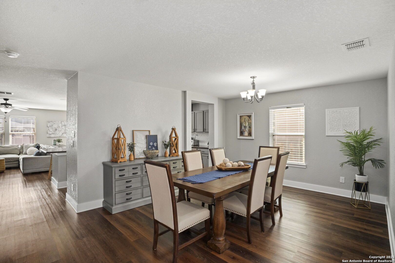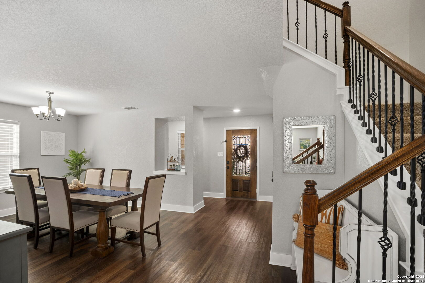 Most popular floor plan in the neighborhood with the primary bedroom downstairs. Home is in great condition and has been conscientiously maintained. Many recent upgrades to include interior paint, flooring in primary bedroom and bath and landscaping. Game room upstairs with secondary bedrooms, all with walk in closets. Additional features include ceiling fans throughout, wired for surround sound, and attic storage. Fully fenced backyard with play structure and shed that stays! Owner is offering a one year home warranty plan through Fidelity National Home Warranty. Community features include large neighborhood pool and splash pad, covered playground, basketball court, walking trail to Cibolo Nature Center and Boerne City Park. Home is walking distance to elementary and high schools.