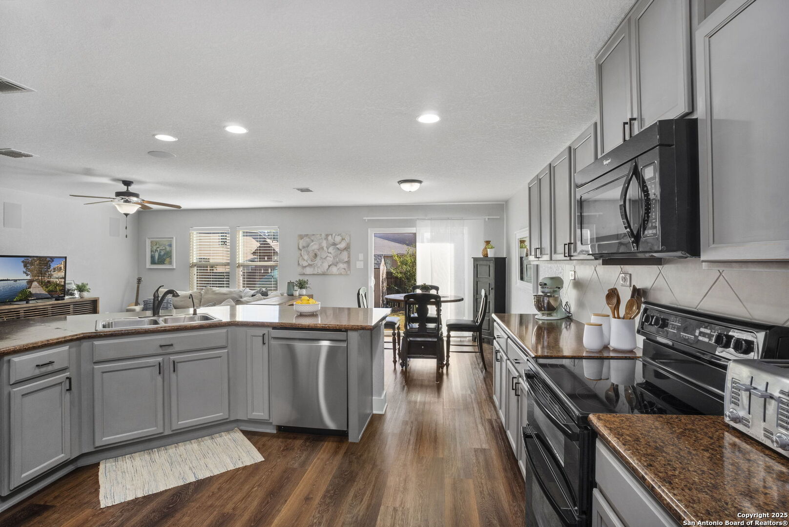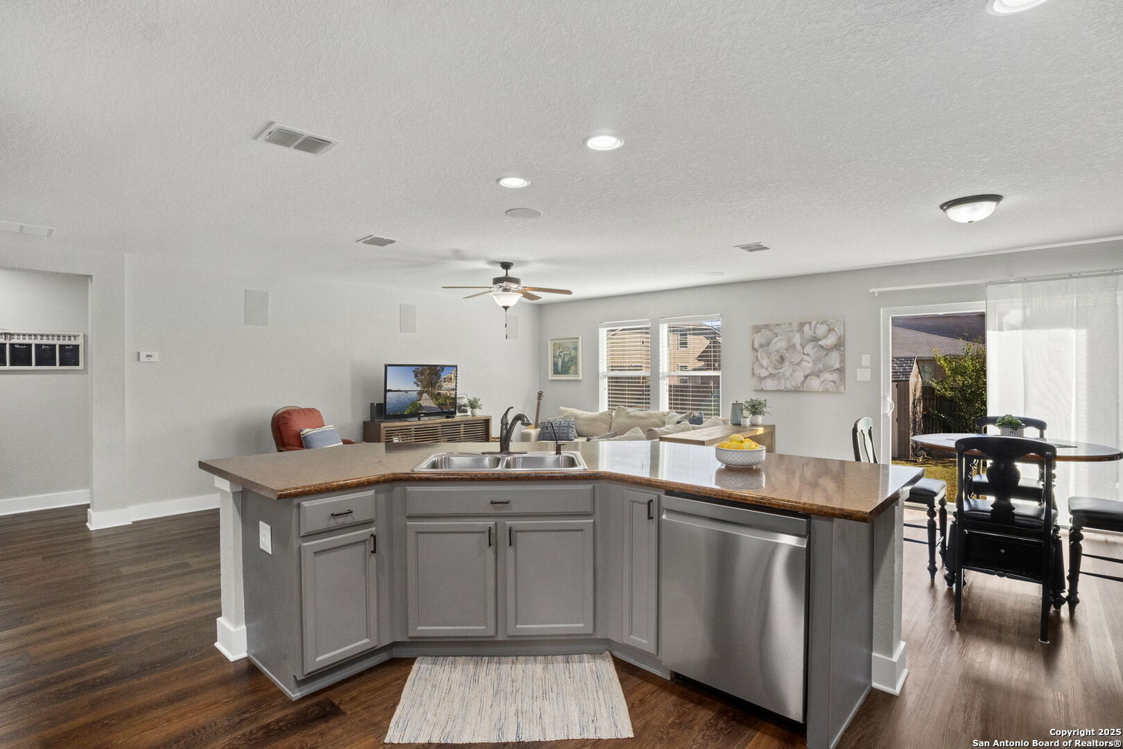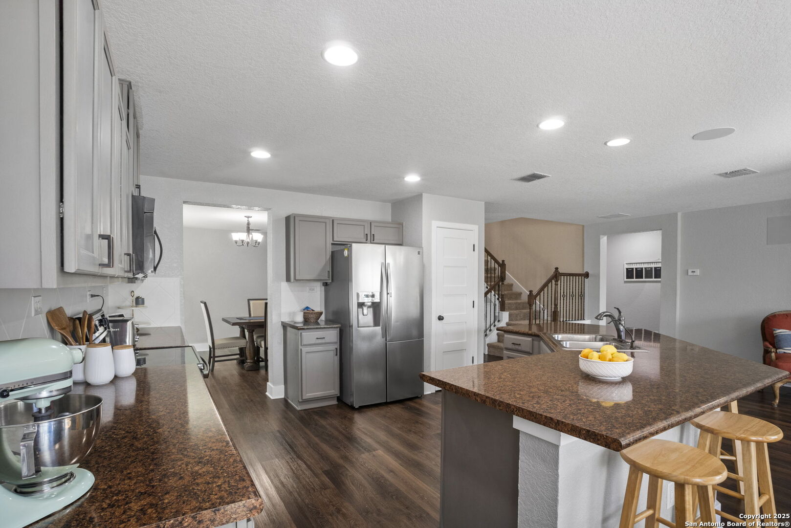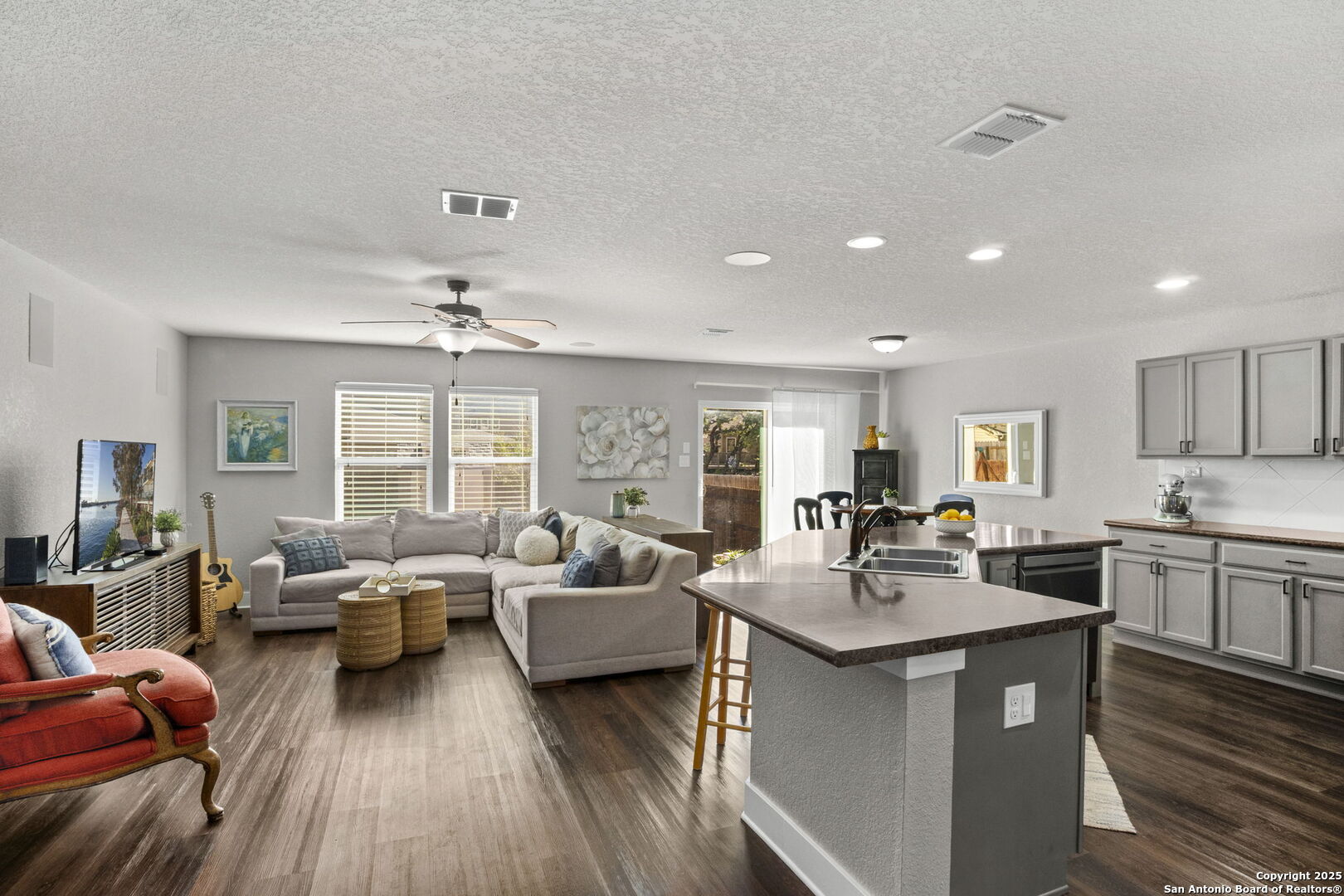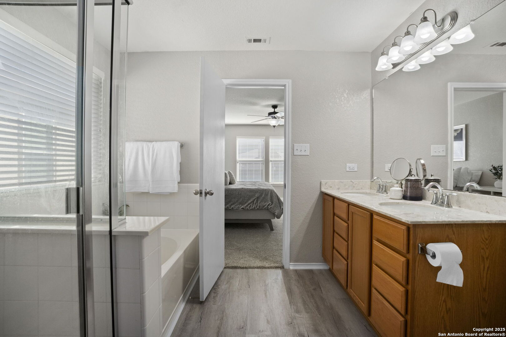 Most popular floor plan in the neighborhood with the primary bedroom downstairs. Home is in great condition and has been conscientiously maintained. Many recent upgrades to include interior paint, flooring in primary bedroom and bath and landscaping. Game room upstairs with secondary bedrooms, all with walk in closets. Additional features include ceiling fans throughout, wired for surround sound, and attic storage. Fully fenced backyard with play structure and shed that stays! Owner is offering a one year home warranty plan through Fidelity National Home Warranty. Community features include large neighborhood pool and splash pad, covered playground, basketball court, walking trail to Cibolo Nature Center and Boerne City Park. Home is walking distance to elementary and high schools.