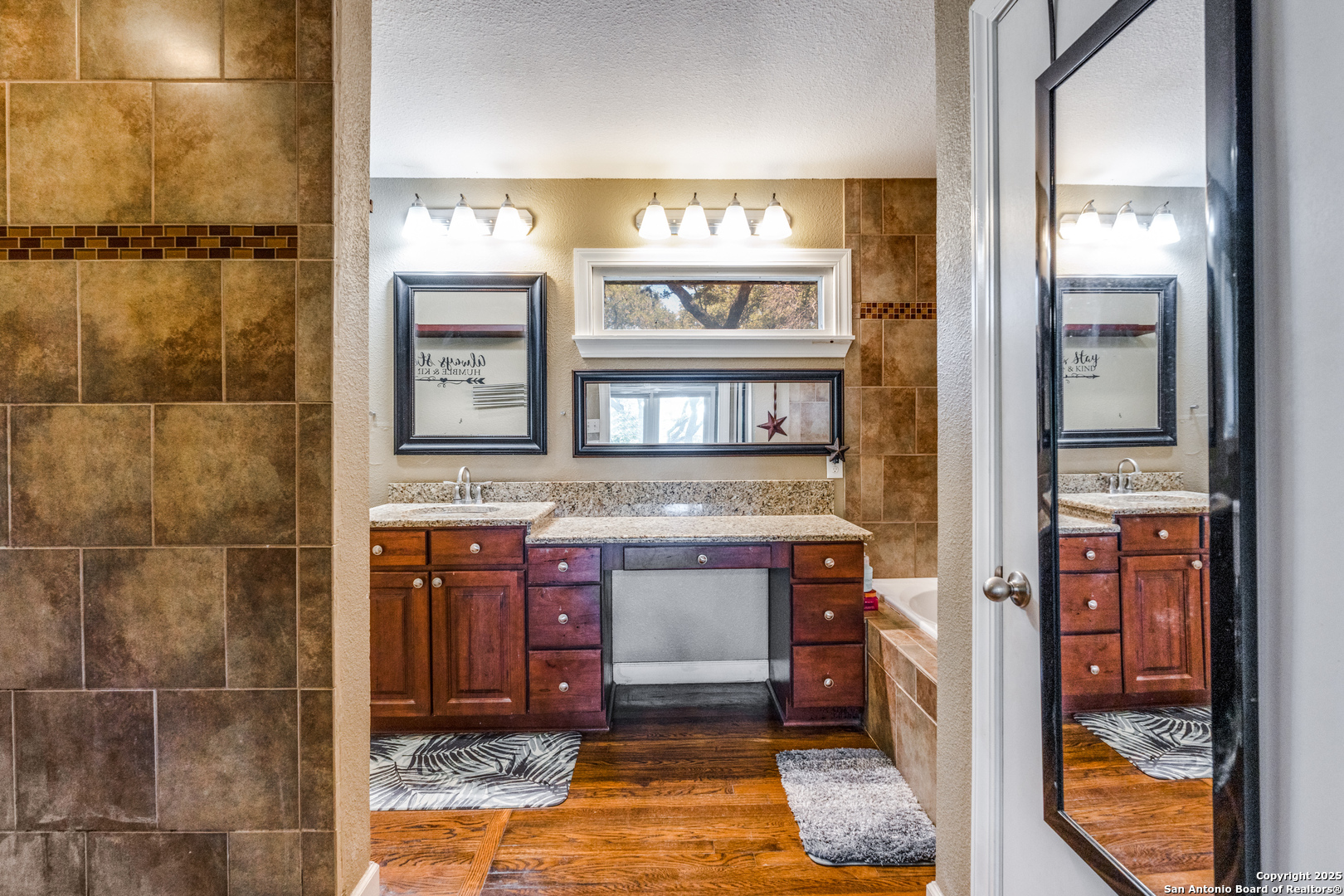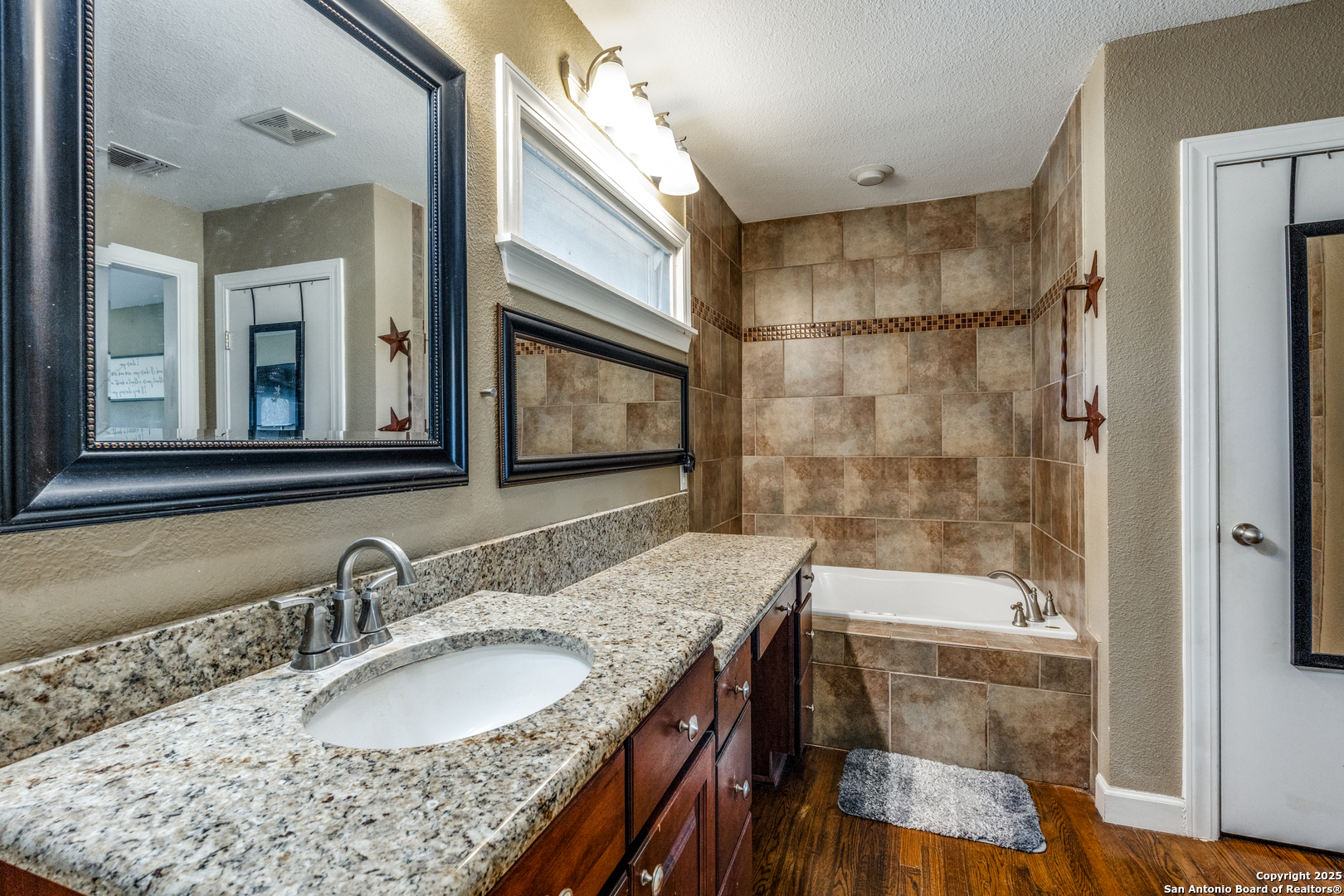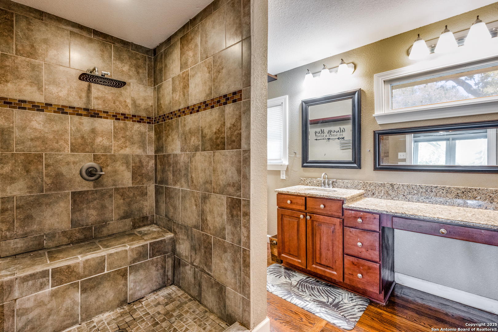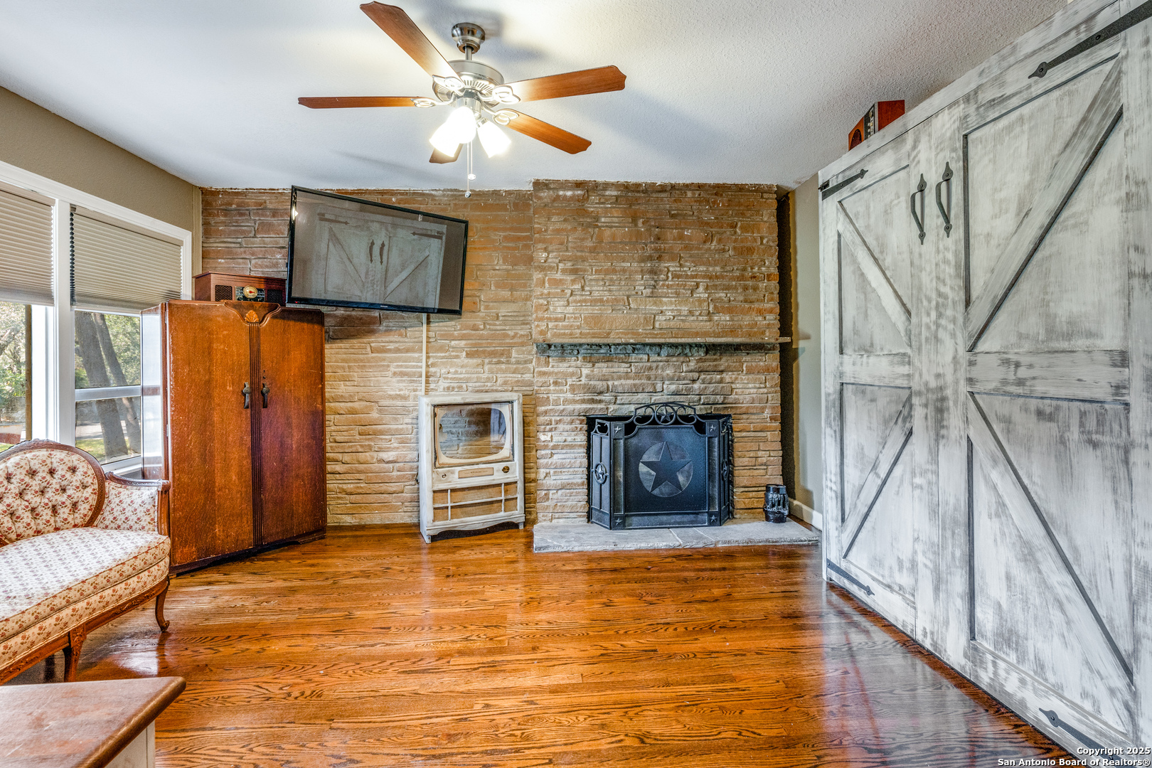 This charming 3-bedroom, 2-bathroom ranch-style home sits on an impressive 0.64-acre lot, offering plenty of space and privacy in one of the area's most sought-after neighborhoods known as Hollywood Park. The expansive yard provides endless potential, whether you envision a lush garden, outdoor entertaining space, or a future pool for relaxing and entertaining. Inside, you'll find beautiful cabinets in the kitchen featuring stainless steel appliances, granite countertops, and hardwood floors that flow seamlessly throughout the home. The spacious living areas are perfect for both everyday comfort and hosting guests. The home also features energy-efficient double pane windows, enhancing comfort and reducing utility costs. Step outside to a large covered patio, ideal for enjoying outdoors year-round. The home also includes a two-car garage and convenient proximity to shopping, dining, and major highways. Neighborhood amenities include community pool, basketball and tennis courts, sand volleyball, park/playground, and access to the Voigt Center which is perfect for entertaining large groups of guests. With no mandatory HOA and golf course access to Sonterra Country Club and nearby restaurants, this property offers the perfect blend of comfort, convenience, and opportunity.