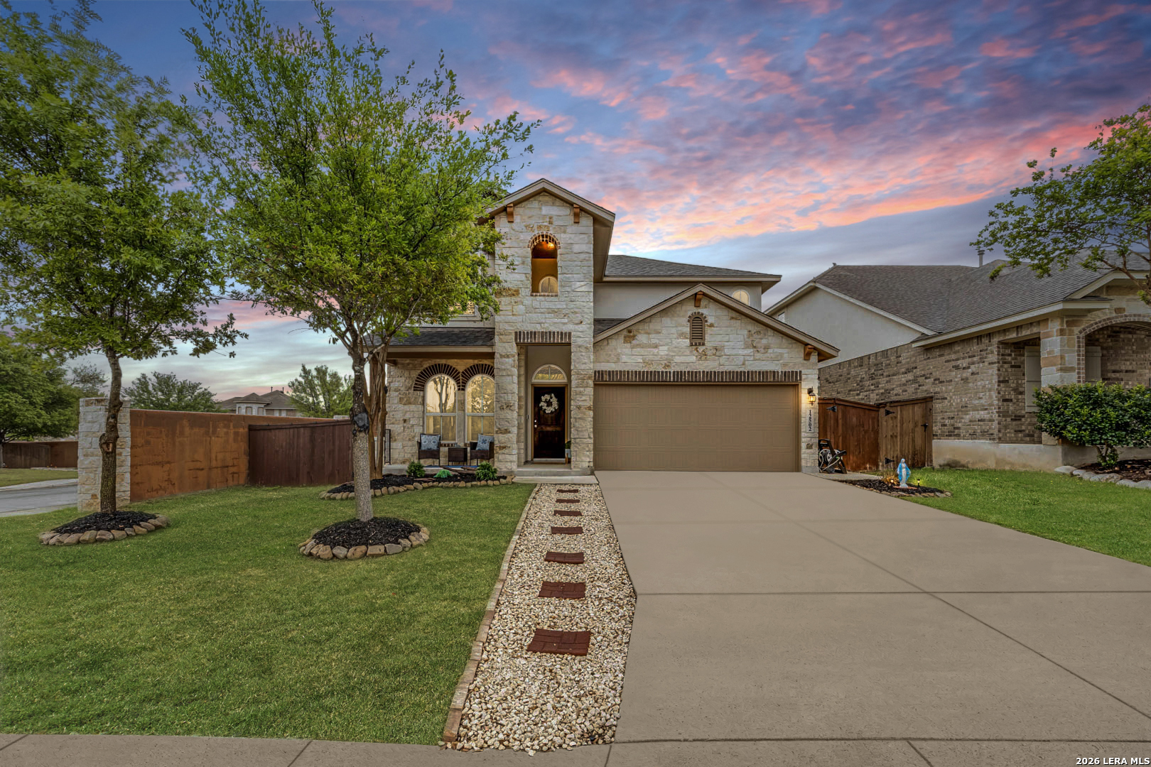Imagine starting your mornings with coffee on the covered front porch, watching the quiet rhythm of the neighborhood as the day begins. On school days, the walk is an easy one. From 12502 Hillside Ranch, you can walk your kids to the neighborhood elementary school, turning a simple routine into a moment together. Situated on a corner lot in the highly sought-after Stillwater Ranch community, this 4-bedroom, 2.5-bathroom home offers something truly special: space, privacy, and thoughtful design inside and out. With no immediate rear neighbors, the backyard feels peaceful and secluded, creating a retreat that's perfect for both lively gatherings and quiet evenings under the Texas sky. From the curb, the home makes a beautiful first impression with its blend of brick, stone, and stucco, and carefully designed landscaping. Step inside and you're greeted by a dramatic two-story foyer filled with natural light. Just off the entry sits a versatile flex room framed by two large arched windows and elegant glass french doors. Whether used as a home office, playroom, gym, or creative space, this room adapts to whatever your life needs most! At the heart of the home, the kitchen was designed for connection. The oversized granite island with breakfast bar seating, stainless steel appliances, glass tile backsplash, corner pantry, and decorative pendant lighting make it both beautiful and functional. From here, the home opens effortlessly into the dining space and living room where vaulted ceilings create a bright, open atmosphere that feels perfect for everything from holiday gatherings to relaxed weeknight dinners. Privately situated on the first floor, the primary suite offers a serene retreat with soaring vaulted ceilings that enhance the sense of space and elegance. The spa-like ensuite bath features a granite dual-sink vanity, a relaxing soaking tub, a walk-in shower with elegant glass tile accents, and a spacious walk-in closet. Upstairs, the home continues to unfold with a large loft that functions as a second living area, ideal for movie nights, game days, or a playroom. Three generously sized bedrooms and a full bathroom provide plenty of room for family and guests, with ceiling fans thoughtfully added throughout the upstairs bedrooms, loft, and office. Outside, the backyard was designed to truly be enjoyed. The extended patio offers both covered and open space, perfect for grilling, hosting friends, or simply relaxing after a long day. Additional landscaping and gravel accents create a stylish, low-maintenance extension of the outdoor living area. Life in Stillwater Ranch means more than just a beautiful home. Residents enjoy two pools, a splash pad, fitness center, sports courts, playgrounds, and pickleball, creating a vibrant community where neighbors quickly become friends. At 12502 Hillside Ranch, it's easy to imagine the moments that make a house feel like home!