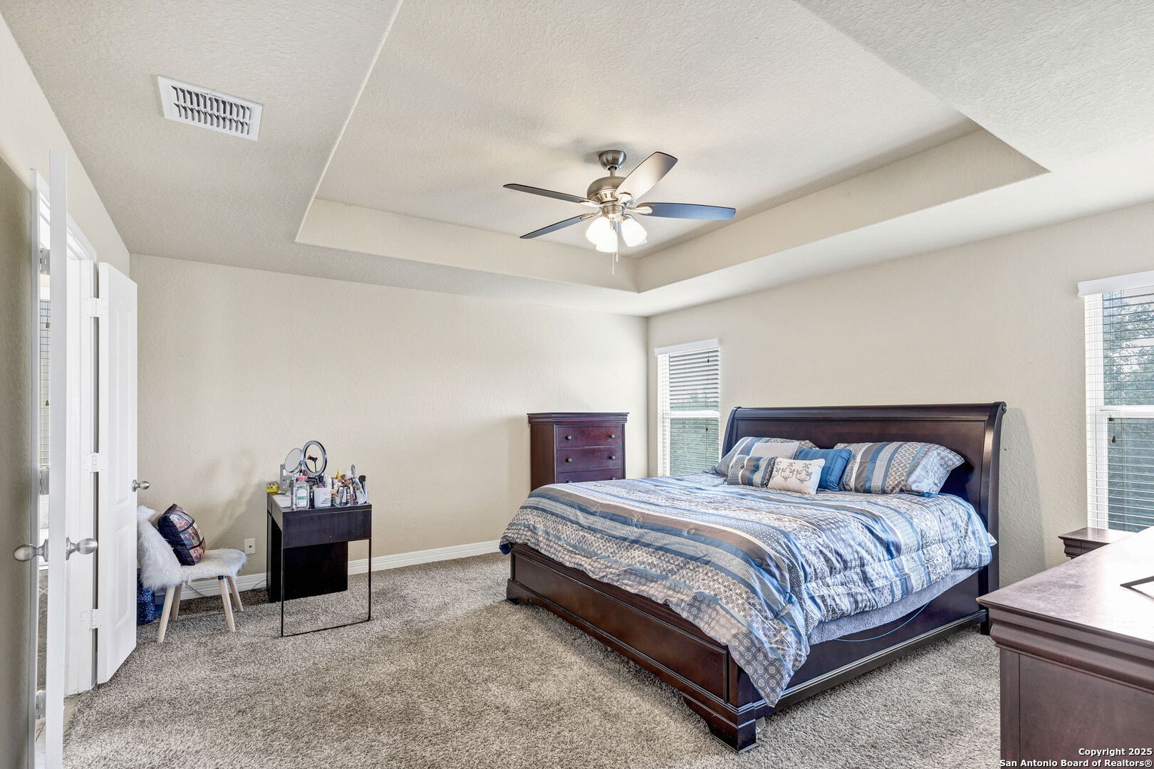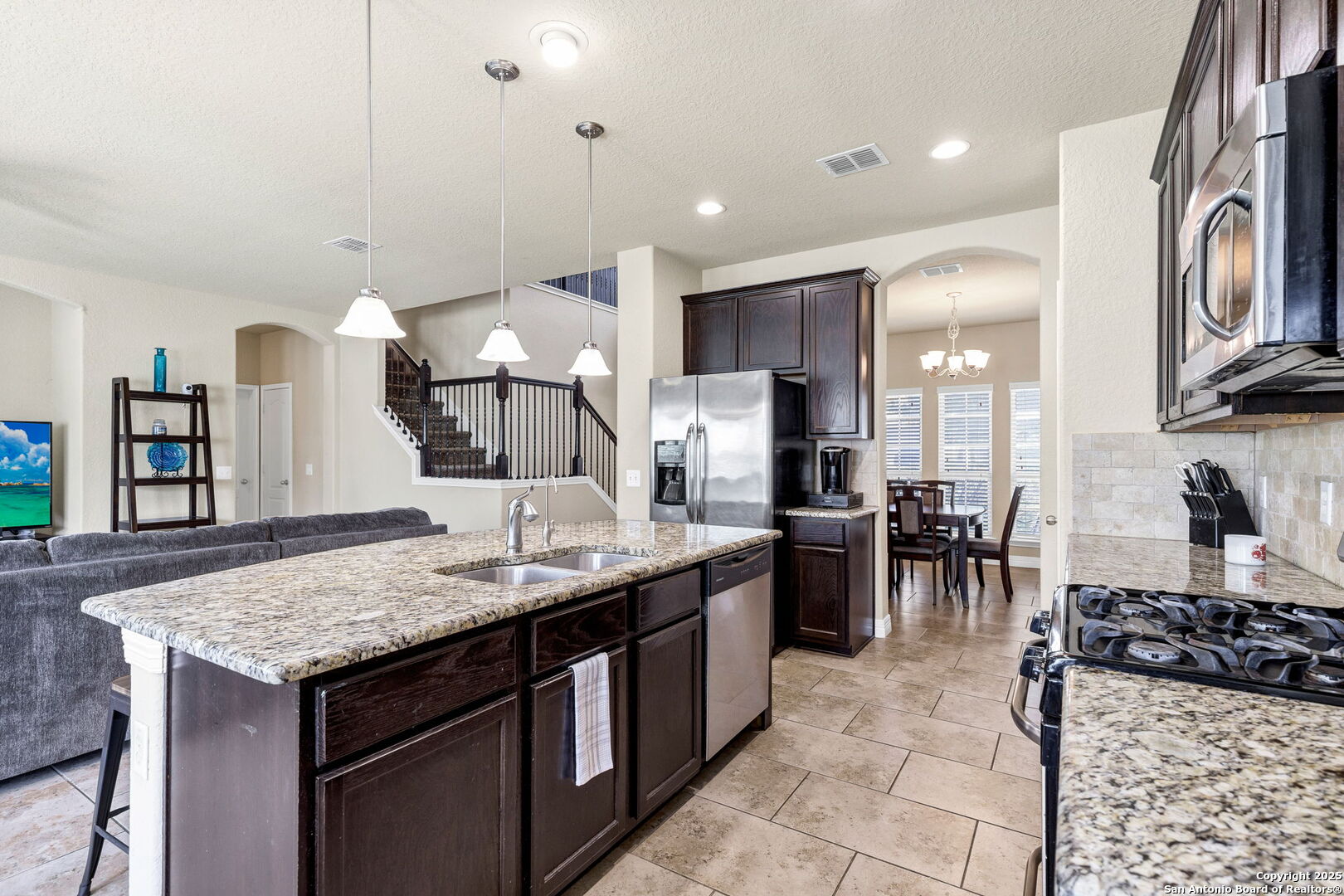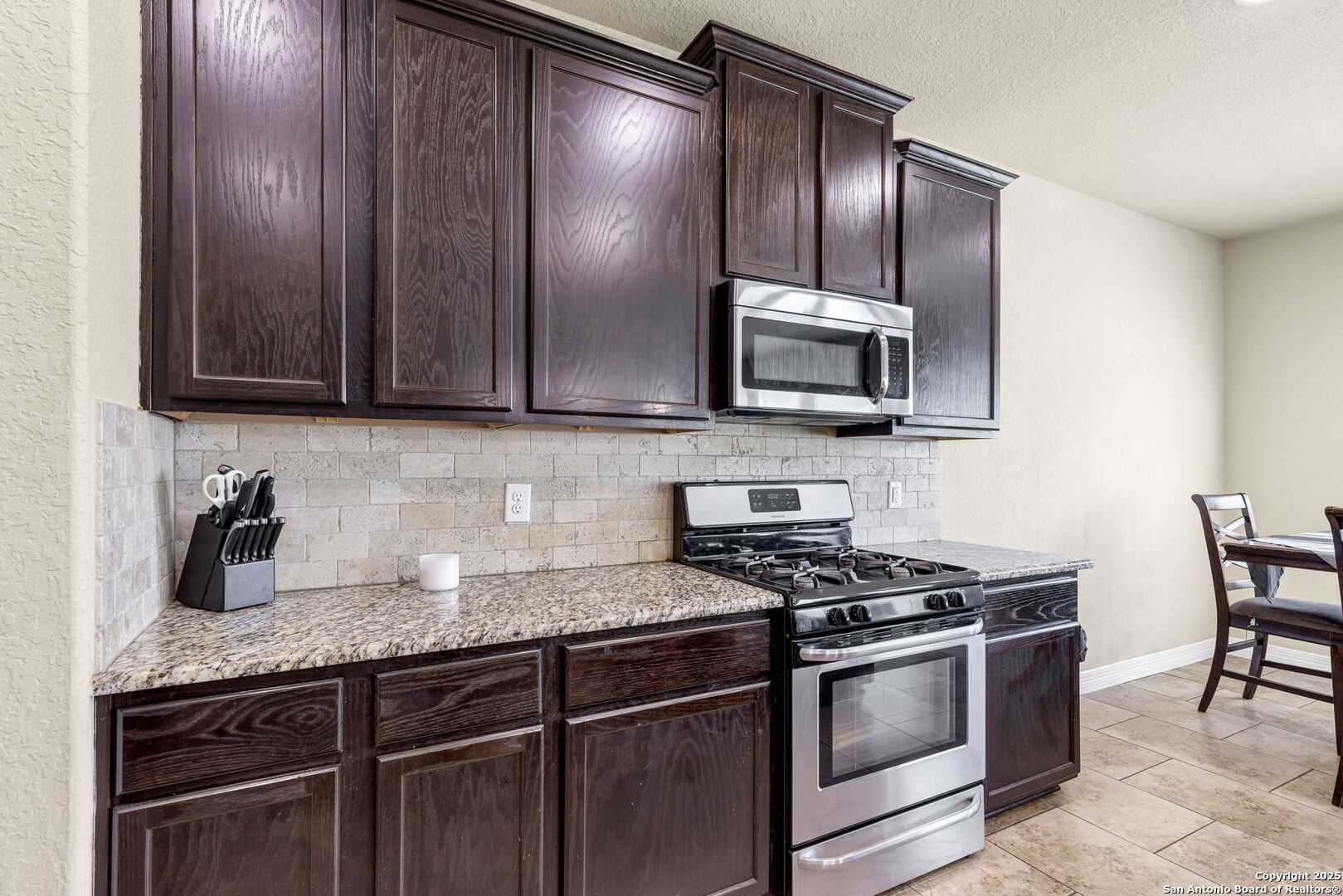 This beautiful two-story home offers great curb appeal and a thoughtfully designed open floor plan that's perfect for modern living. Step inside to high ceilings and neutral tones that create a warm, inviting atmosphere. The spacious layout includes ceramic tile flooring throughout the downstairs and in all wet areas, while plush carpet adds comfort to the upstairs loft and bedrooms. A separate formal dining room provides an elegant space for entertaining, while the open living area flows seamlessly into the breakfast nook and kitchen. The kitchen is a chef's dream, featuring stainless steel appliances, gas cooking, rich 42-inch dark cabinetry, granite countertops, and a stylish, functional design. The downstairs bedroom offers great flexibility-it can easily serve as a home office, guest room, or fitness space. Upstairs, a generously sized loft adds an extra living area perfect for relaxing or entertaining. The master suite is a true retreat with a coffered ceiling and an ensuite bath that includes a separate shower, garden tub, and dual vanity. Outside, the backyard is a blank canvas ready for your dream oasis-whether it's a sparkling pool or a lush garden retreat. This home is a perfect blend of comfort, style, and opportunity.