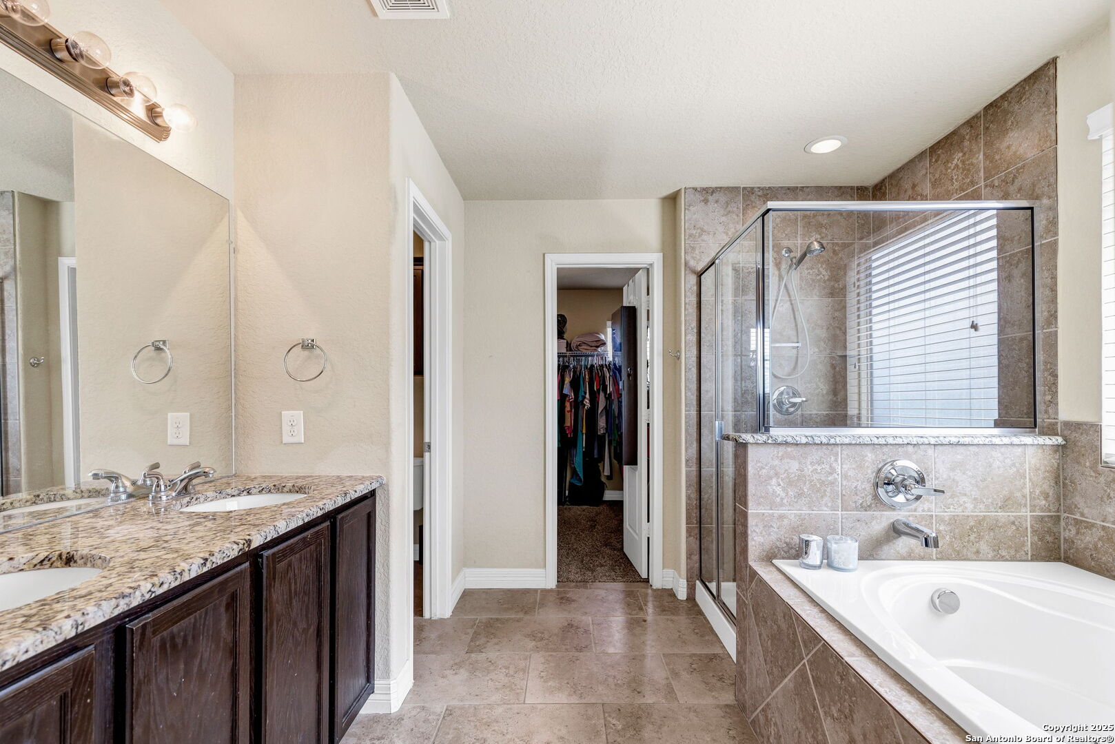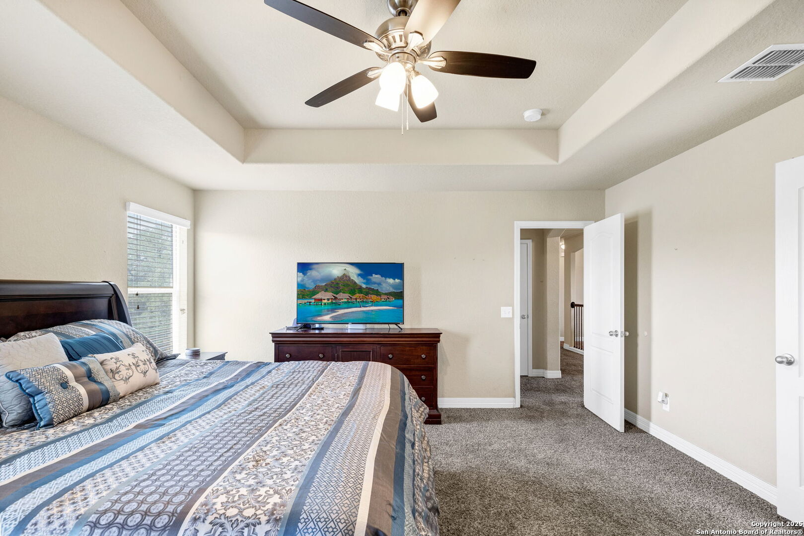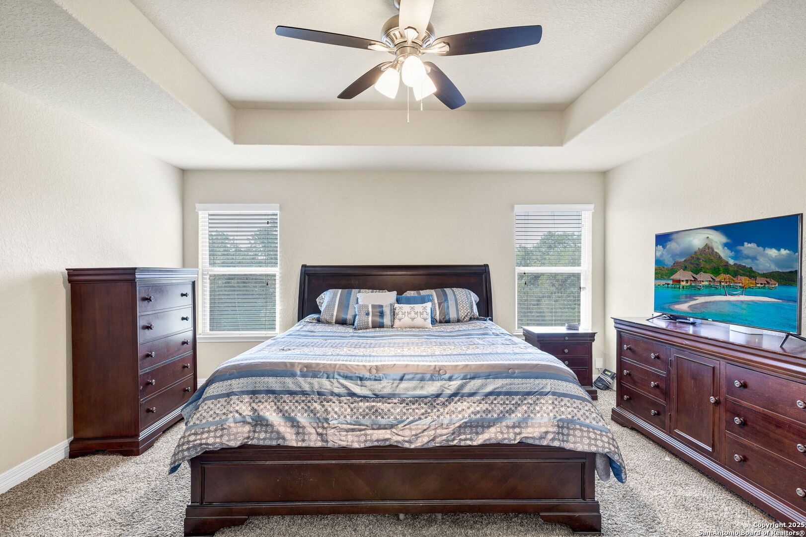 This beautiful two-story home offers great curb appeal and a thoughtfully designed open floor plan that's perfect for modern living. Step inside to high ceilings and neutral tones that create a warm, inviting atmosphere. The spacious layout includes ceramic tile flooring throughout the downstairs and in all wet areas, while plush carpet adds comfort to the upstairs loft and bedrooms. A separate formal dining room provides an elegant space for entertaining, while the open living area flows seamlessly into the breakfast nook and kitchen. The kitchen is a chef's dream, featuring stainless steel appliances, gas cooking, rich 42-inch dark cabinetry, granite countertops, and a stylish, functional design. The downstairs bedroom offers great flexibility-it can easily serve as a home office, guest room, or fitness space. Upstairs, a generously sized loft adds an extra living area perfect for relaxing or entertaining. The master suite is a true retreat with a coffered ceiling and an ensuite bath that includes a separate shower, garden tub, and dual vanity. Outside, the backyard is a blank canvas ready for your dream oasis-whether it's a sparkling pool or a lush garden retreat. This home is a perfect blend of comfort, style, and opportunity.