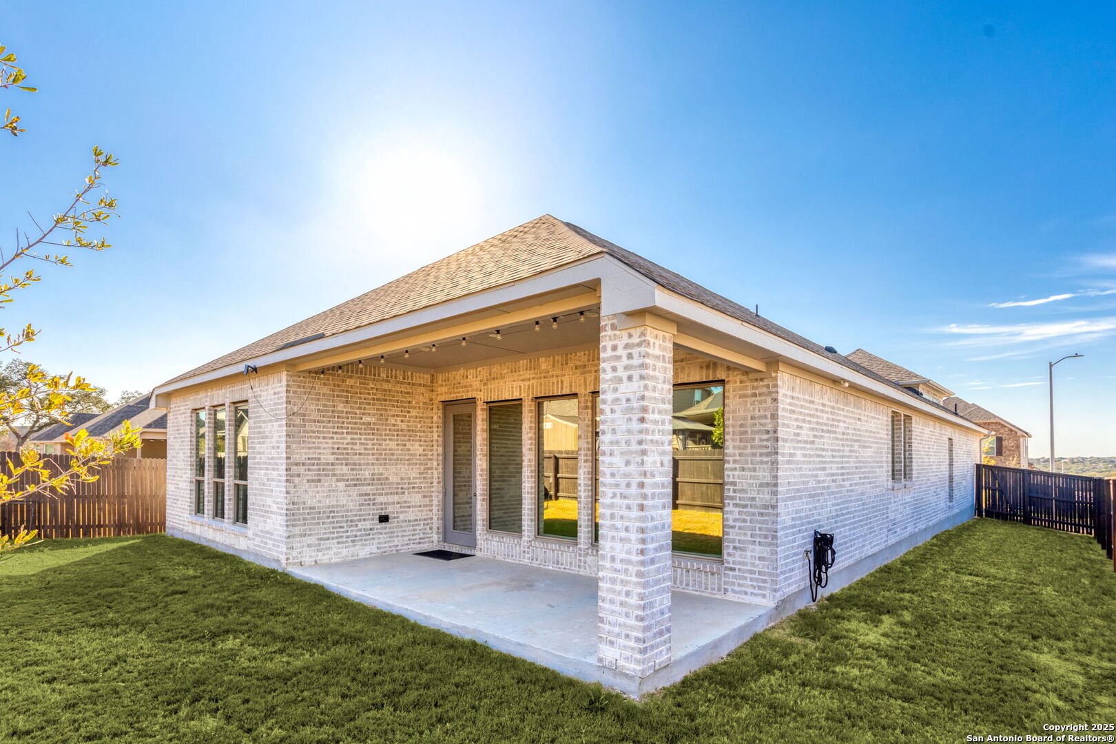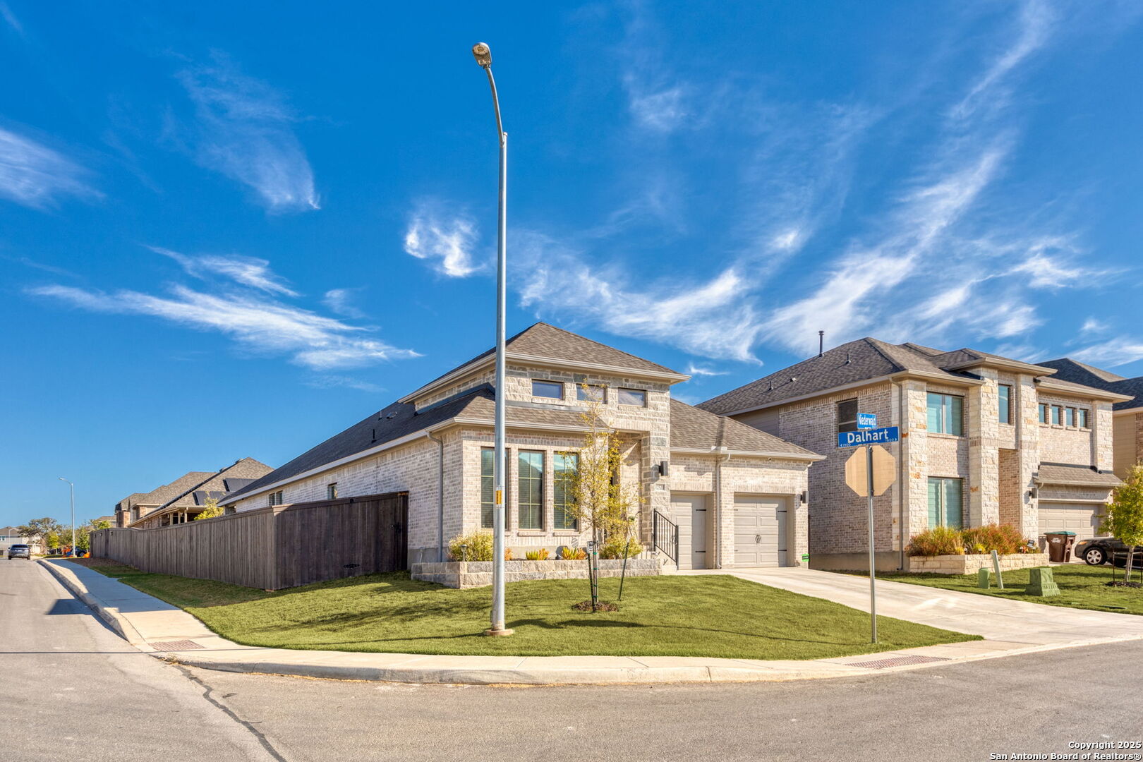 Discover your dream home nestled on a picturesque corner lot, surrounded by beautiful natural scenery. This contemporary residence features an impressive entryway with soaring 12-foot ceilings, setting the tone for a light-filled and inviting atmosphere. Enter into a stylish home office adorned with elegant French doors, perfect for remote work or study. The heart of the home, the dreamy open kitchen, boasts generous counter space, a corner walk-in pantry, and a spacious island with built-in seating-ideal for gatherings and entertaining. The dining area seamlessly flows into the open family room, bathed in natural light, and anchored by a cozy electric fireplace. Gorgeous tile flooring enhances the kitchen, living area, and bathrooms, combining beauty with durability. Retreat to the primary suite, where luxury awaits. It features dual vanities, a relaxing garden tub, a separate glass-enclosed shower, and two expansive walk-in closets in the primary bath. A guest suite with a private bath layout, offering comfort and privacy for visitors. Enter outside to your covered backyard patio, a perfect spot for morning coffee or evening relaxation. Conveniently located just 3 miles off Loop 1604, Bison Ridge community provides easy access to nearby shopping, dining, and entertainment, as well as a short drive to Joint Base San Antonio Lackland Air Force Base. Enjoy a vibrant community lifestyle with amenities that include a playground, sparkling pool, and pavilion. This home is designed to enhance your living experience-don't miss the chance to make it yours!