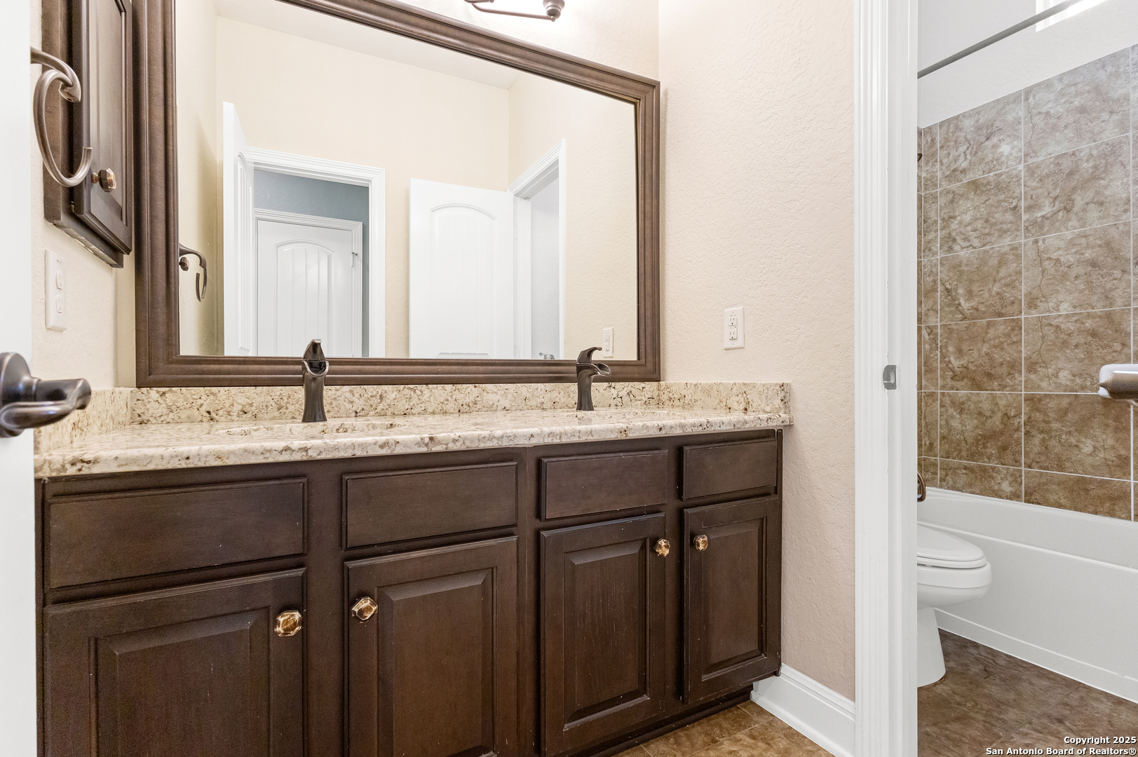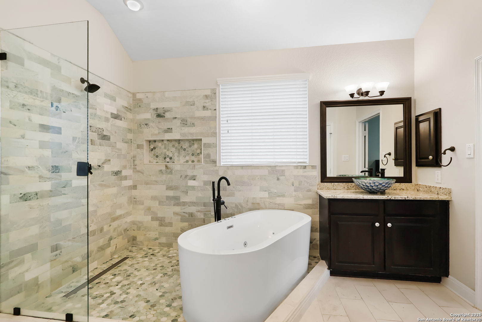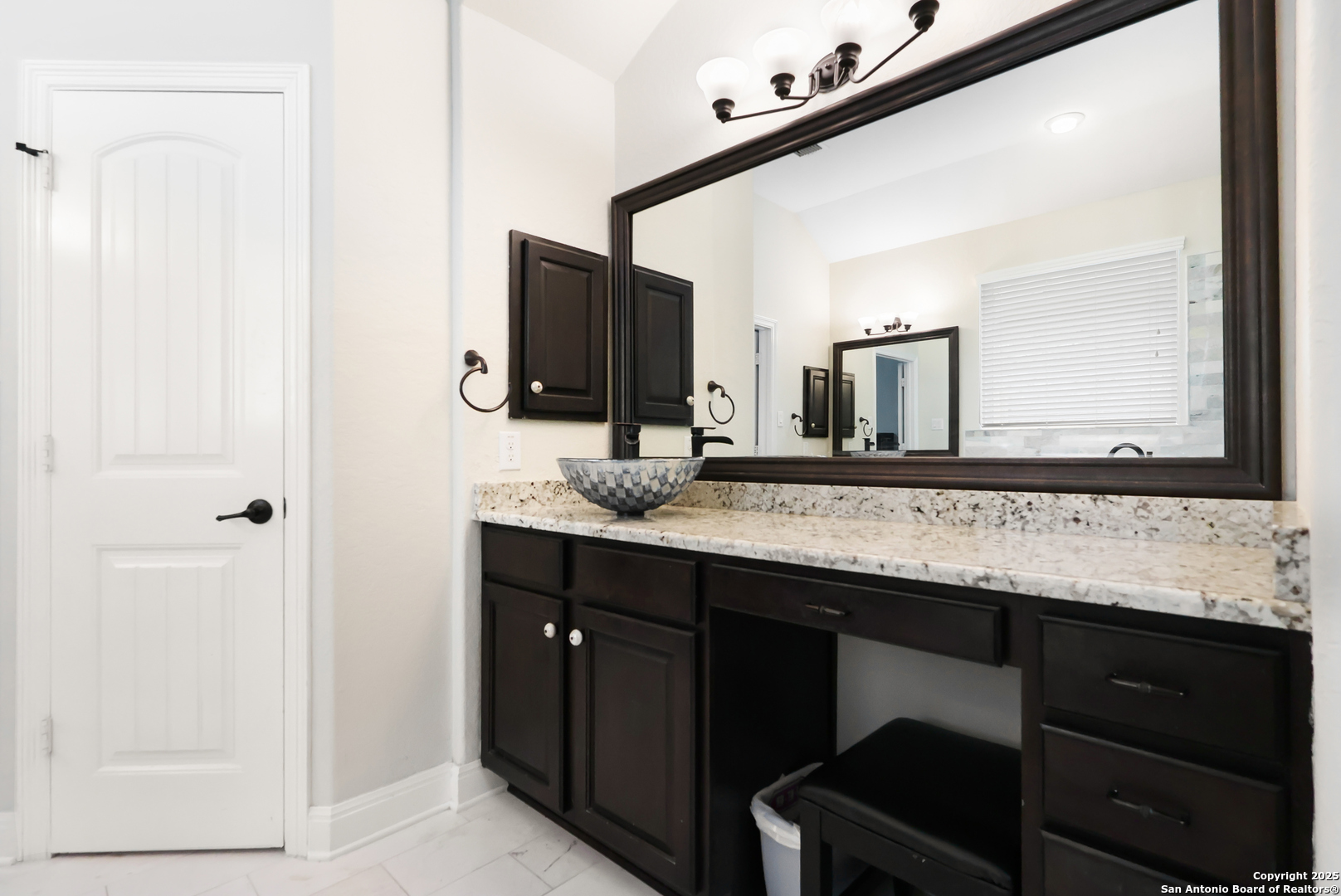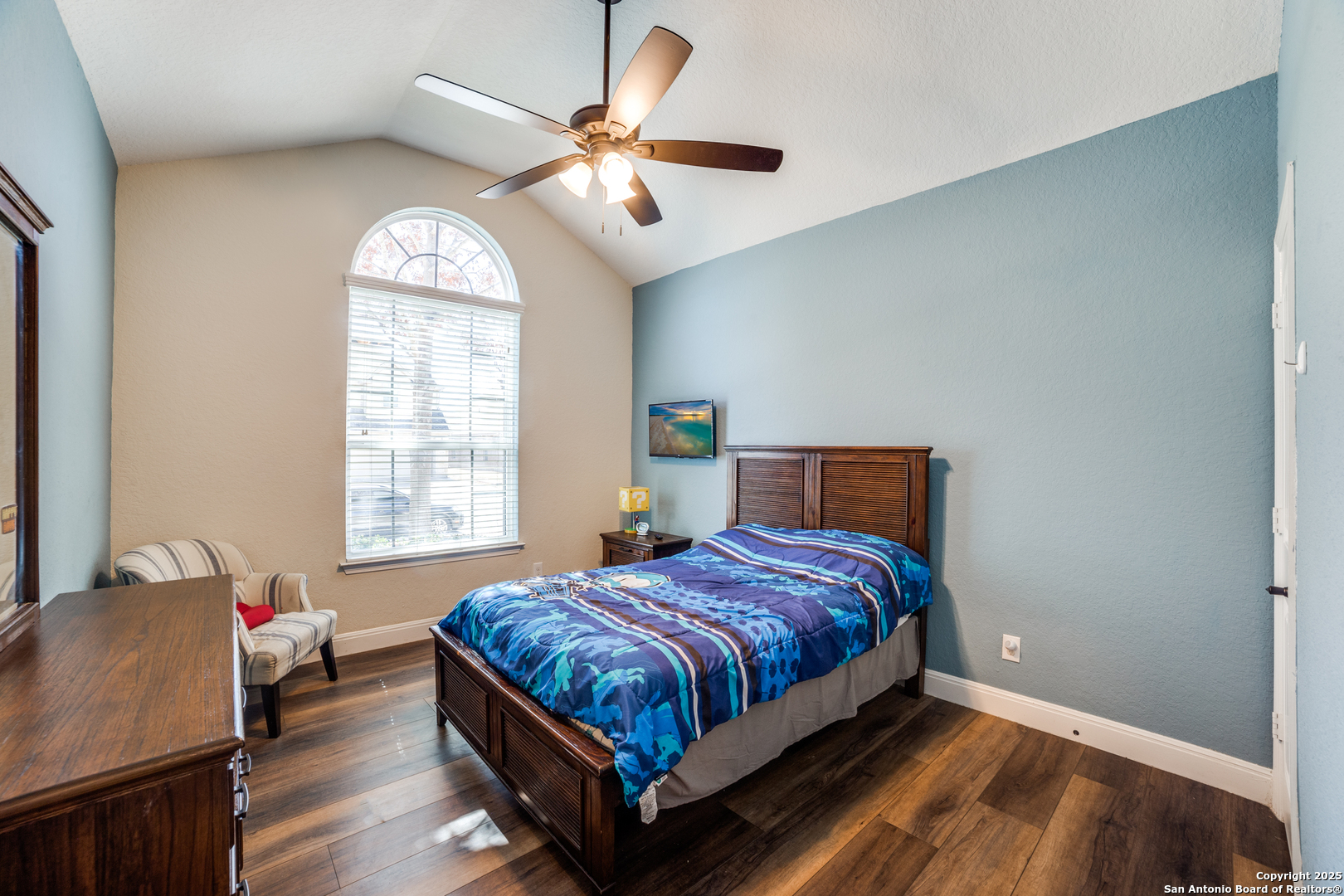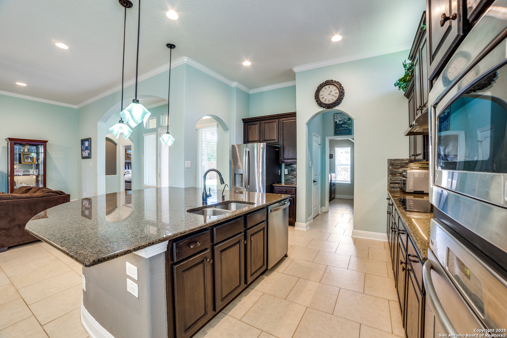 This beautifully maintained Chesmar-built, 1.5 STORY home in the sought after Alamo Ranch community is truly better than new! OWNER IS OFFERING A PAINT ALLOWANCE. Featuring a study, plus FOUR spacious bedrooms, all with walk in closets, this home offers exceptional versatility, including TWO PRIMARY SUITES one downstairs and another upstairs, which is currently used as a game room but can easily serve as a second owner's retreat! Step inside to an open floor plan with high ceilings and NO CARPETING throughout, offering both elegance and easy maintenance. A versatile French door provides access to the large COVERED patio. The GOURMET KITCHEN is a chef's dream including under counter lighting and ample storage! The home also includes a sprinkler system, gutters, water softener, and a NEW ROOF replaced just 1.5 years ago for added peace of mind. A 3 CAR GARAGE with a professionally coated floor provides ample storage, while the vibrant Alamo Ranch community offers fantastic amenities, including a pool, tennis court, basketball court, sports court, playground and BBQ pit. Conveniently located within walking distance to HEB and near Loop 1604, SeaWorld, and plenty of shopping and restaurants, this home is a must See! Don't miss out on this incredible opportunity-schedule your showing today!