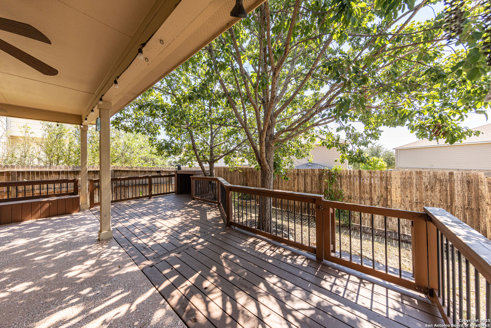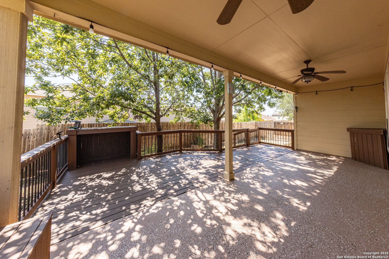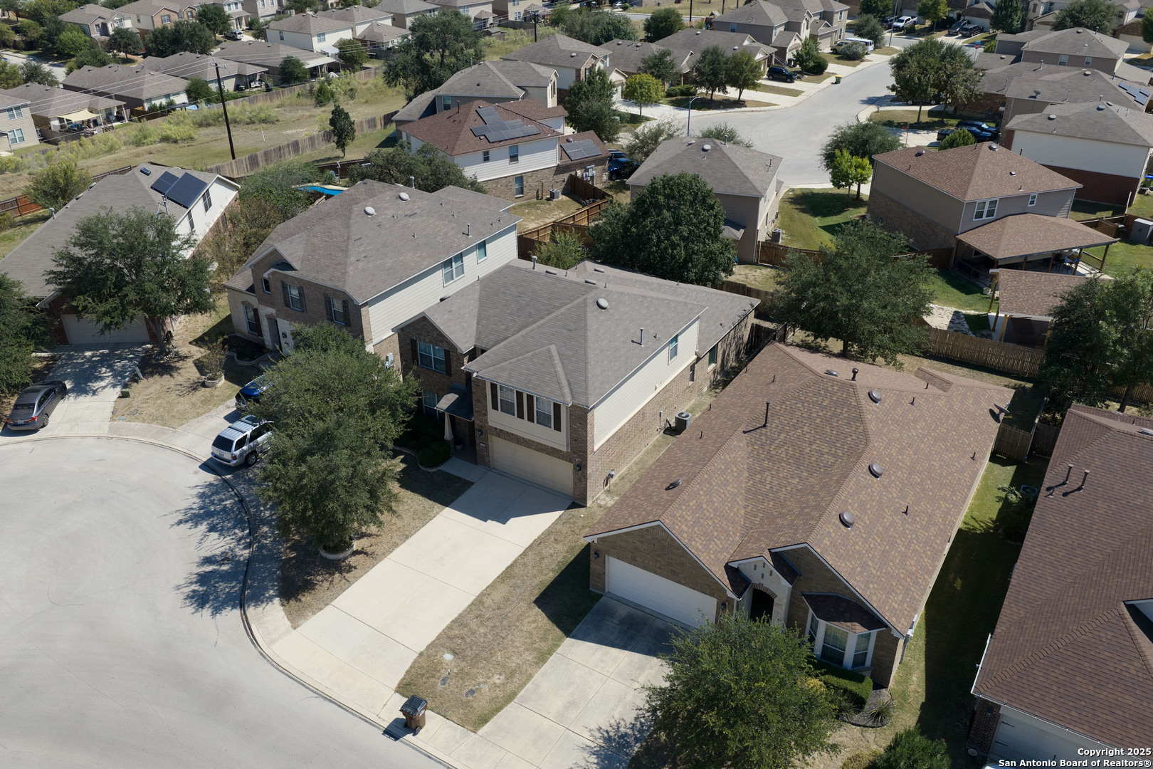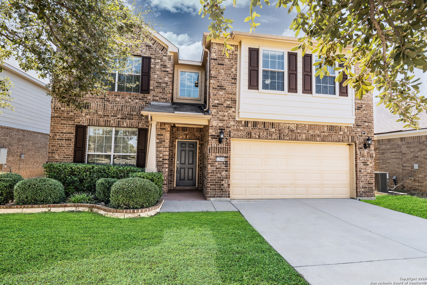 This 2,989 sq. ft. home offers a flexible floor plan with TWO bedroom suites with full bathrooms on the first floor, making the layout ideal for multi-generational living or added comfort and privacy for visiting guests. This is a spacious 5 bed, 3 bath home in Alamo Ranch with highly rated Northside ISD schools. Enjoy an open-concept living and kitchen space with tile flooring throughout and granite countertops, a large dine-in island, stainless steel appliances, GAS cooking, a large pantry and an additional breakfast nook that opens to your beautiful outdoor patio. The primary bedroom features laminate flooring for easy maintenance and is wheelchair accessible with a large shower with a low threshold and a massive walk-in closet. Additional spaces downstairs include an office nook off the kitchen, a spacious utility room with sink and extra storage and a partially finished garage with epoxy flooring, additional storage and a water softener. Upstairs, enter a large loft space ideal as an additional living space, game room or media room. 3 additional bedrooms upstairs feature plush carpet, blinds throughout and large closets for plenty of storage. You have even more storage with a large, finished section of the attic upstairs. Outside, enjoy serene outdoor living with a large, covered patio with ceiling fans, an extended deck with built-in seating and storage with a stunning mature oak tree that provides added shade and privacy. Plus, enjoy resort-like community amenities that are only a 2-minute drive away that include a pool, clubhouse, park, playground, sports courts, and trails. The home is also only minutes from shopping and dining at Alamo Ranch Marketplace and offers quick access to Loop 1604 for easy commutes to UTSA, the Medical Center, San Antonio Airport, downtown and more. An extra perk during summer nights is that you can enjoy the Six Flags fireworks in the distance right from your own home! This one-of-a-kind floor plan with two suites downstairs won't last long so be sure to schedule your tour today.