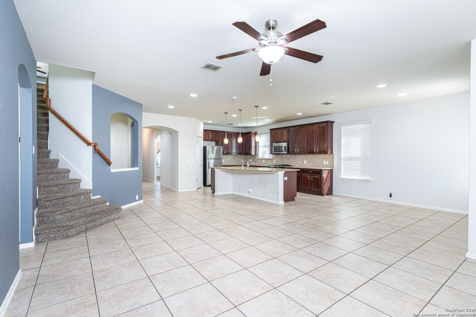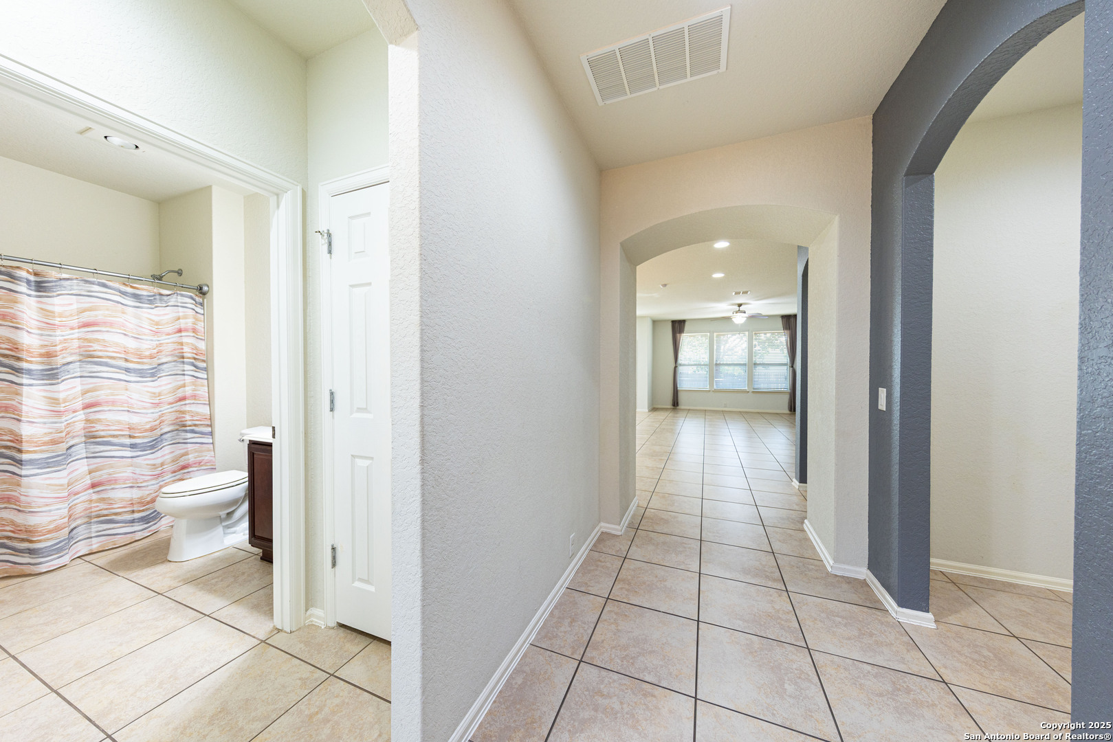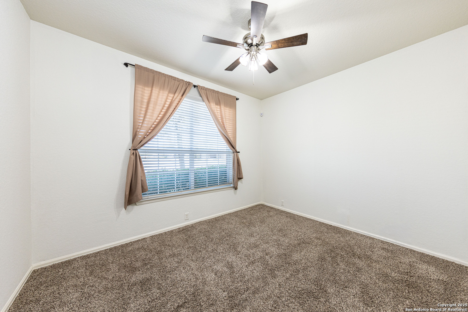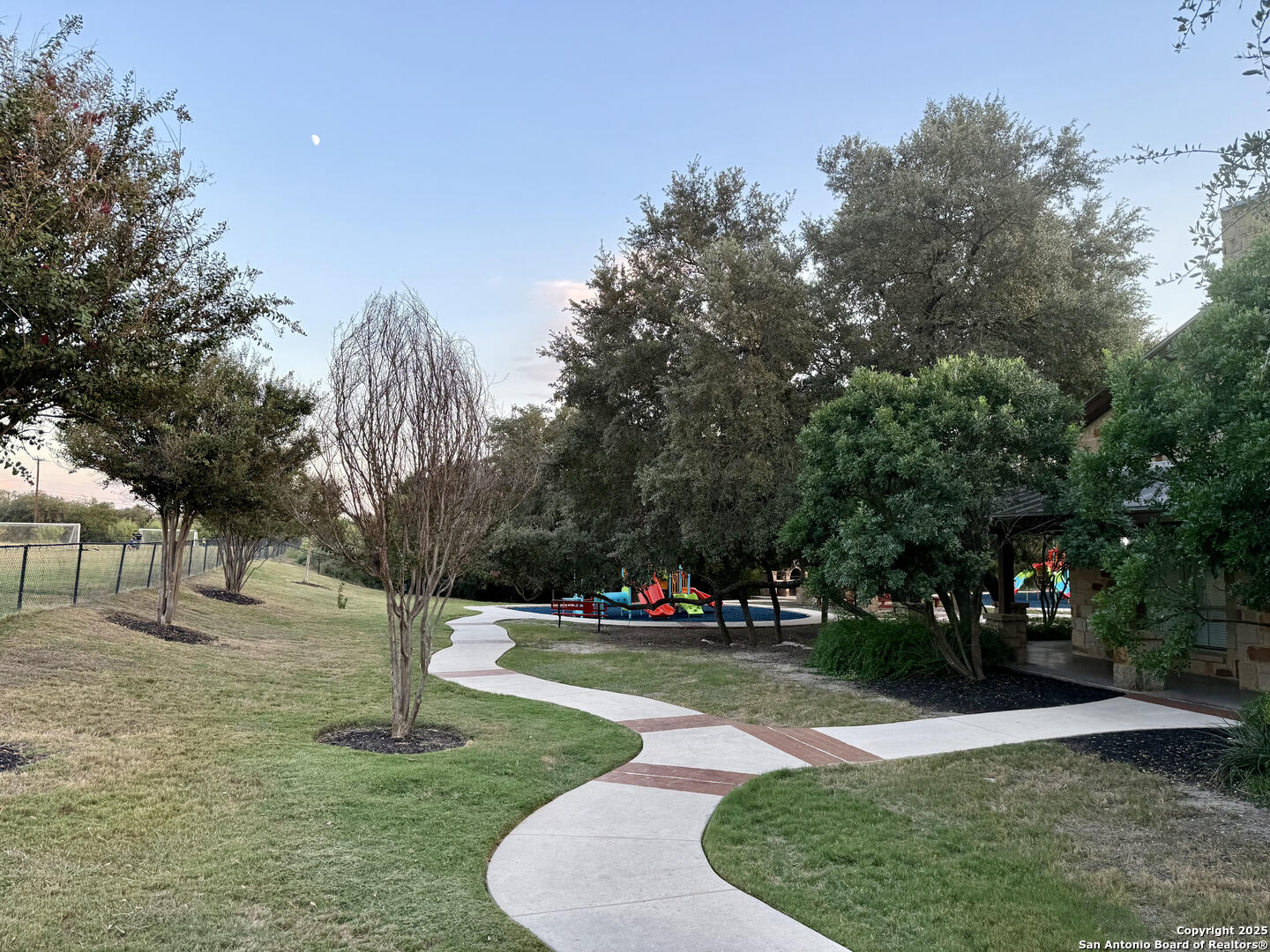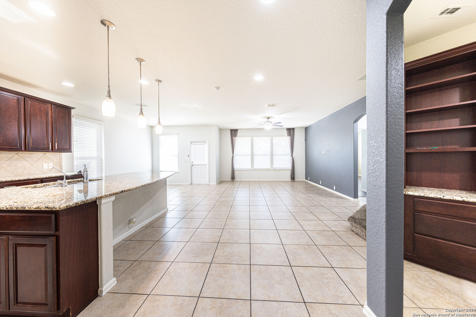 This 2,989 sq. ft. home offers a flexible floor plan with TWO bedroom suites with full bathrooms on the first floor, making the layout ideal for multi-generational living or added comfort and privacy for visiting guests. This is a spacious 5 bed, 3 bath home in Alamo Ranch with highly rated Northside ISD schools. Enjoy an open-concept living and kitchen space with tile flooring throughout and granite countertops, a large dine-in island, stainless steel appliances, GAS cooking, a large pantry and an additional breakfast nook that opens to your beautiful outdoor patio. The primary bedroom features laminate flooring for easy maintenance and is wheelchair accessible with a large shower with a low threshold and a massive walk-in closet. Additional spaces downstairs include an office nook off the kitchen, a spacious utility room with sink and extra storage and a partially finished garage with epoxy flooring, additional storage and a water softener. Upstairs, enter a large loft space ideal as an additional living space, game room or media room. 3 additional bedrooms upstairs feature plush carpet, blinds throughout and large closets for plenty of storage. You have even more storage with a large, finished section of the attic upstairs. Outside, enjoy serene outdoor living with a large, covered patio with ceiling fans, an extended deck with built-in seating and storage with a stunning mature oak tree that provides added shade and privacy. Plus, enjoy resort-like community amenities that are only a 2-minute drive away that include a pool, clubhouse, park, playground, sports courts, and trails. The home is also only minutes from shopping and dining at Alamo Ranch Marketplace and offers quick access to Loop 1604 for easy commutes to UTSA, the Medical Center, San Antonio Airport, downtown and more. An extra perk during summer nights is that you can enjoy the Six Flags fireworks in the distance right from your own home! This one-of-a-kind floor plan with two suites downstairs won't last long so be sure to schedule your tour today.