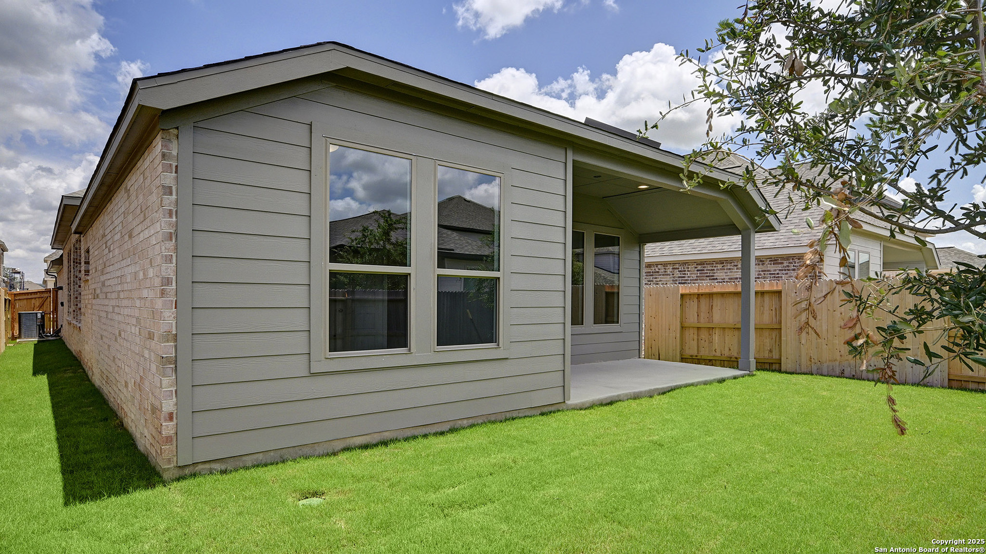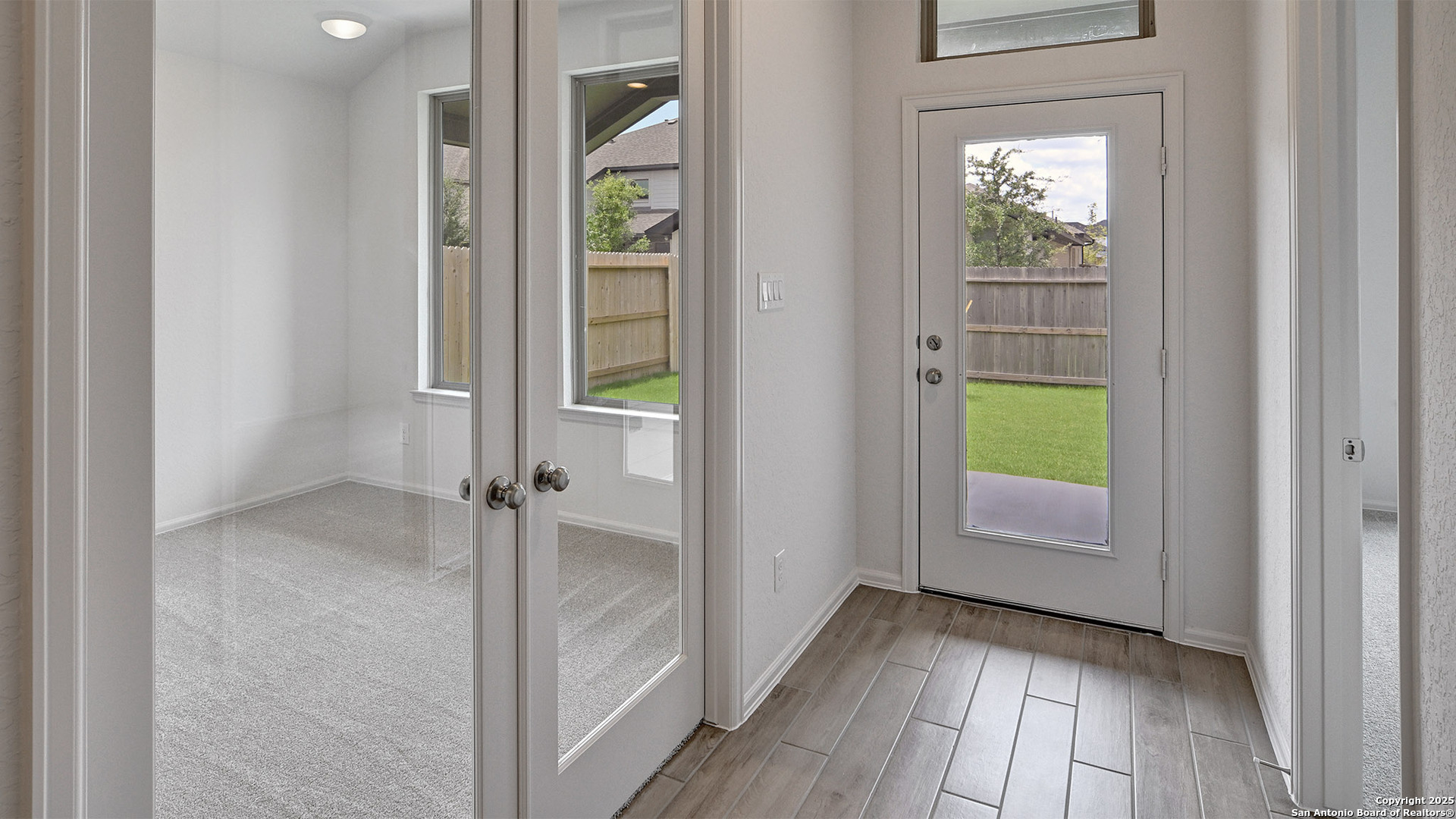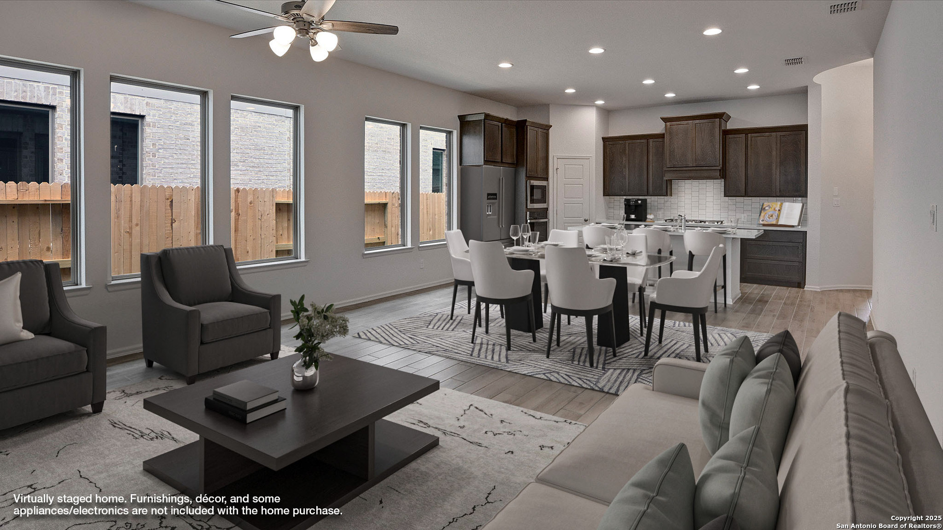 Entry with 11-foot rotunda ceiling leads to open kitchen, dining area and family room. Kitchen features corner walk-in pantry, 5-burner gas cooktop and generous island with built-in seating space. Primary suite includes double-door entry to primary bath with dual vanities, separate glass-enclosed shower and large walk-in closet. Home office with French doors set at back entrance. Large windows, extra closets and mud room add to this spacious three-bedroom home. Covered backyard patio. Two-car garage.